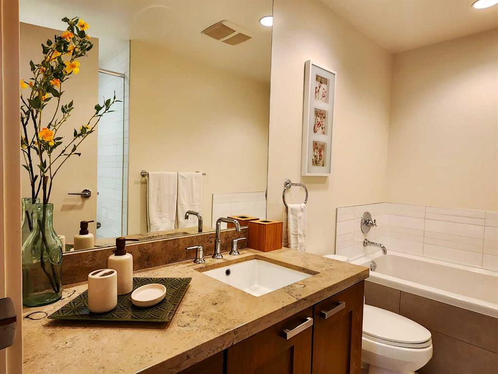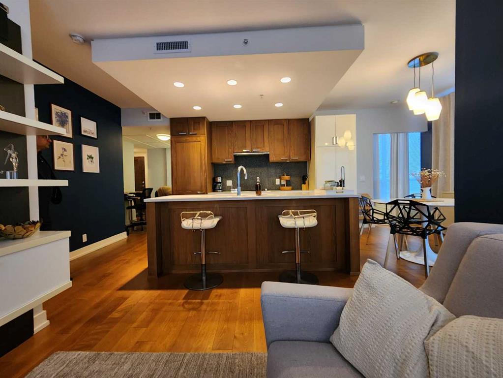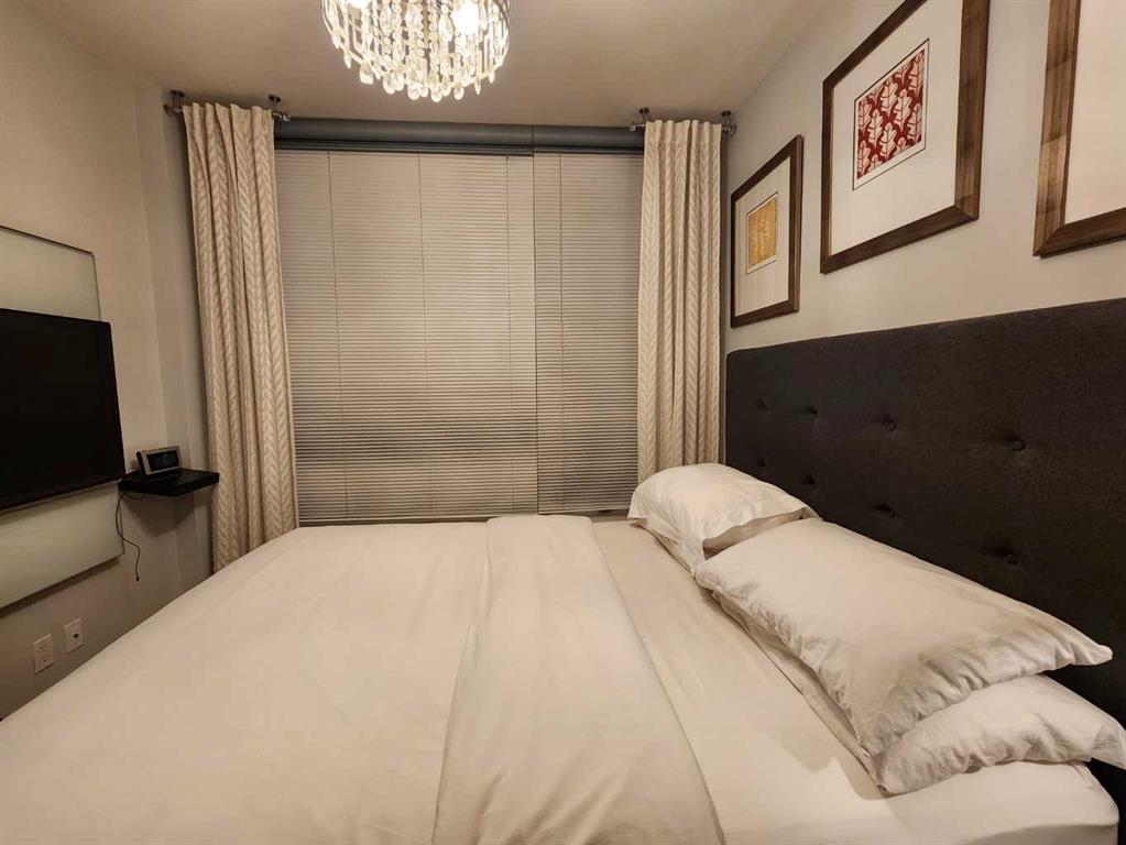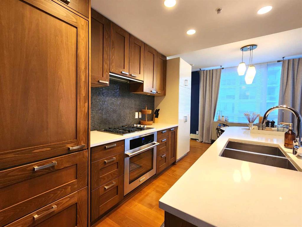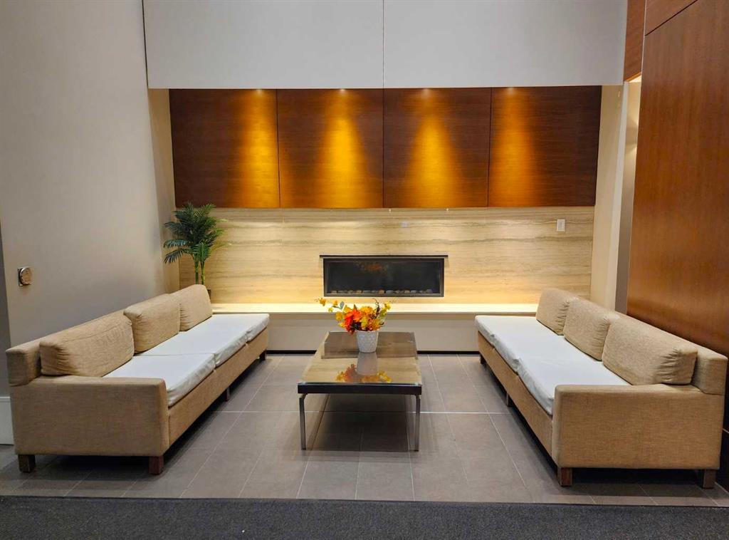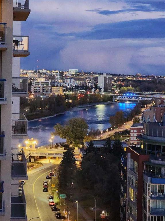 Be Home for a Luxury Christmas! This beautiful and luxurious 17th floor, 2 bedroom and 2 bath in a concrete building, will take your breath away. Flooded with beautiful light, this south east corner unit, has amazing city and river views. Very open plan with gourmet kitchen, with gas stove, quart counters, large eating bar. South facing living room with gas fireplace. Master bedroom has a spa style suite, and duel closets. Second bedroom has a built-in murphy bed and is well located, for privacy making it ideal for a roommate. Underground parking and storage locker are included. Building amenities include a fitness center (weight, cardio equipment and jacuzzi tub), social room, theatre, and of a concierge desk. Lots of visitor parking for friends and family. Prime Eau Claire location steps for coffee shops, restaurants, shopping, river walkways, bike paths, restaurants, downtown nightlife, and transit. Immediate possession. Furniture negotiable. Book your private showing today and take advantage of the renovation special pricing.