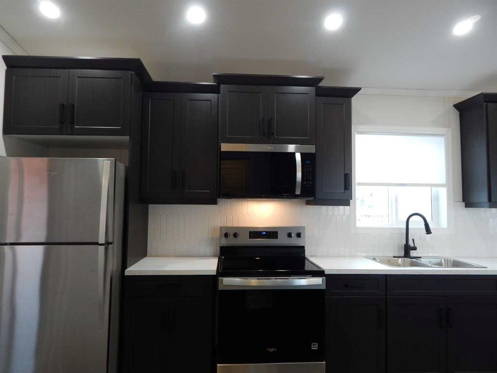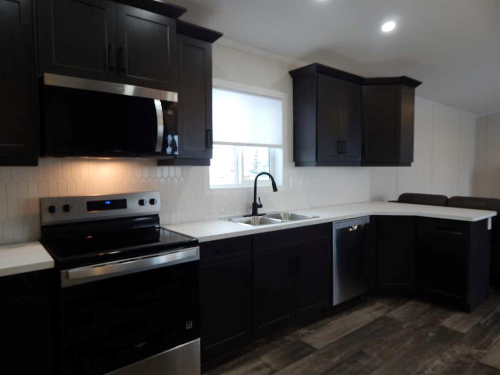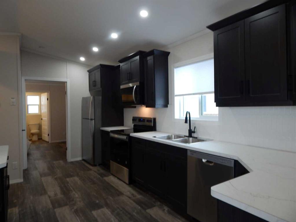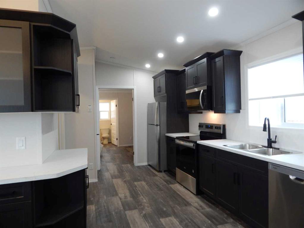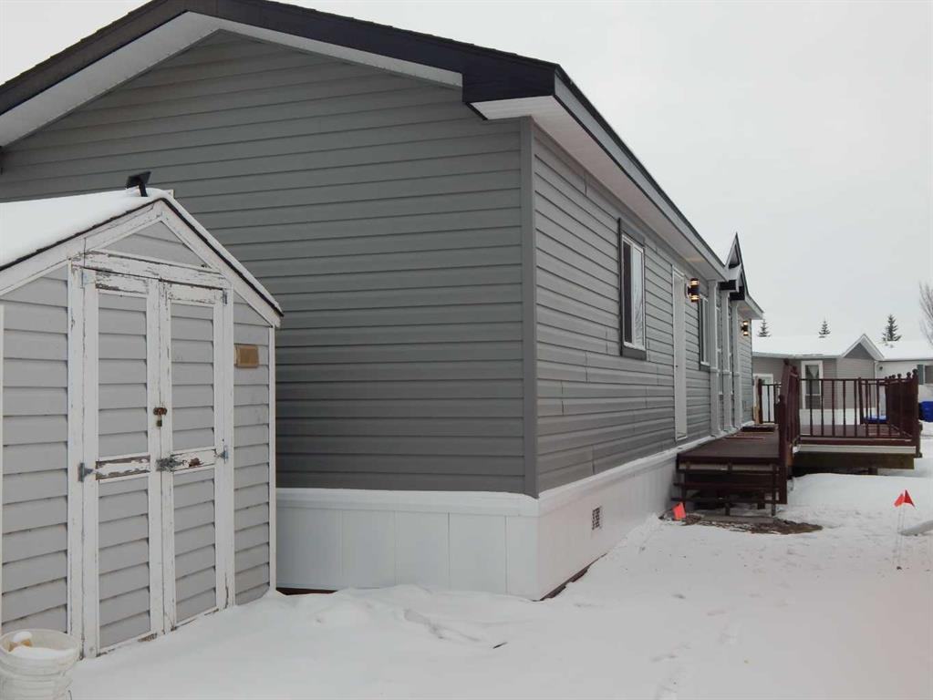 Wow! This is rare opportunity to own a NEW home in the Silverlynx adult living community. Beautiful Moduline Homes Mansura model recently was placed at it's new address of #11 5210 65 Avenue Olds. Plan to be impressed with the modern warm tones and lay out of this 2 bedroom home. The dining area and kitchen blend seamlessly with the living room making visiting easy and provides for an ideal flow. The chef of the house is sure to enjoy their brand new kitchen that is thoughtfully laid out and filled with plenty of cabinets, counter space, stainless appliances and pantry. Many windows thru-out allow for the natural light to stream in. The spacious primary bedroom with walk-in closet and a 3 pce ensuite boasting lots of cabinets, countertops and a stand alone shower stall with 2 seats. The 2nd bedroom is also well set up with a double closet and is located at the opposite end of the primary bedroom providing plenty of privacy. Conveniently set beside the second bedroom is a 4 pce bathroom. Lastly the laundry pair is found nestled in the utility room where you will find the hotwater tank and furnace as well as the back door. Outside is an oversized deck, a larger storage shed and parking pad for 2 vehicles. Conveniently located close to shopping, eateries, walking paths and numerous other amenities. Park Approval is a requirement of this park. It is a 55+ community with pet restrictions and they must be approved by Park Management. This is a modular home on a leased lot, current lot rent is $617.00/mo and 2025 taxes are $1,035.00.