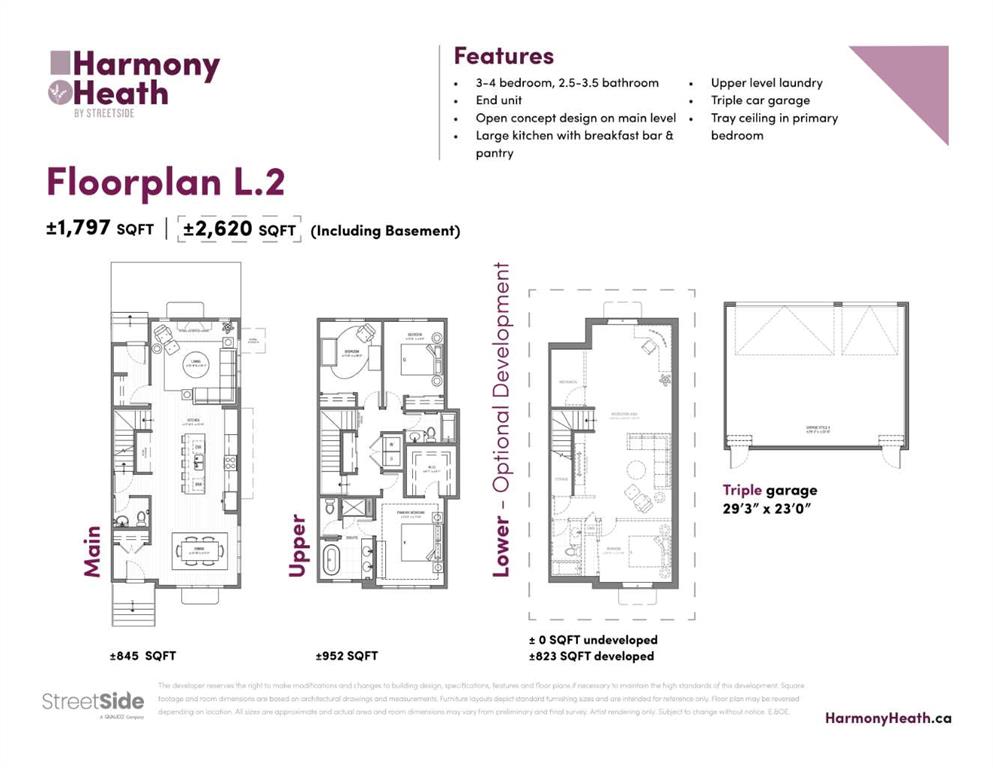 Welcome to 1125 Sailfin Heath — Streetside’s Dreamiest Opportunity! This stunning 1,797 sq ft home, featuring a triple-car garage, sits on one of the most coveted lots in the development. This large 76-foot-wide private side yard stretches 130 feet deep, offering endless opportunities to create the outdoor haven you’ve been dreaming of. Whether it’s a gourmet outdoor kitchen, a serene pool, jungle gym for the kids, a workshop or a combination of it all - this space is ready to bring your dreams to life! Nestled in the heart of Harmony (An eight-time “Community of the Year” award winner), home offers more than just incredible design; it’s a gateway to an extraordinary lifestyle. Enjoy exclusive perks at Mickelson National Golf Club, practice your swing at the Launch Pad’s interactive driving range, unwind at the beach, or paddle across the stunning 40-acre lake. The community offers something for every pace of life, from fly fishing and community gardening to 17kms of paved pathways, a skate park, or beach volleyball! And there’s even more on the horizon. Harmony will soon welcome: a second 100-acre lake, Phase 2 of the Adventure Park (hello tennis/pickle ball courts!), and the highly anticipated village core filled with boutique shops, restaurants, salons, galleries, and even a Nordic Spa! But if you’re craving a change of scenery, the Rocky Mountains are just a short 45-minute drive away. Inside, this 3-bedroom, 2.5-bathroom home is designed to impress. With 8’ and 9’ knockdown ceilings, triple-pane windows, and a durable Hardie board exterior, this home combines comfort and efficiency. Luxury vinyl plank flooring is featured throughout the upper two levels, while the gourmet kitchen boasts Bosch appliances, a stylish wine bar, and elegant finishes. The open-concept living area includes a cozy gas fireplace with ribbed tile detailing, creating a warm and inviting space. Upstairs, the primary suite boasts a spa-like 5-piece ensuite with a freestanding tub, and the upper-floor laundry room is thoughtfully designed for convenience and function. Please come to our brand new Show Home at 1176 Sailfin Heath to view a similar home and learn more about this incredible lot and home. Estimated possession is between January and July 2026—don’t miss your chance to own a truly exceptional home in one of Alberta’s most celebrated communities. Please inquire today regarding all available promotions from the builder.