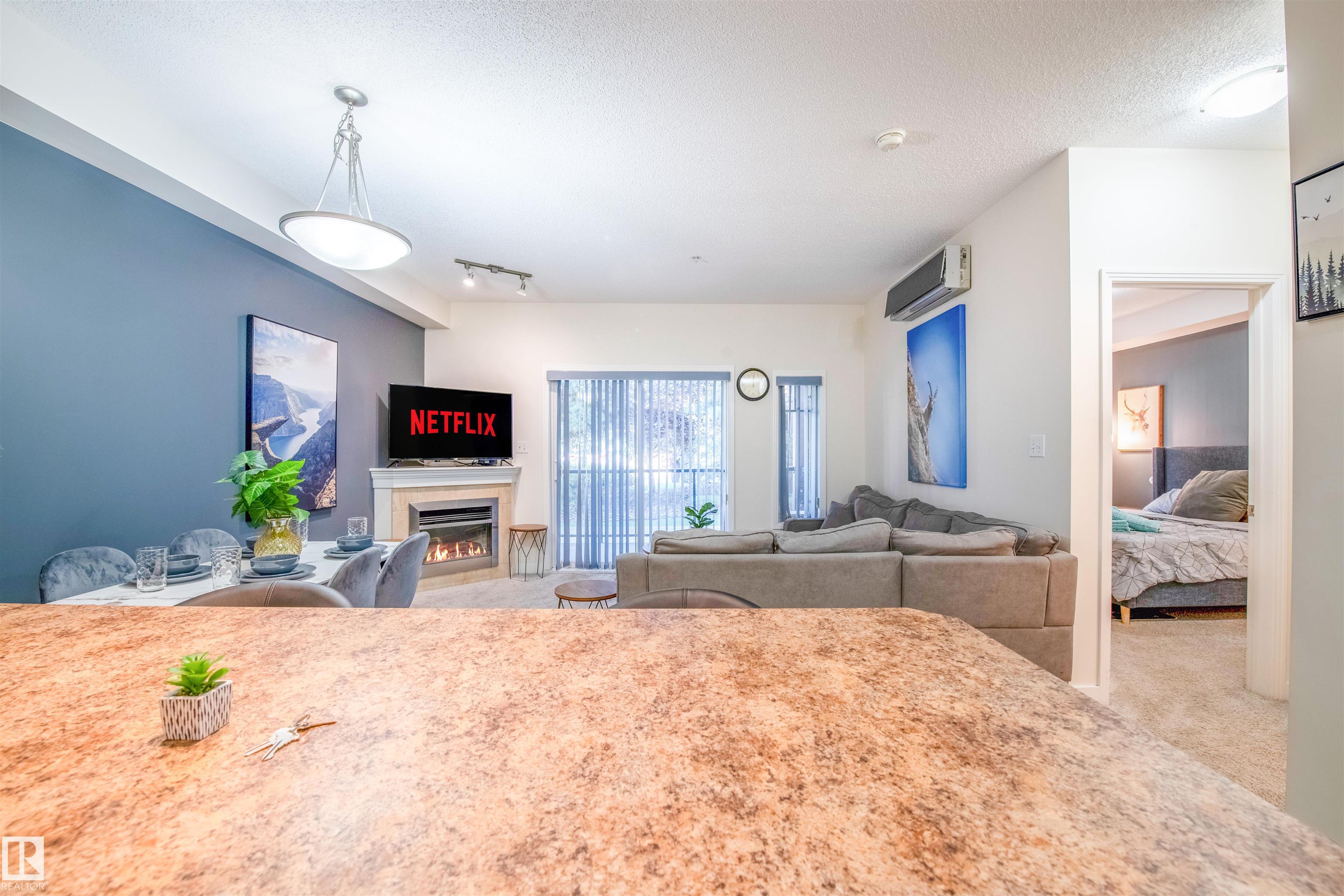 Welcome to the Californian Parkland in Glastonbury! Step into this stylish and spacious main-floor condo offering the perfect mix of comfort, convenience, and modern design. Featuring an open-concept layout with luxury vinyl plank flooring, a refreshed kitchen with stainless steel appliances, and a generous island perfect for entertaining. The cozy living area is anchored by a gas fireplace and extends to your private patio — ideal for relaxing or enjoying morning coffee. The large primary suite includes a walk-through closet with direct access to the full bath, and the in-suite laundry adds everyday ease. Heated underground parking, car wash bay, and an excellent building with guest suite, exercise room, and social lounge. Fantastic West End location close to shopping, restaurants, parks, and the Anthony Henday. Move-in ready and available furnished or unfurnished — welcome home!