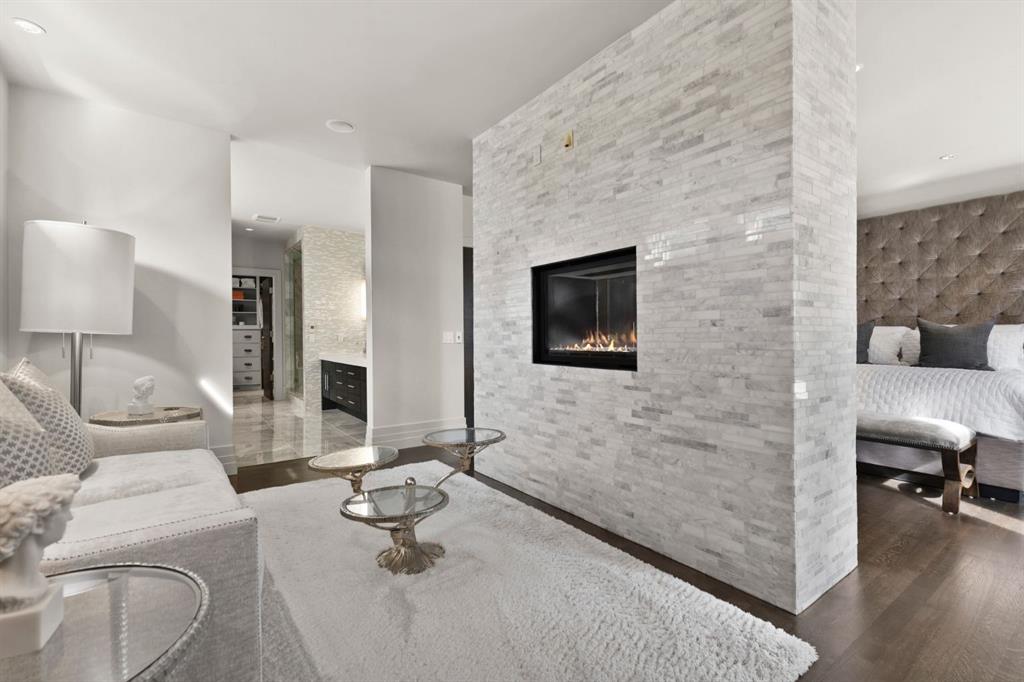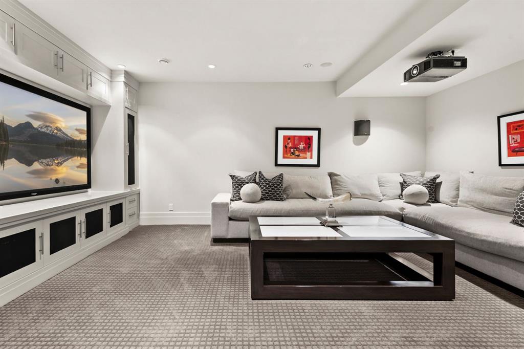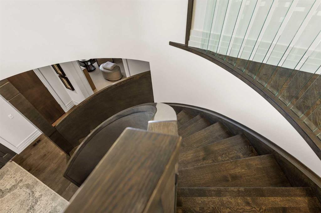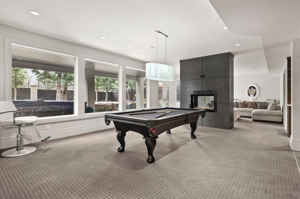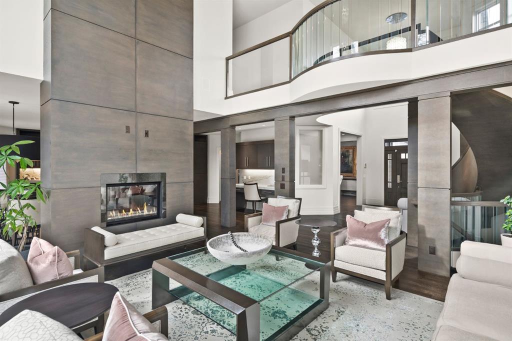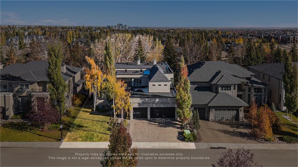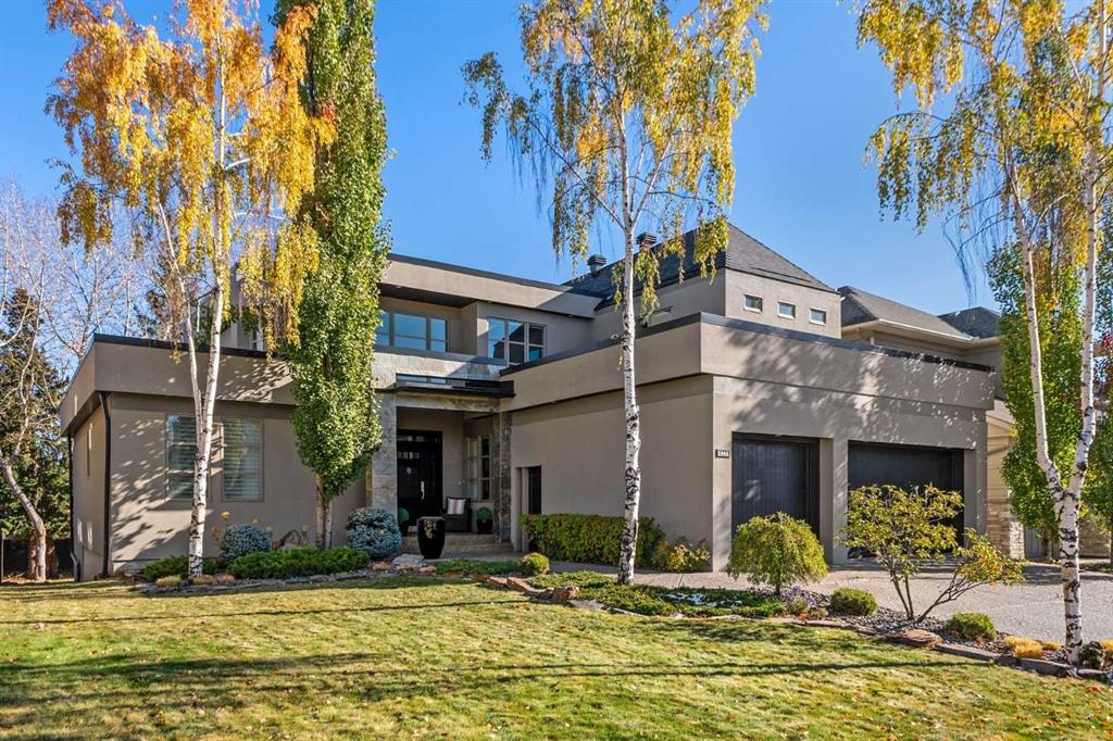 Set in the prestigious community of Aspen Estates, this custom-designed residence makes a striking architectural statement both inside and out, offering over 6,106 sq.ft. of meticulously developed living space and an expansive main level far larger than a traditional two-storey home. The moment you step inside, the soaring 19-ft foyer and living room—with dramatic double-height windows—creates an unforgettable sense of volume, light, and spatial drama, revealing the home’s strong architectural bones and meticulous detailing. Throughout the interior, rift-cut oak serves as a unifying design element, its refined linear grain expressed in both the extensive custom millwork and the sculptural floating staircase, lending a quiet, contemporary elegance that reinforces the home’s architectural coherence. Additional refined materials include recently refinished hardwood flooring, two-inch solid quartzite stone counters, three double-sided floor-to-ceiling fireplaces, heated floors throughout the bathrooms, lower level, and garage, solid core doors, and custom lighting and window coverings. The chef-inspired kitchen is both beautiful and functional, centered around a massive tiered quartzite island and outfitted with Sub-Zero and Viking appliances and an expansive butler’s pantry, complemented by a formal dining room, a private office with built-ins, and a generously sized bedroom with full bathroom on this level. Above the open-to-below living area, an architectural catwalk floats through the space, leading to the bedroom wing where the serene primary suite offers extensive built-ins, a large walk-in closet, a marble floor-to-ceiling surround two-way fireplace, a peaceful sitting area, and a spa-inspired ensuite with heated floors, soaker tub, and steam shower, along with two additional bedrooms each with their own ensuite and walk-in closet. The lower level is designed for indulgent relaxation and entertaining, featuring a spacious recreation area, wet bar, theatre room, dedicated fitness room, a fifth bedroom, and a luxurious bathroom with steam shower, all kept perfectly comfortable year-round with in-floor heating and dual A/C units. Outside, the private, tree-lined backyard feels like a secluded retreat, offering upper and lower decks, expansive irrigated greenspace, and exceptional privacy. With Rundle College, the C-Train, Aspen Landing, and Westside Recreation Centre all within walking distance—and Webber Academy, Calgary Academy, and CFIS just minutes away—this home offers a rare blend of architectural beauty, lifestyle convenience, and effortless access to both downtown and the mountains. Make sure you don't miss the video of this amazing property!
