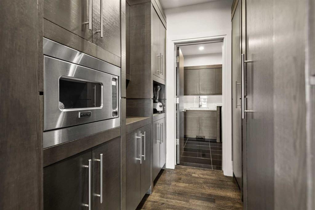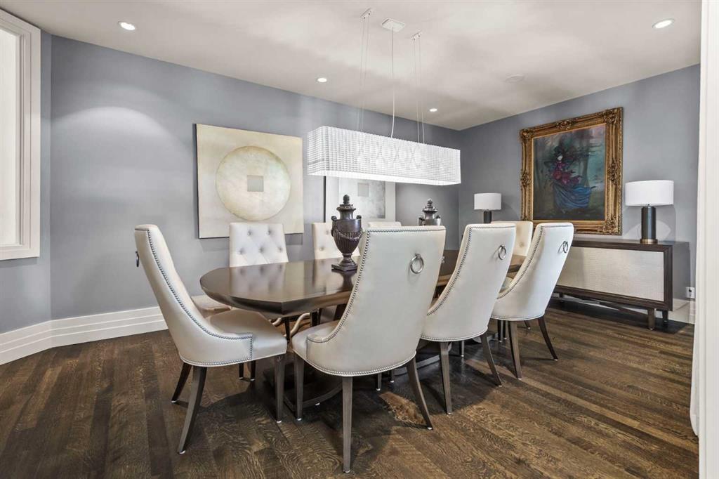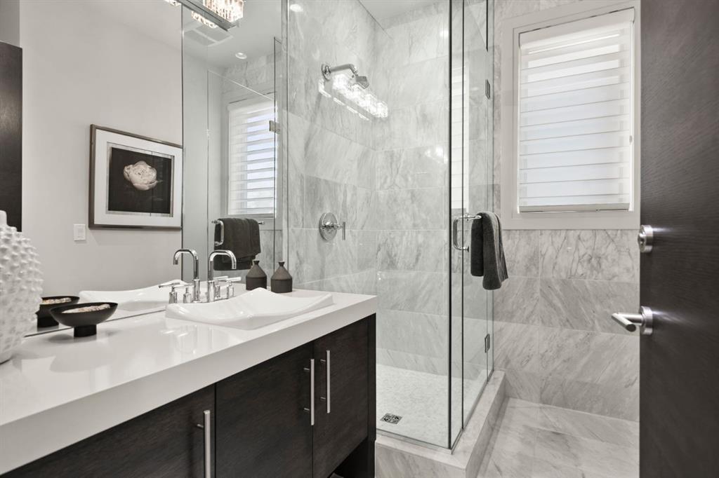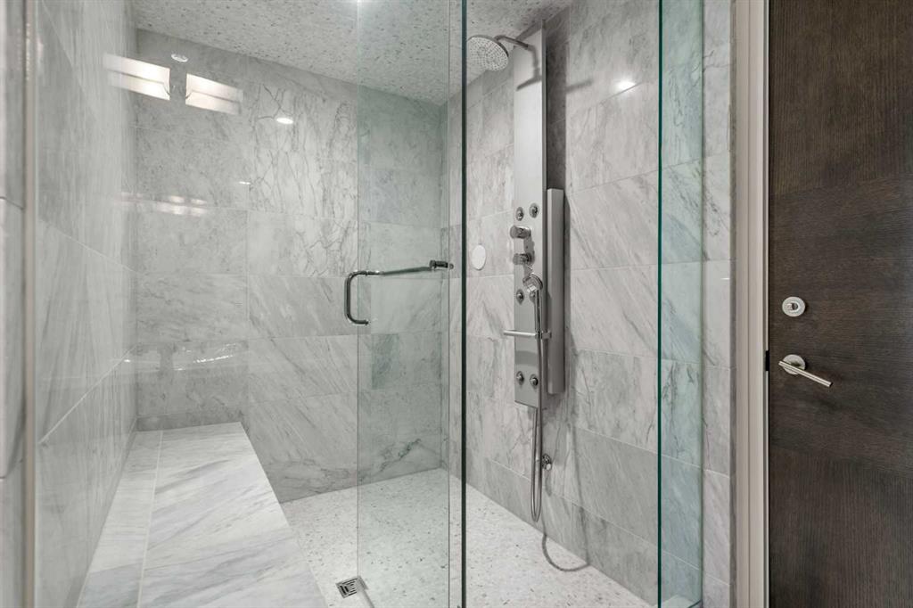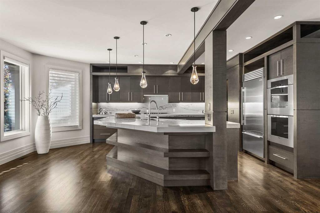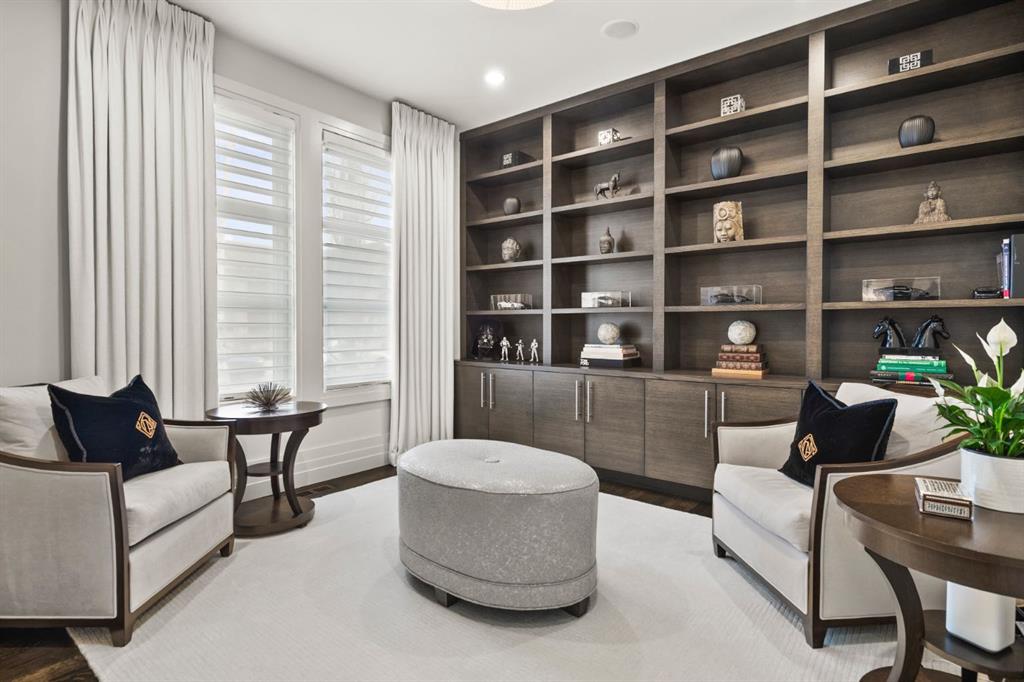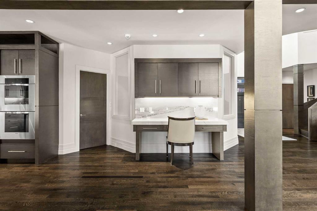Set in the prestigious community of Aspen Estates, this custom-designed residence makes a striking architectural statement both inside and out, offering over 6,106 sq.ft. of meticulously developed living space and an expansive main level far larger than a traditional two-storey home. The moment you step inside, the soaring 19-ft foyer and living room—with dramatic double-height windows—creates an unforgettable sense of volume, light, and spatial drama, revealing the home’s strong architectural bones and meticulous detailing. Throughout the interior, rift-cut oak serves as a unifying design element, its refined linear grain expressed in both the extensive custom millwork and the sculptural floating staircase, lending a quiet, contemporary elegance that reinforces the home’s architectural coherence. Additional refined materials include recently refinished hardwood flooring, two-inch solid quartzite stone counters, three double-sided floor-to-ceiling fireplaces, heated floors throughout the bathrooms, lower level, and garage, solid core doors, and custom lighting and window coverings. The chef-inspired kitchen is both beautiful and functional, centered around a massive tiered quartzite island and outfitted with Sub-Zero and Viking appliances and an expansive butler’s pantry, complemented by a formal dining room, a private office with built-ins, and a generously sized bedroom with full bathroom on this level. Above the open-to-below living area, an architectural catwalk floats through the space, leading to the bedroom wing where the serene primary suite offers extensive built-ins, a large walk-in closet, a marble floor-to-ceiling surround two-way fireplace, a peaceful sitting area, and a spa-inspired ensuite with heated floors, soaker tub, and steam shower, along with two additional bedrooms each with their own ensuite and walk-in closet. The lower level is designed for indulgent relaxation and entertaining, featuring a spacious recreation area, wet bar, theatre room, dedicated fitness room, a fifth bedroom, and a luxurious bathroom with steam shower, all kept perfectly comfortable year-round with in-floor heating and dual A/C units. Outside, the private, tree-lined backyard feels like a secluded retreat, offering upper and lower decks, expansive irrigated greenspace, and exceptional privacy. With Rundle College, the C-Train, Aspen Landing, and Westside Recreation Centre all within walking distance—and Webber Academy, Calgary Academy, and CFIS just minutes away—this home offers a rare blend of architectural beauty, lifestyle convenience, and effortless access to both downtown and the mountains. Make sure you don't miss the video of this amazing property!