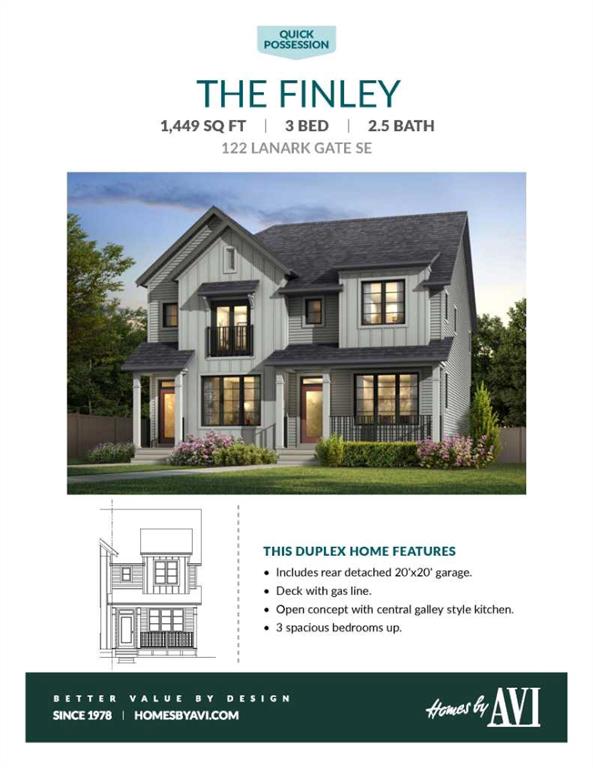 A FULL-WIDTH FRONT PORCH ISN’T JUST AN ENTRY—IT’S AN ANNOUNCEMENT. Wide, welcoming, and instantly part of your daily rhythm, it sets up the kind of main floor that feels unexpectedly open the moment you step inside. Warm white cabinetry, classic quartz countertops, and rich LVP flooring give the space a grounded, design-forward feel, and the 9’ ceiling height makes everything breathe a little easier. The kitchen earns its place as the anchor of the home: 42" UPPERS for real storage, a CHIMNEY HOOD FAN, BUILT-IN MICROWAVE, double-door fridge, and an ISLAND WITH A BREAKFAST BAR that actually works for real weekday life. Light moves from the living room straight through to the dining area and rear entry, where the rear deck extends the plan outward without complicating it. Upstairs, the master bedroom stays refreshingly simple in the best way—a WINDOWED WALK-IN CLOSET, a modern 3-piece ensuite, and proportions that feel calm instead of cramped. Two additional bedrooms sit at the back with an easy sense of balance, and the laundry stays upstairs where it belongs. But what really rounds out this home is everything just beyond the front step. LANARK LANDING’S CENTRAL GREEN SPACES, PATHWAYS, AND PLAY AREAS ARE MINUTES FROM YOUR DOOR—think playgrounds, multi-use courts, open fields, and the kind of family-friendly routes that make bikes and scooters disappear for hours. Add in front sod, a 20'×20' DOUBLE DETACHED GARAGE, and a mid-January possession, and the whole picture becomes clear: this Finley model doesn’t just give you a well-planned interior—it places you in a connected pocket of Airdrie that’s built for daily living, inside and out. If you want to feel the space for yourself—or make your move before the holidays get busy—COME WALK THROUGH and see how naturally it all comes together. • PLEASE NOTE: Photos are of a finished SHOWHOME of the same model – fit and finish may differ on finished spec home. Interior selections and floorplans shown in photos.