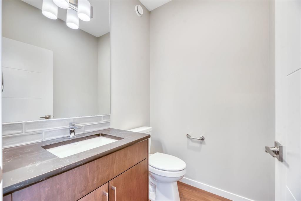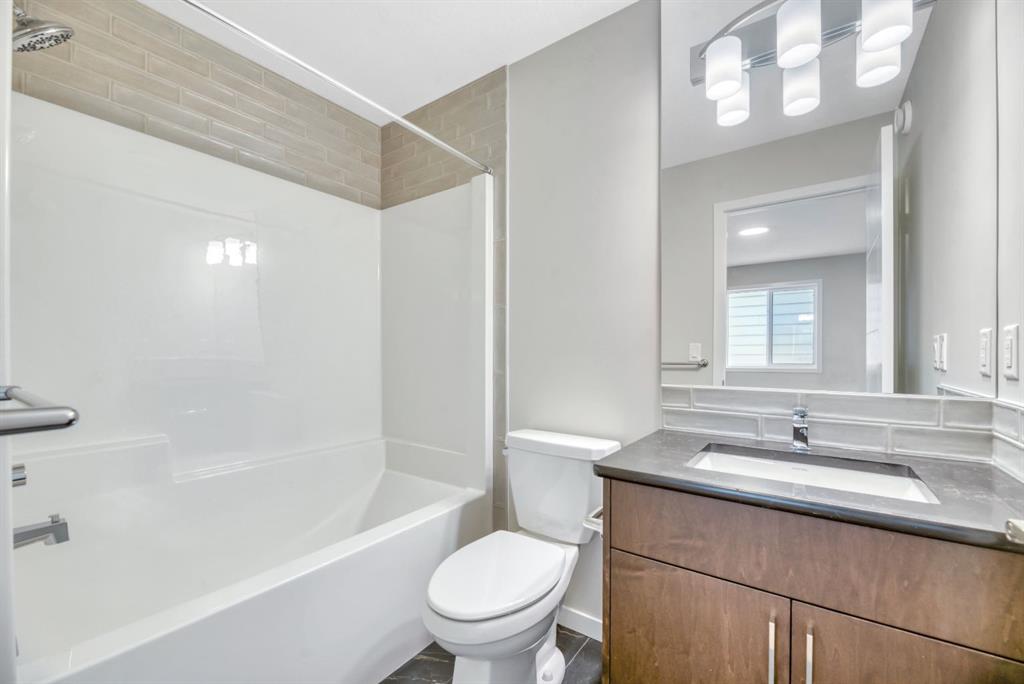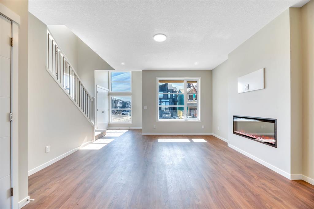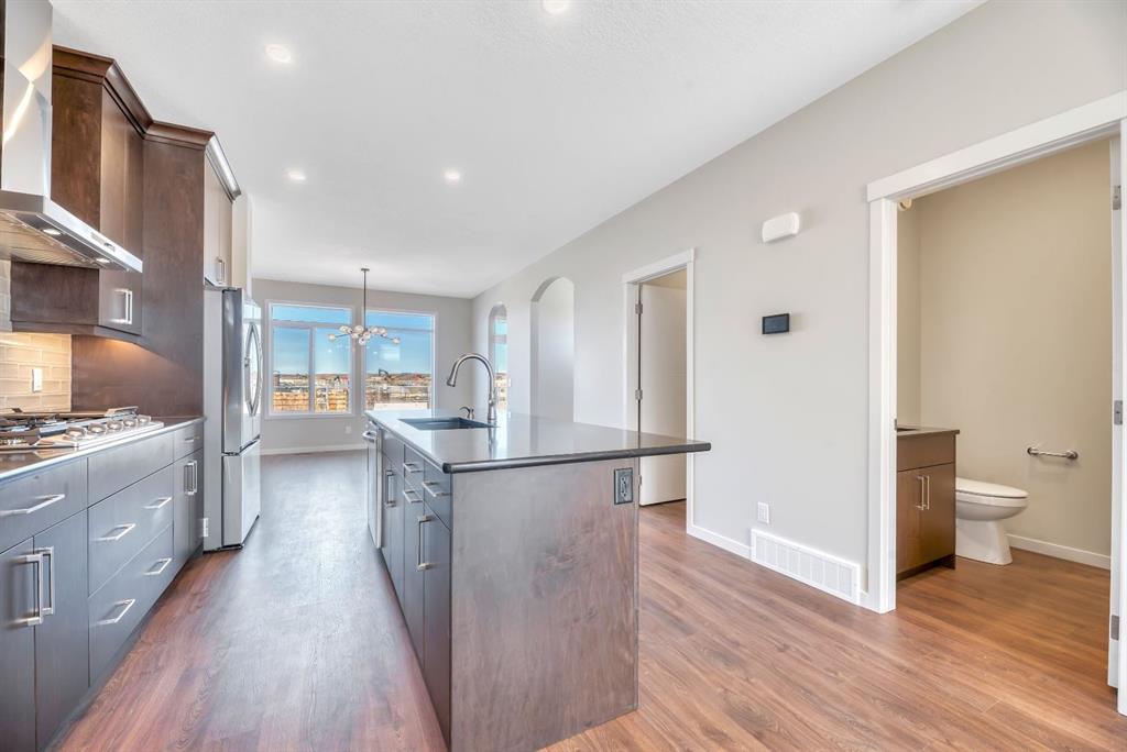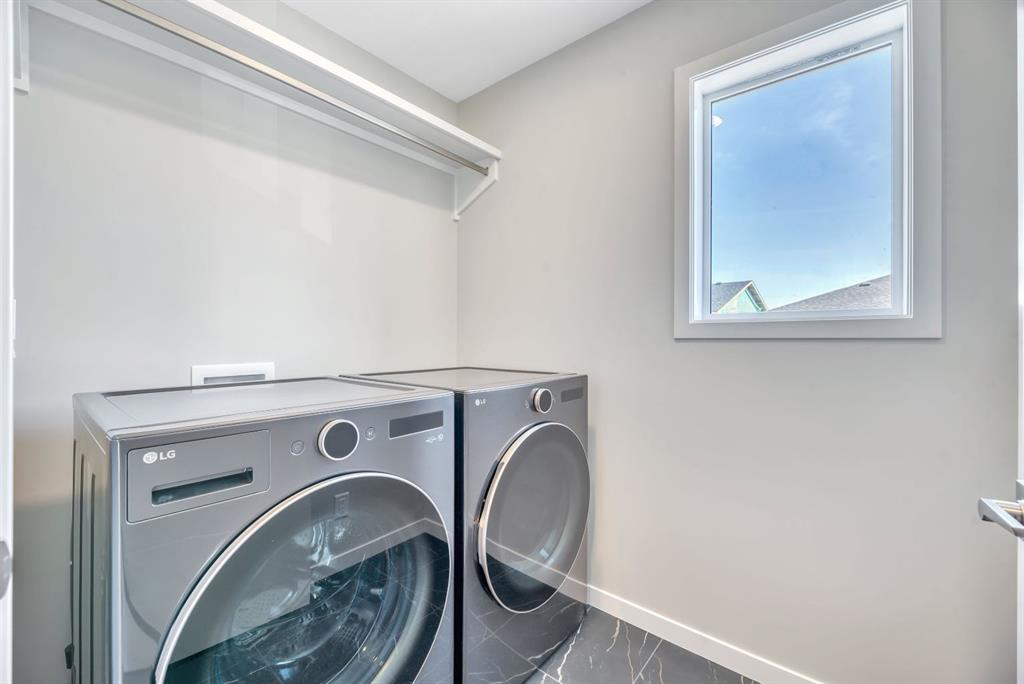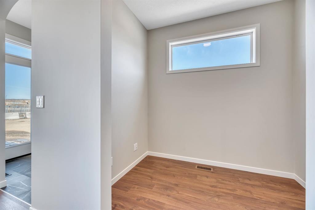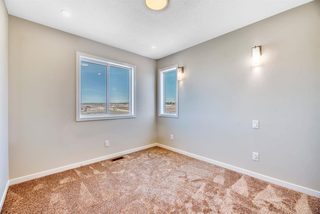 Welcome to the Arista model by Morrison Homes in the sought-after community of Rockland Park NW—a brand new, thoughtfully designed home that perfectly blends modern function with mid-century modern inspired style. Ideally positioned on an end lot siding and backing onto a lane, this property offers added privacy along with extra windows (on both sides) and exterior side entry, providing excellent potential for future development. Step inside to a bright, open-concept main floor where walnut-toned luxury vinyl plank flooring flows seamlessly throughout. The spacious great room is anchored by a sleek electric fireplace, creating a warm and inviting atmosphere. At the heart of the home, the stunning central kitchen is designed to impress with a large island, upgraded quartz countertops, tile backsplash, flat-panel wood grain cabinetry, and premium appliance package including a 5-burner gas cooktop, built-in wall oven, and microwave. Thoughtful upgrades such as under-cabinet lighting, pots and pan drawers, and garburator enhance both style and functionality. A versatile main floor office with arched entry offers the perfect work-from-home setup, while a convenient 2-piece bath with vanity completes this level. Additional windows throughout flood the home with natural light, elevating the overall feel. Upstairs, enjoy upgraded carpet and underlay, a dedicated laundry room with front-load washer and dryer, and a well-designed layout ideal for families. The front-facing primary retreat features a walk-in closet and a 4-piece ensuite with heated floors—a little touch of luxury. A central bonus room provides separation and privacy, while two generously sized bedrooms at the back share a full bathroom. The unfinished basement offers future potential with 9’ foundation walls, a bright layout, and rough-ins for a legal suite (subject to municipal approvals and permits)—ideal for multi-generational living or added income. Quick possession available, making this an excellent opportunity to move into a brand new home without the wait. Stylish, functional, and full of potential—this is Rockland Park living with all the added amenities of the area!