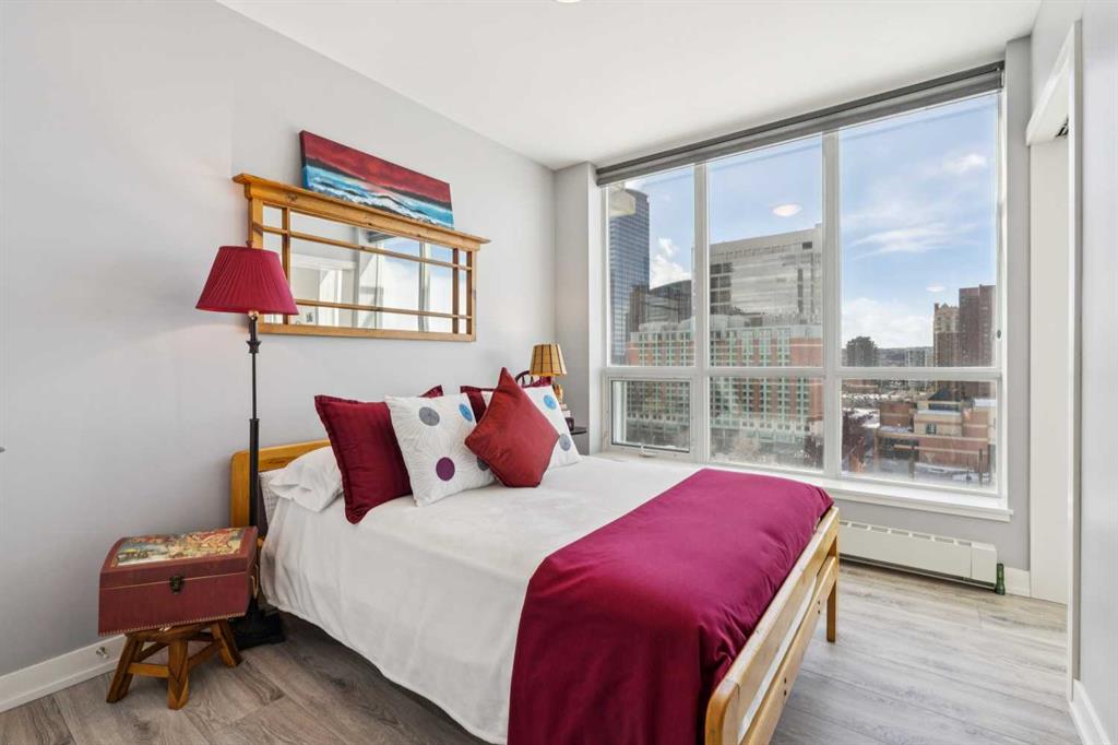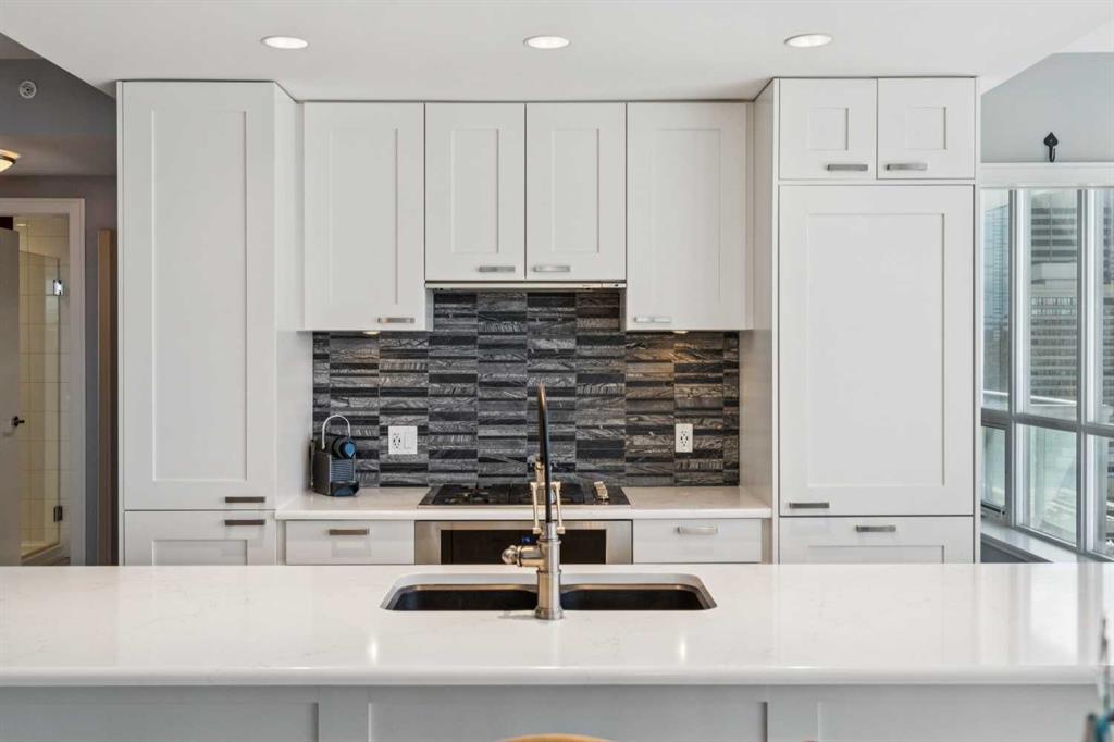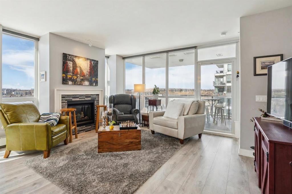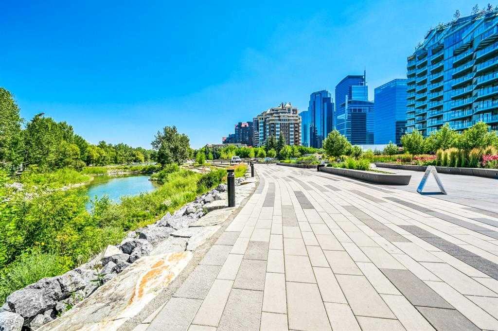 Sky-High Luxury Living in the Waterfront! Prime northwest corner location with spectacular views of Prince's Island Park, Bow River, mountains, COP and the downtown city lights! The many large expansive corner windows provide an abundance of bright natural light while enhancing those incredible views from every room! Exceptional open floor plan that's perfect for entertaining and great layout with opposite side bedrooms for complete privacy! Completely renovated kitchen, bathrooms, flooring and UV-Coated windows all in 2018. Immaculate 2 Bedroom + Den home with gorgeous hardwood flooring, quartz counter-tops throughout, soft-close kitchen drawers, custom Hunter Douglas blinds and tasteful recessed lighting! You'll be sure to enjoy the large covered balcony with incredible views, natural-gas fireplace, 5 pce ensuite bath with soaker tub and rain shower, custom closet organizers, separate office-den, open kitchen with large eat-in Island, gas range, 2 built-in freezer drawers, brand new dishwasher and microwave, separate laundry room with storage, high-end stack washer/dryer and spacious entrance to greet your guests. Comes with 2 very convenient SXS parking stalls across from elevator doors and storage locker in secure storage room. The luxurious Waterfront towers provide first-class amenities with concierge service, impressive lobby with comfortable seating area, fully equipped fitness center, hot tub area, steam room, yoga studio, social lounge with billiard table, awesome Theater room, private inner courtyard and car wash facilities! The location is extraordinary along the south bank of the Bow River next to Prince's Island Park, world-class pathway system, near by shops and boutiques, great restaurants and cafes, Chinese Cultural Center and quick access to transportation and the LRT. Time to enjoy the ultimate in downtown urban living!