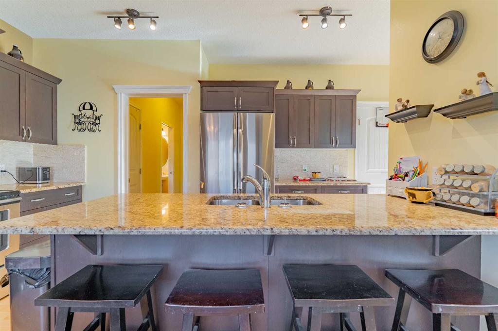 Welcome to 142 West Pointe Circle, a charming detached family home tucked away on a quiet cul-de-sac just steps from the Bow River. Located in one of Cochrane’s most sought-after neighbourhoods, this home offers the perfect blend of retreat, convenience and entertaining. The West Pointe community is known for its gorgeous walking trails, riverfront scenery, and ideal proximity to elementary schools and daycares — all while feeling just far enough removed from downtown to offer a peaceful, nature-connected lifestyle. Inside, the main level features a thoughtful layout with a warm, natural flow between the living room, kitchen, and laundry room. While not fully open-concept, each space is connected in a way that feels comfortable and intuitive for everyday family living. Upstairs, the staircase splits into two inviting wings. To the right, a bright and spacious family room awaits — flooded with natural light from large windows and offering the perfect spot for movie nights, a play area, or a cozy second living room. To the left are the home’s three bedrooms, including the primary suite overlooking the front of the property. This retreat features a generous walk-in closet and a well-appointed 4-piece ensuite with a soaking tub and separate shower. The basement is a true standout, designed for those who love to entertain and relax. A custom stone feature wall anchors a built-in entertainment area complete with a Napoleon electric fireplace for cozy atmosphere and visual appeal. On the opposite end, the same stonework ties into an impressive wet bar, creating a stylish, cohesive “man-cave” vibe. There’s ample space for a comfortable TV seating area as well as room for a full-sized pool table — the perfect setup for game nights, gatherings, or unwinding in your own private retreat. Outside, the backyard continues to elevate the lifestyle this home offers, with a spacious hot tub and stone sitting area ideal for evening fires and outdoor entertaining. A double attached garage and built-in dog run/kennel add convenience for both owners and pets. Beautifully located, thoughtfully designed, and loaded with character, 142 West Pointe Circle is a true gem for families seeking comfort, community, and Cochrane’s natural beauty right at their doorstep.