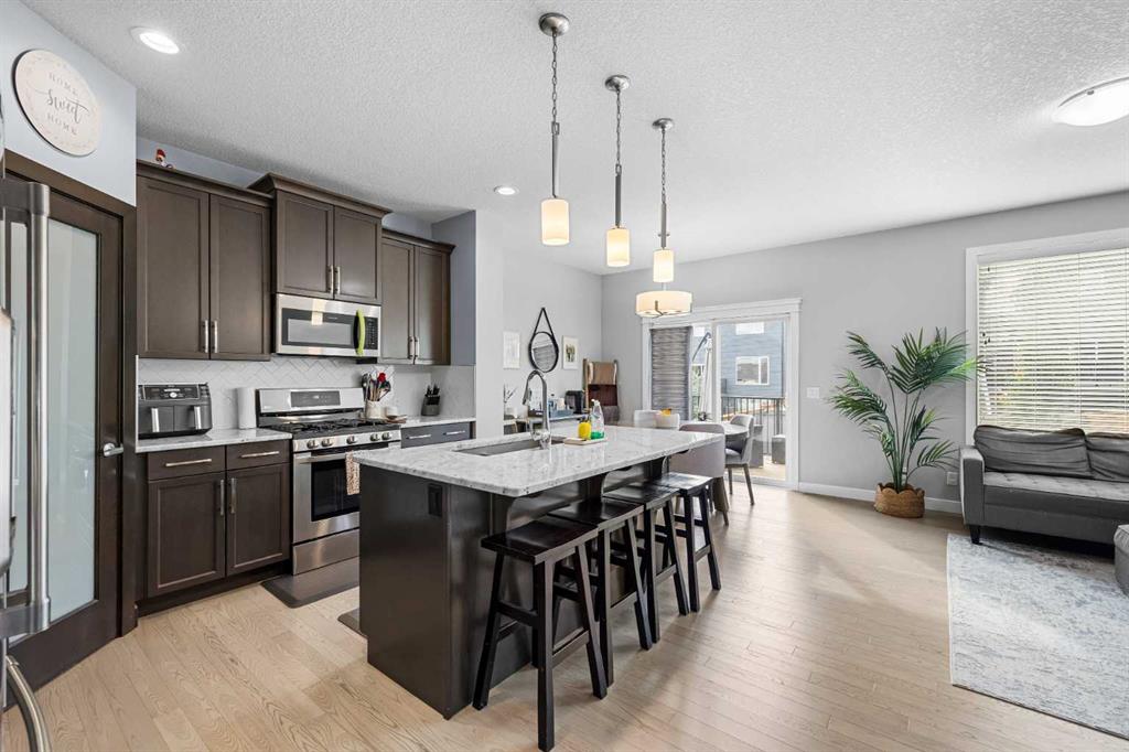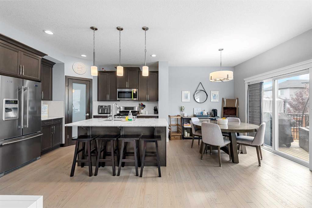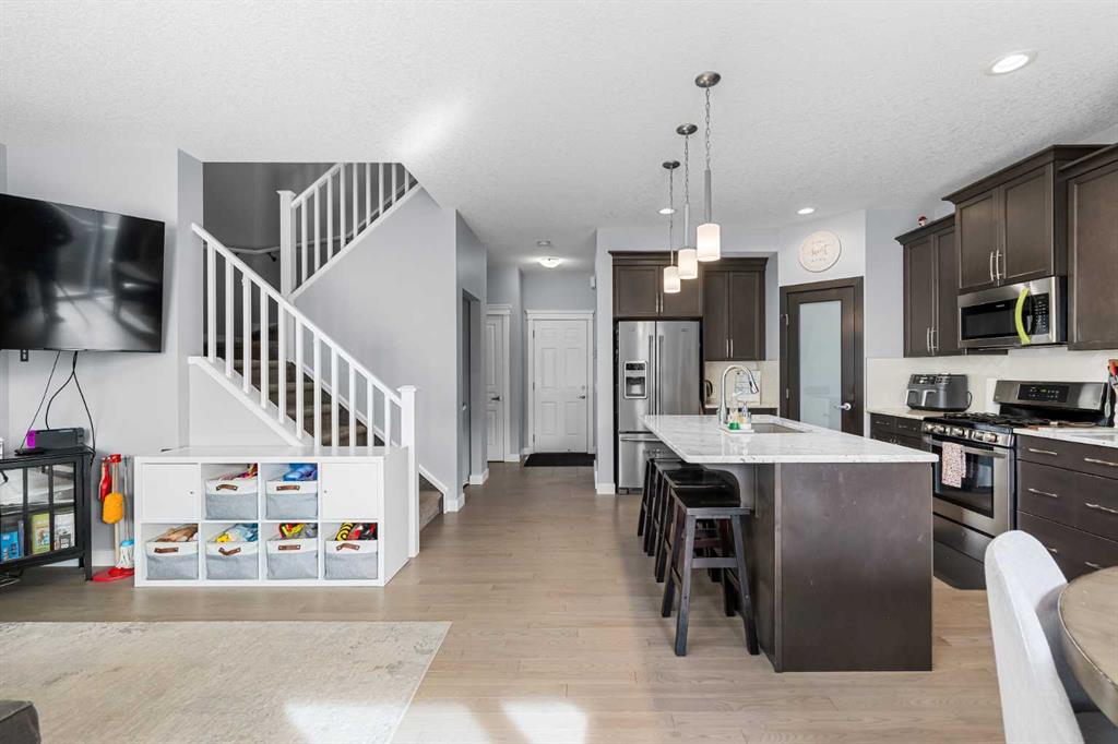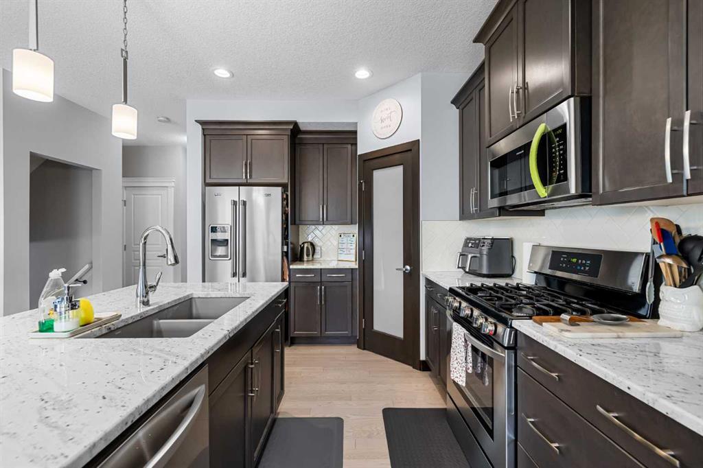 Welcome to the highly sought-after northwest community of Evanston! This beautiful double attached garage home offers over 2,100 sq. ft. of developed living space, featuring 4 spacious bedrooms and 3.5 bathrooms, including a professionally finished basement — perfect for families or anyone who loves to entertain. Step inside to a bright and welcoming foyer that opens to an airy, open-concept main floor with gorgeous hardwood flooring and large south facing windows that flood the space with natural light. The gourmet kitchen is a chef’s dream, complete with upgraded stainless steel appliances including a gas stove, granite countertops, a corner pantry, and a massive center island ideal for meal prep and casual dining. The adjoining dining area is perfect for family dinners or gatherings, while the spacious living room provides a comfortable space to relax, watch movies, or spend time with loved ones. A convenient 2-piece powder room completes the main level. Upstairs, the primary bedroom offers a peaceful retreat with a walk-in closet featuring a large window and a 3-piece ensuite with a standalone shower & granite counter tops. Two additional generous bedrooms, a 4-piece main bathroom, and upper-level laundry add functionality and comfort to the space. The fully finished basement expands the living area with a large recreation room, a 4th bedroom, and a full bathroom with ample counter space — perfect for guests or a teenager’s private getaway. Step outside to your beautifully landscaped south facing backyard, featuring a large deck with a BBQ gas hookup, a lower concrete patio and a storage shed! Well maintained with mature trees at the back of the yard for added privacy. Additional highlights include central air conditioning to keep you cool during summer months and a rough in for a central vacuum system. Situated in one of NW Calgary’s most desirable communities, this home is close to schools, walking paths, shopping, and amenities, with easy access to Stoney Trail for a quick commute. Don’t miss your chance to own this stunning Evanston home — it’s the perfect blend of comfort, style, and location. Lovingly cared for by the original owners!