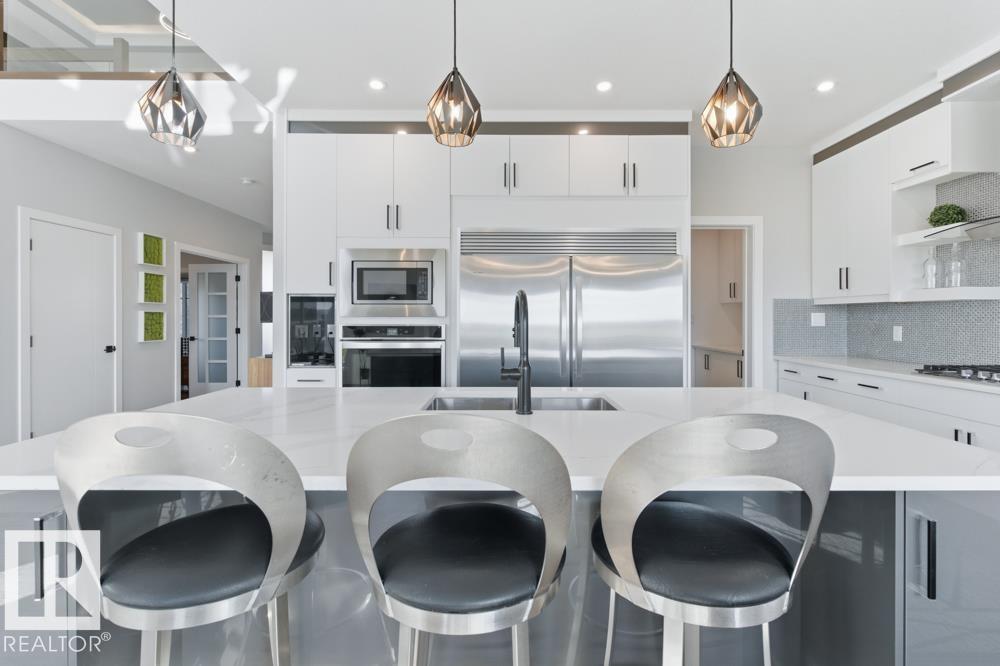 QUIET PERMANENCE & ELEVATED DESIGN. This residence backs onto a future permanent greenway replacing Ellerslie Road—ensuring enduring privacy, serenity, and connection to planned pathways. Positioned in established, low-density Langdale and near the forthcoming Windermere District Park this setting anchors long-term desirability. This majestic home boasts a soaring open-to-below great room, 9-ft ceilings, & triple-pane glazing imparting an atmosphere of quality and calm. Interior selections blend engineered hardwood, porcelain tile, and soft-weave carpeting within an open, flowing layout. The custom culinary space is appointed with quartz surfaces, a walk-through butler's pantry, gas cooktop, stainless wall oven, and an oversized integrated fridge and freezer. Everyday comfort is secured through central A/C, high-efficiency heating, built-in speakers, & rough-in for central vac. Outdoors, a triple attached garage & expansive vinyl-finished deck provide functional elegance—with no HOA restrictions.