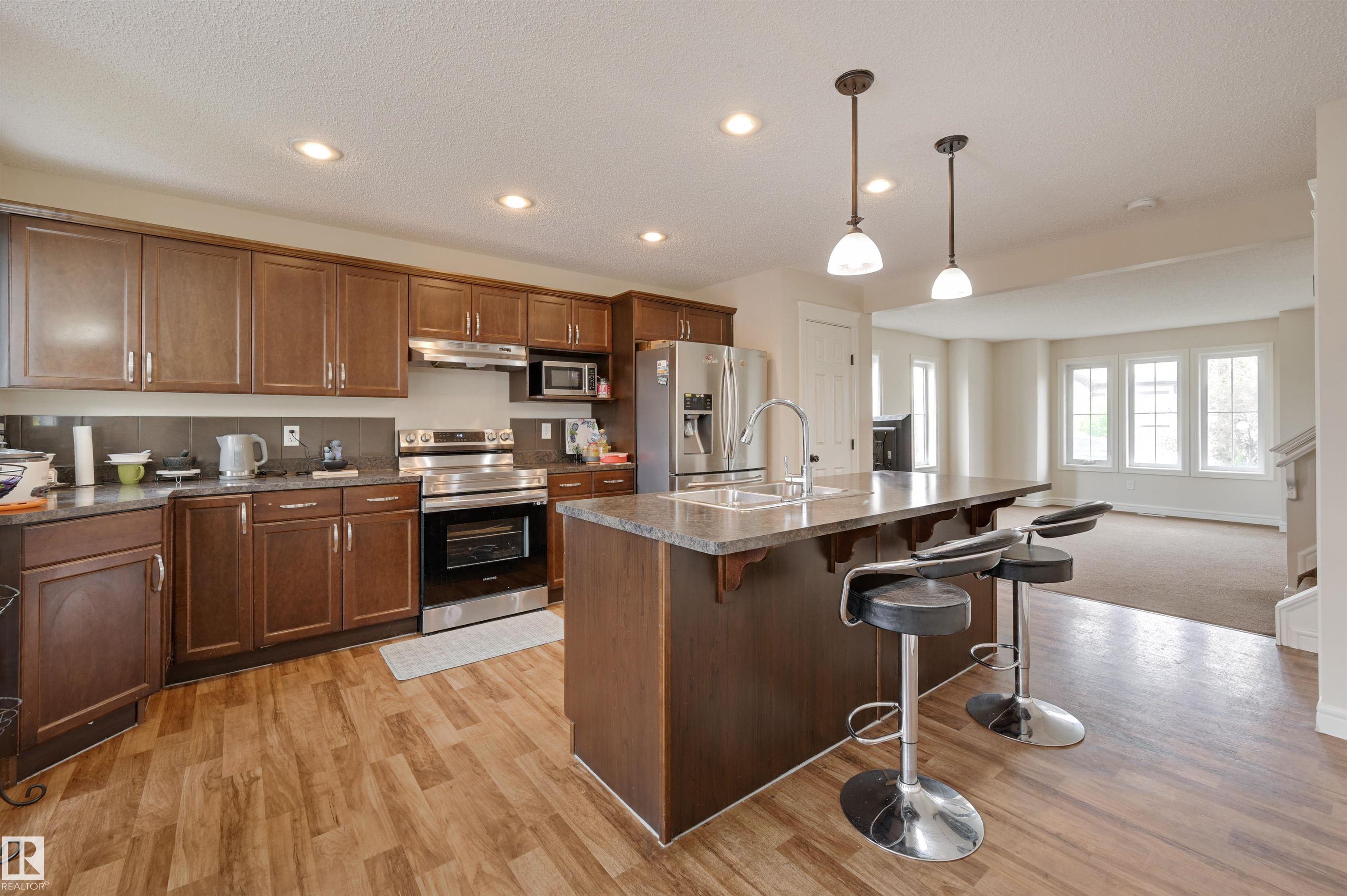 NO CONDO FEES -Located in the vibrant community of Walker, this end unit townhouse sides onto a beautiful greenspace with direct access to walking trails. The open-concept main floor features a bright living area that flows into the kitchen with a large island, pantry, & a dining nook overlooking the deck & backyard—perfect for family living. Enjoy the convenience of main floor laundry, a back entry with mudroom space, & a 2-piece powder room. Upstairs, the spacious primary suite offers a walk-in closet & a 4-piece ensuite. Two additional spacious bedrooms (second with walk-in closet) & a 4-piece bath. The unfinished basement provides space for a future 4th bedroom and rec room, or two additional bedrooms plus a full bath (rough-in plumbing in place). A double detached garage completes the package. Located just down the street from all major amenities, walking distance to schools & parks, & with quick access to the Henday & Whitemud. A fantastic opportunity in an even better community.