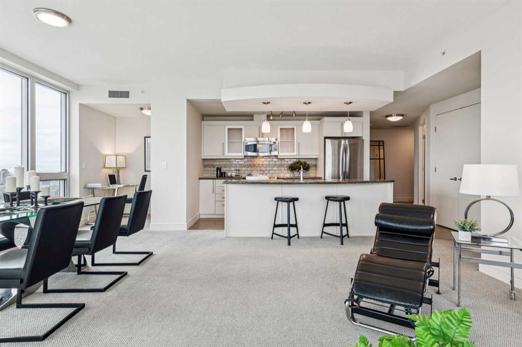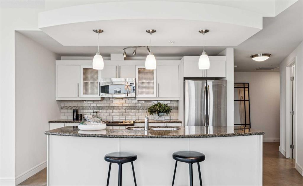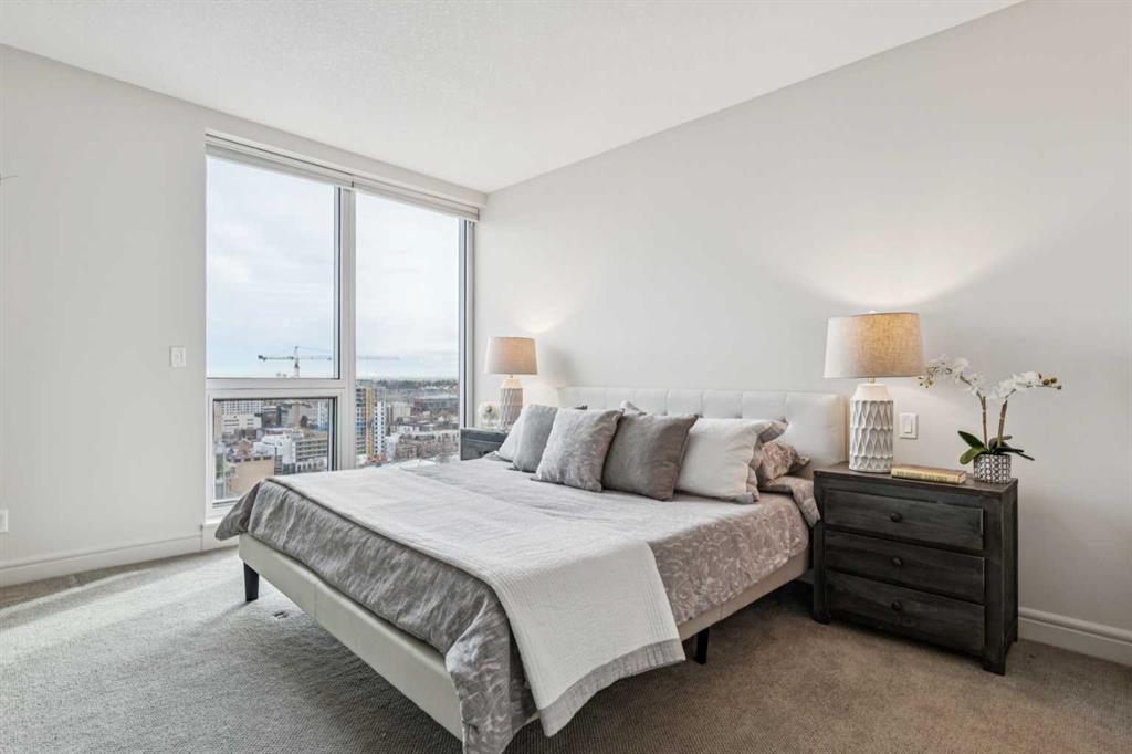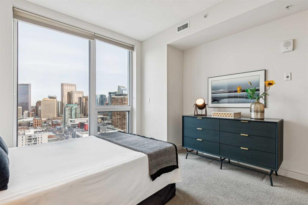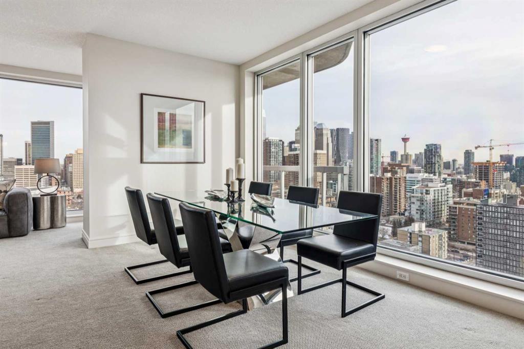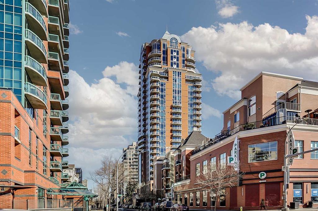 Experience luxury living at this high-floor, stunning corner unit that’s part of the exclusive “Penthouse Collection” at The Montana. This is arguably this most desirable location in the Beltline…just off 17th Avenue and 8th Street…surrounded by endless amenities, shops services, restaurants, cafes and fitness…a true lifestyle destination. This “Georgia” floorplan offers a generous 1289 square feet including 2 bedrooms, a den-office and 2 full baths. Floor-to-ceiling windows frame incredible downtown views that include all the iconic buildings. 9’ ceilings, contemporary architectural details, updated lighting and fresh paint throughout. Flexible and open-concept layout including a generous seating area, a dining area that can accommodate a large table, a work-from-home space tucked around the corner and a stylish kitchen with excellent storage (double-door pantry), fresh white cabinetry, granite counters, large centre island with extended counter for stools and stainless appliances. Balcony with panoramic view and gas for BBQ. Exceptional primary suite with a large bedroom that enjoys morning light, power window shades, Restoration Hardware drawer units, a generous walk-through closet and a 4-piece ensuite with soaking tub-shower combination. Good second bedroom next to a 3-piece bath with shower. Laundry room with storage. Extra-wide titled parking stall and assigned storage locker. The Montana has a unique window construction…the 3” thick “vision wall” system for superior soundproofing and energy efficiency. Central air conditioning. Building amenities include a newly renovated fitness centre, 5-star concierge service, visitor parking and 3 high-speed elevators with secured floors. Perfect for downsizers and those that appreciate a little extra space.