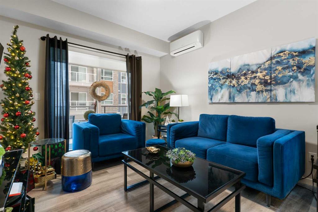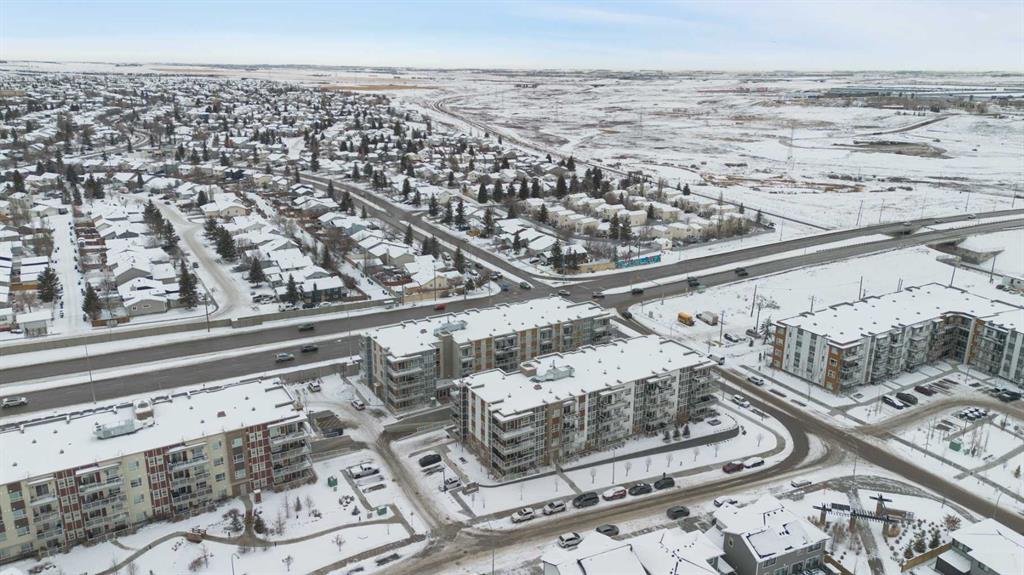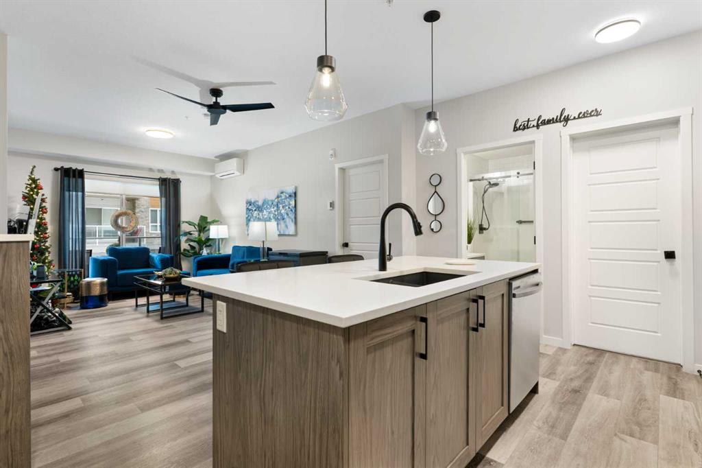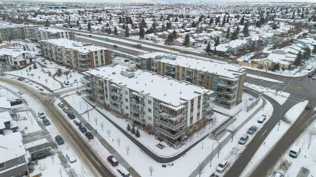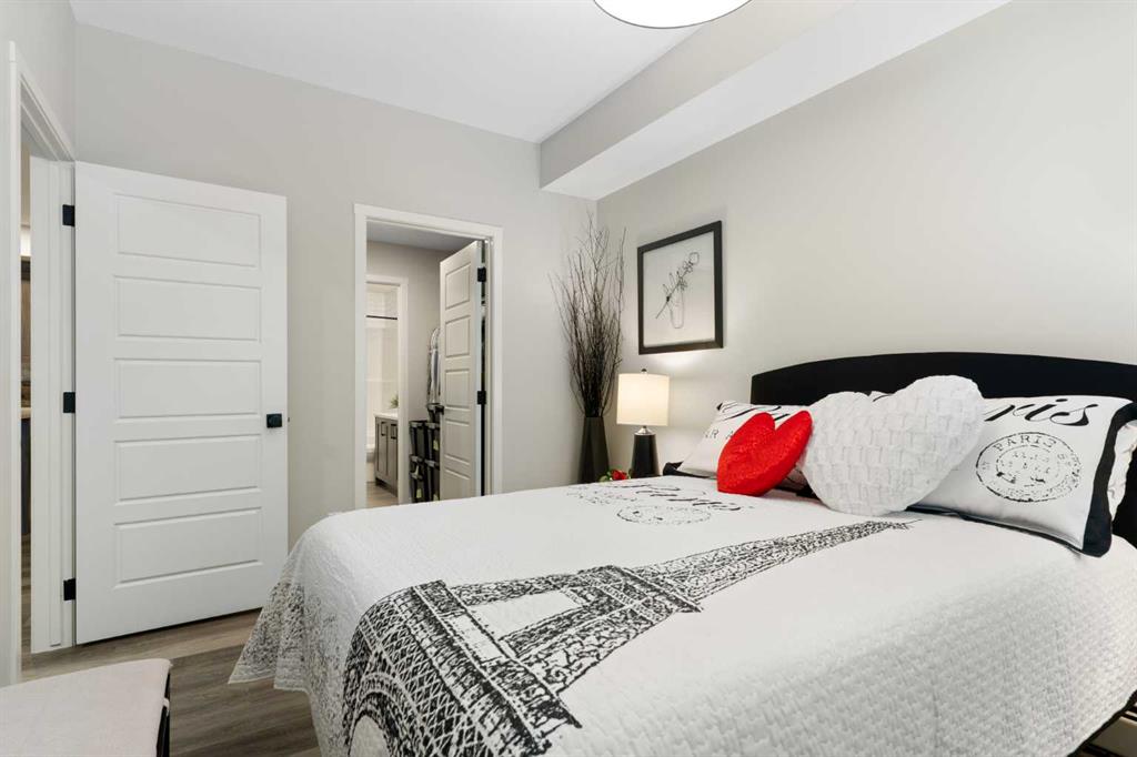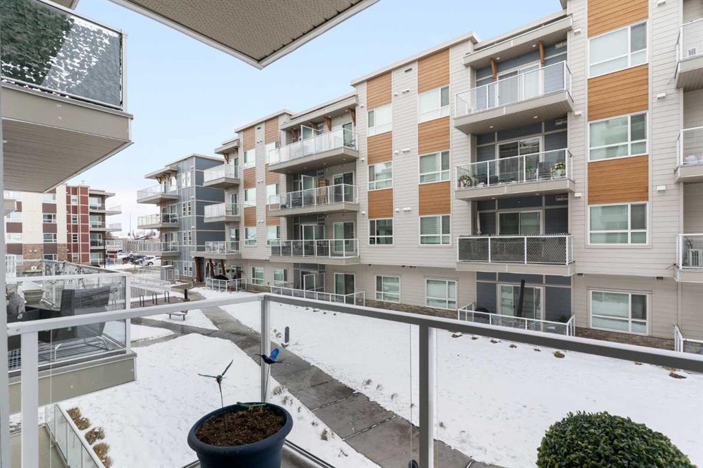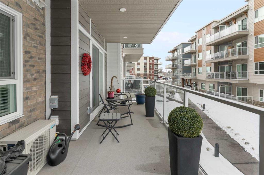 Step into comfort, style, and elevated living in this beautiful 2-bed, 2-bath condo in The Rise at The Parks of Harvest Hills. Built by Cedarglen Homes, and lovingly maintained by its original owners, this home stands out with premium upgrades and central AC for year-round comfort. From the moment you arrive, pride of ownership is evident. The welcoming entry leads into a bright, modern kitchen that makes both everyday cooking and hosting feel special. Featuring a large island with seating, quartz countertops, stainless steel appliances, and a stylish chevron tile backsplash that create a high-end look and feel. Plenty of cabinetry and a pantry give you the storage every homeowner wants without sacrificing clean, contemporary design. Luxury vinyl plank flooring runs throughout the main living spaces for durability and a modern finish. In the dining area, the builder-upgraded built-in adds character and practical storage, making entertaining effortless. The spacious living room has the perfect layout for relaxing, movie nights, or hosting game night with friends. Slide open the patio doors to your oversized private balcony. With room to lounge or dine, built-in exterior lighting, and a BBQ gas line ready to go, this becomes an outdoor extension of your home that you will love from morning coffee to summer evenings. The primary bedroom is tucked away on its own side of the home for privacy and peace. There is plenty of space for a king-sized bed and additional furniture, while the walk-in closet features custom built-ins designed to keep life organized. The 4-piece ensuite is bright, fresh, and calming. It feels like your own personal retreat at the end of a long day. Across the unit, the second bedroom offers flexibility for guests, a roommate, a nursery, or the perfect work-from-home office. The adjacent 3-piece bathroom includes a full-size walk-in shower with upgraded fixtures for a sleek and modern finish. Back near the entry, the laundry room truly sets this home apart. Builder-installed upper cabinets and extra shelving ensure everything has a place and stays clutter-free. A luxury rarely found in condo living. This space also doubles as your front closet with plenty of room for shoes and jackets. Your titled underground parking stall is conveniently just steps from the elevator, making grocery runs effortless. An assigned storage locker and secure bike storage are also included on the same lower level, giving you even more room for the things you love. You are perfectly positioned here. Minutes from the airport, close to Deerfoot and Stoney Trail, and a short stroll to restaurants, local shops, Landmark Cinemas, parks, tennis courts, and schools. Convenience and comfort come together seamlessly. Whether you are downsizing, investing, or purchasing your first home, this upgraded condo offers a level of quality and lifestyle that truly stands out. Welcome home to The Rise at The Parks of Harvest Hills.