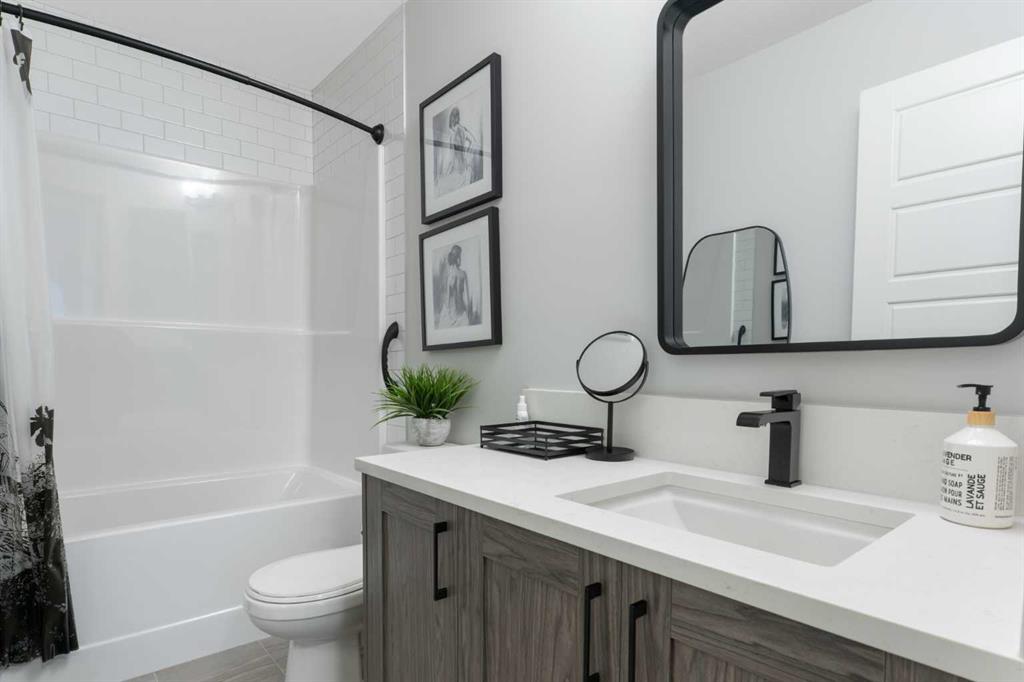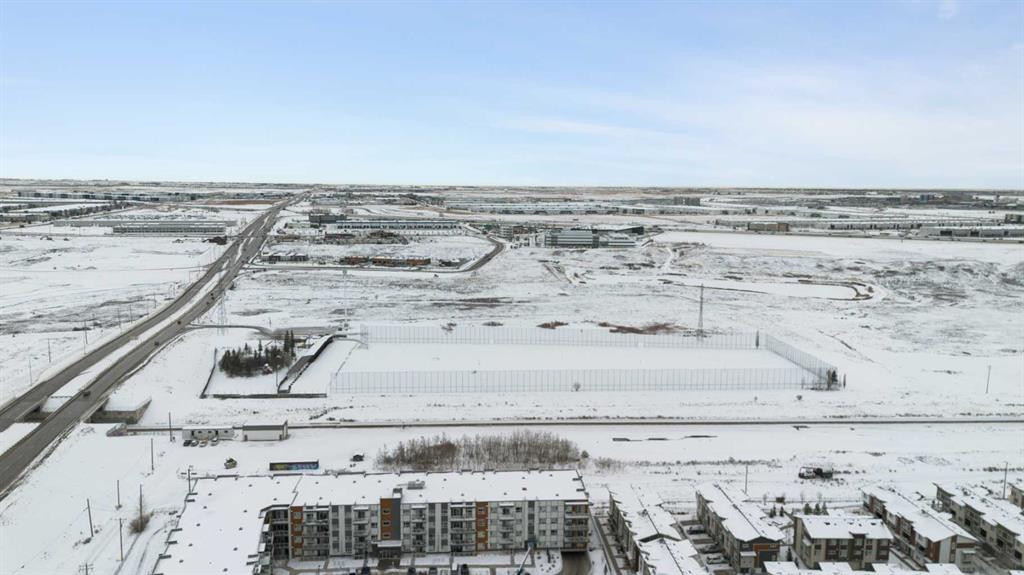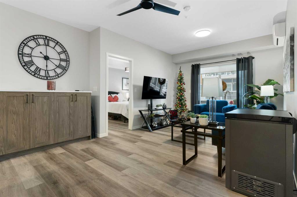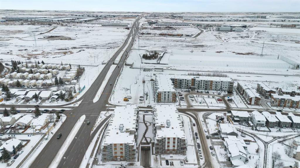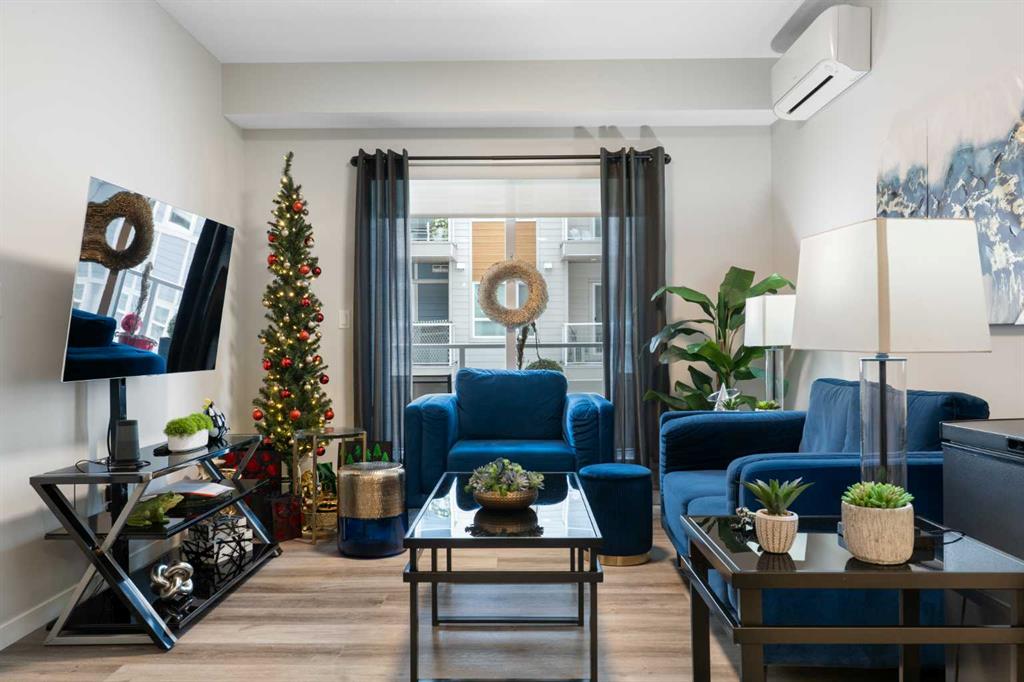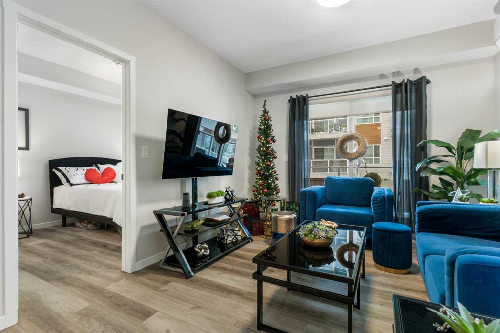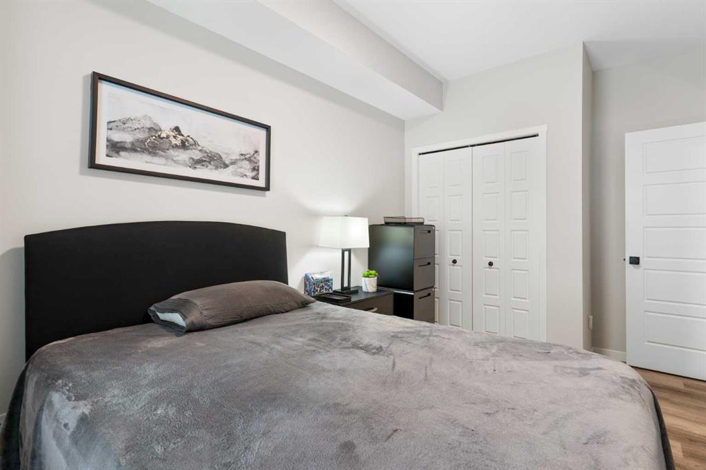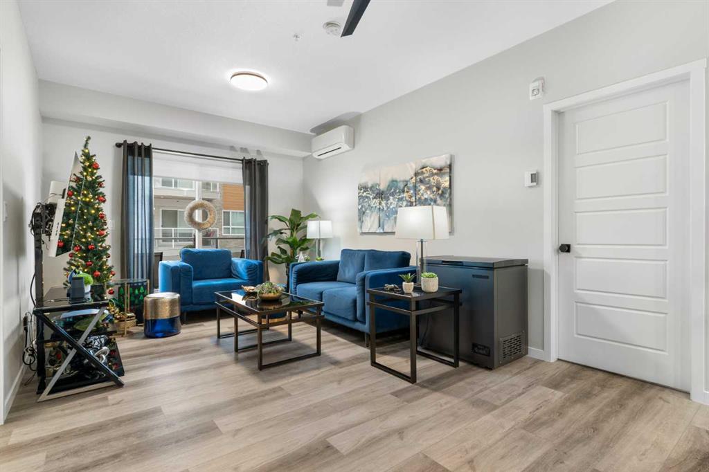 Step into comfort, style, and elevated living in this beautiful 2-bed, 2-bath condo in The Rise at The Parks of Harvest Hills. Built by Cedarglen Homes, and lovingly maintained by its original owners, this home stands out with premium upgrades and central AC for year-round comfort. From the moment you arrive, pride of ownership is evident. The welcoming entry leads into a bright, modern kitchen that makes both everyday cooking and hosting feel special. Featuring a large island with seating, quartz countertops, stainless steel appliances, and a stylish chevron tile backsplash that create a high-end look and feel. Plenty of cabinetry and a pantry give you the storage every homeowner wants without sacrificing clean, contemporary design. Luxury vinyl plank flooring runs throughout the main living spaces for durability and a modern finish. In the dining area, the builder-upgraded built-in adds character and practical storage, making entertaining effortless. The spacious living room has the perfect layout for relaxing, movie nights, or hosting game night with friends. Slide open the patio doors to your oversized private balcony. With room to lounge or dine, built-in exterior lighting, and a BBQ gas line ready to go, this becomes an outdoor extension of your home that you will love from morning coffee to summer evenings. The primary bedroom is tucked away on its own side of the home for privacy and peace. There is plenty of space for a king-sized bed and additional furniture, while the walk-in closet features custom built-ins designed to keep life organized. The 4-piece ensuite is bright, fresh, and calming. It feels like your own personal retreat at the end of a long day. Across the unit, the second bedroom offers flexibility for guests, a roommate, a nursery, or the perfect work-from-home office. The adjacent 3-piece bathroom includes a full-size walk-in shower with upgraded fixtures for a sleek and modern finish. Back near the entry, the laundry room truly sets this home apart. Builder-installed upper cabinets and extra shelving ensure everything has a place and stays clutter-free. A luxury rarely found in condo living. This space also doubles as your front closet with plenty of room for shoes and jackets. Your titled underground parking stall is conveniently just steps from the elevator, making grocery runs effortless. An assigned storage locker and secure bike storage are also included on the same lower level, giving you even more room for the things you love. You are perfectly positioned here. Minutes from the airport, close to Deerfoot and Stoney Trail, and a short stroll to restaurants, local shops, Landmark Cinemas, parks, tennis courts, and schools. Convenience and comfort come together seamlessly. Whether you are downsizing, investing, or purchasing your first home, this upgraded condo offers a level of quality and lifestyle that truly stands out. Welcome home to The Rise at The Parks of Harvest Hills.