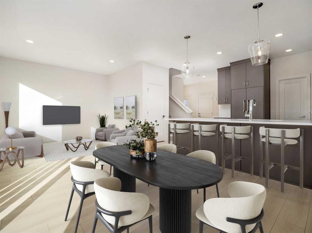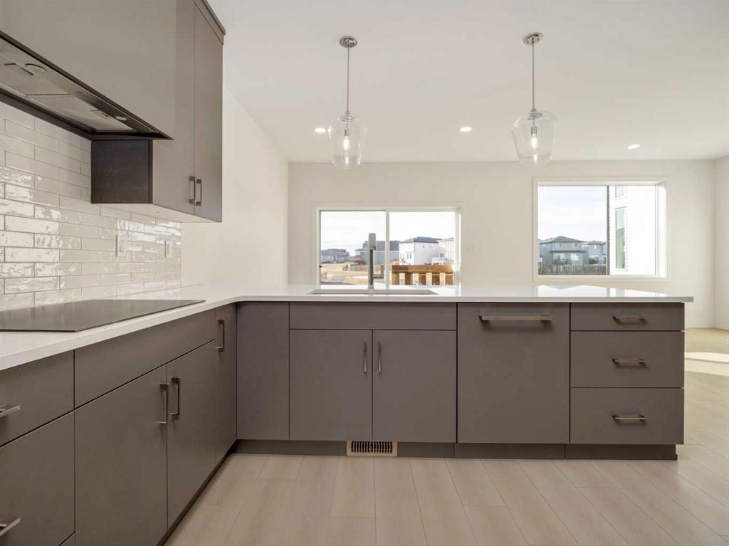This brand new two-storey home by Stranville Living Master Builder is perfectly positioned in the heart of Blackwolf, backing directly onto a serene pond and greenspace with convenient biking and walking trails right out your back door. Just minutes away, Legacy Park offers one of the city’s best outdoor amenity hubs, complete with a spray park, pond, skate park, pickleball courts, and basketball courts, making this location especially appealing for active households. Inside, the main level is designed around an open-concept living, dining, and kitchen space that fully embraces the pond views. Large windows bring the outdoors in, while the dining area features sliding glass doors leading to your future deck, creating a seamless indoor-outdoor connection that’s ideal for everyday living and entertaining. The kitchen is a true focal point, showcasing paneled Fisher & Paykel appliances, a paneled dishwasher, induction cooktop, built-in oven and microwave, and an abundance of counter space thanks to the U-shaped layout with bar seating. A spacious pantry adds practicality without compromising the clean, modern aesthetic. Upstairs, the home continues to impress with a well-thought-out layout that balances privacy and functionality. The primary suite features an impressive 10-foot-long walk-in closet and a private ensuite with a walk-in shower. Just down the hall, the dual-access laundry room is ideally placed for everyday convenience, along with two additional spacious bedrooms. At the end of the hallway, the second-floor bonus room provides a flexible space that works equally well as a family lounge, media room, or home office. Set in one of Lethbridge’s most recreation-focused communities, this home combines Stranville Living’s signature craftsmanship with pond-side views, thoughtful design, and access to some of the city’s best outdoor amenities.