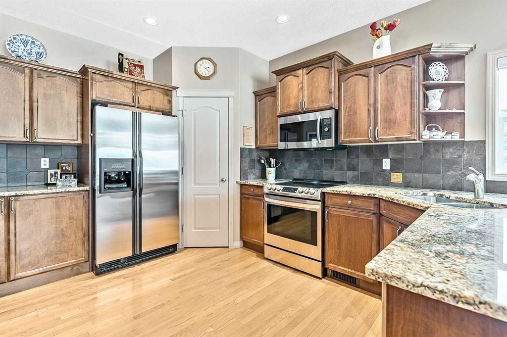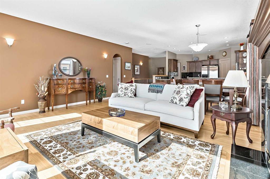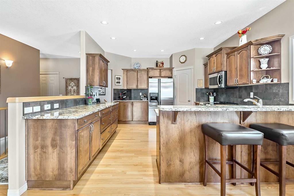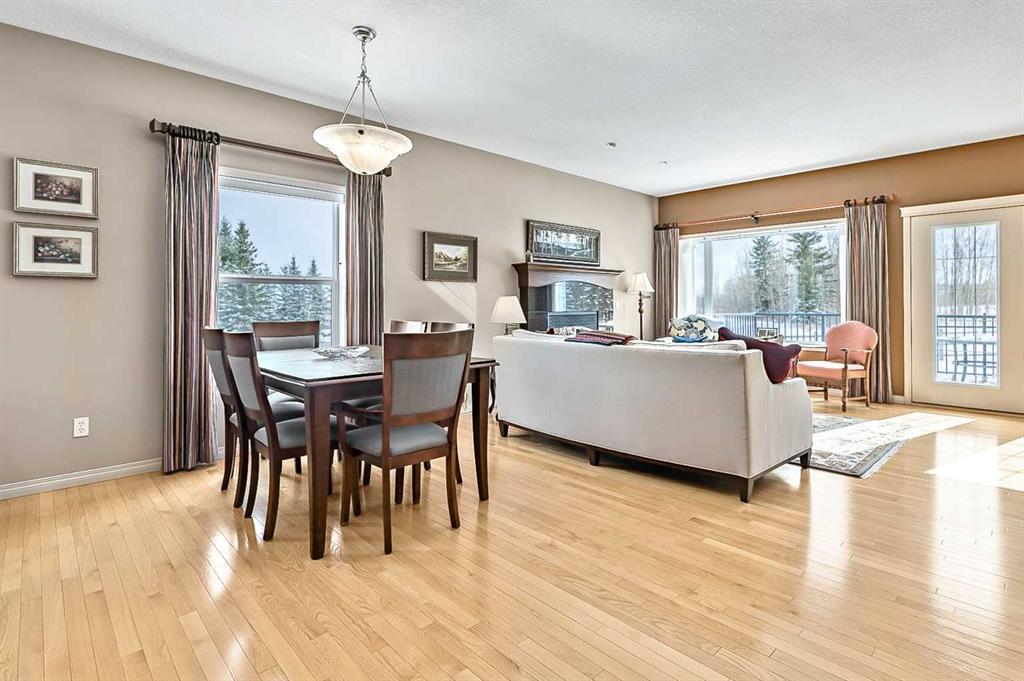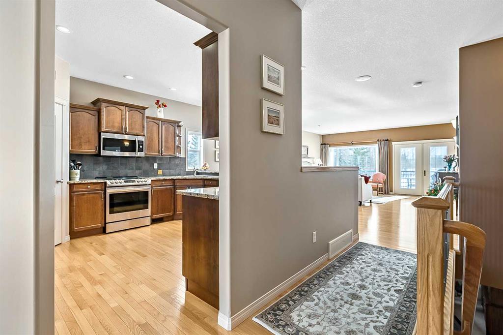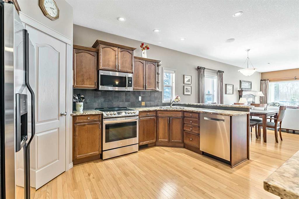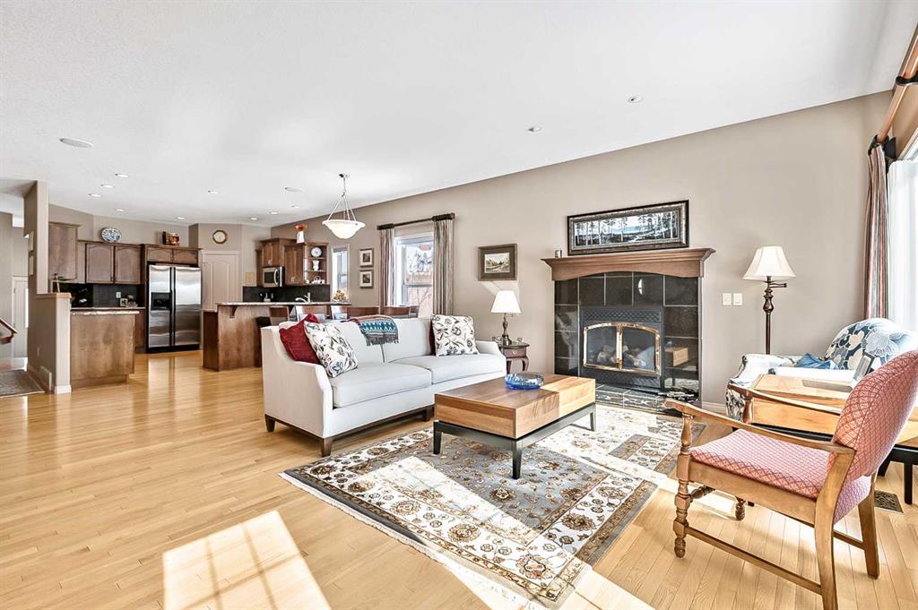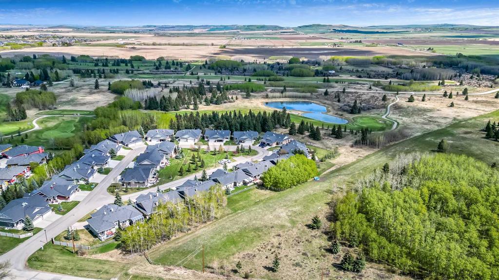 You truly can’t beat this outstanding location. Enjoy breathtaking views as far as the eye can see from the south-facing backyard, perfectly positioned for sunshine and privacy, in this beautiful adult villa complex. Ideally located just steps from the Turner Valley Golf Course in a quiet community cul-de-sac, this home offers both serenity and convenience. The main level features a bright open floor plan with gleaming hardwood flooring and 9 foot ceilings. The stunning kitchen is superbly finished with granite countertops, rich alder mocha-stained cabinetry complete with crown moldings, walk-in pantry, and stainless appliances. This open concept boasts generous sized great room with gas fireplace and is loaded with large windows letting in the natural light making it perfect for both everyday living and entertaining. A Bose sound system throughout the home adds comfort and atmosphere. The Main floor Primary bedroom is large enough to accommodate your king size bed with custom closets and boasts Spa-like ensuite. The fully developed basement boasts a spacious family room with gas fireplace and features plenty of room for gatherings, hobbies, or a home theatre, along with abundant storage space. Step outside to a professionally landscaped yard featuring a beautifully installed patio, underground sprinkler system, and one of the largest pie-shaped lots in the area—perfect for enjoying the peaceful surroundings. This home offers a rare combination of privacy, space, thoughtful upgrades, and an exceptional location.