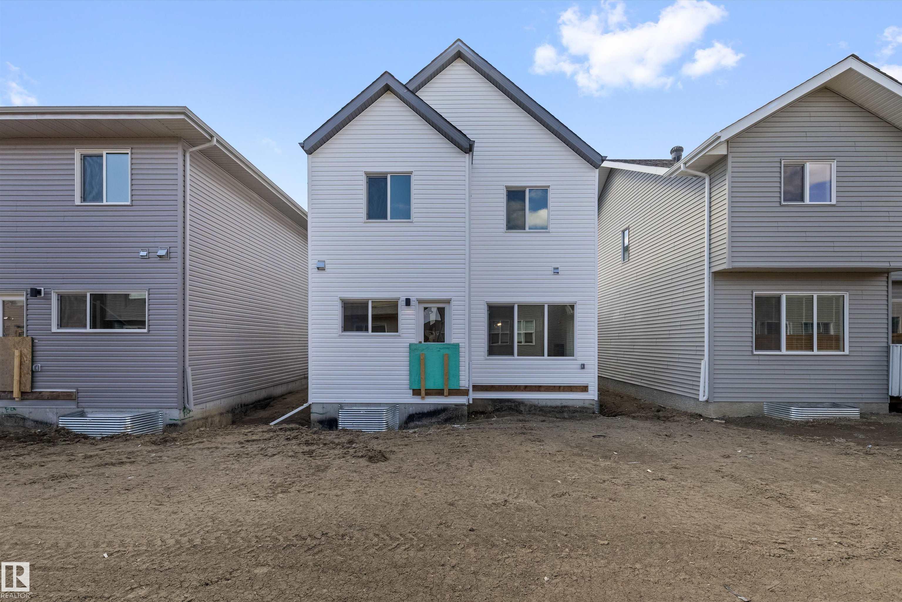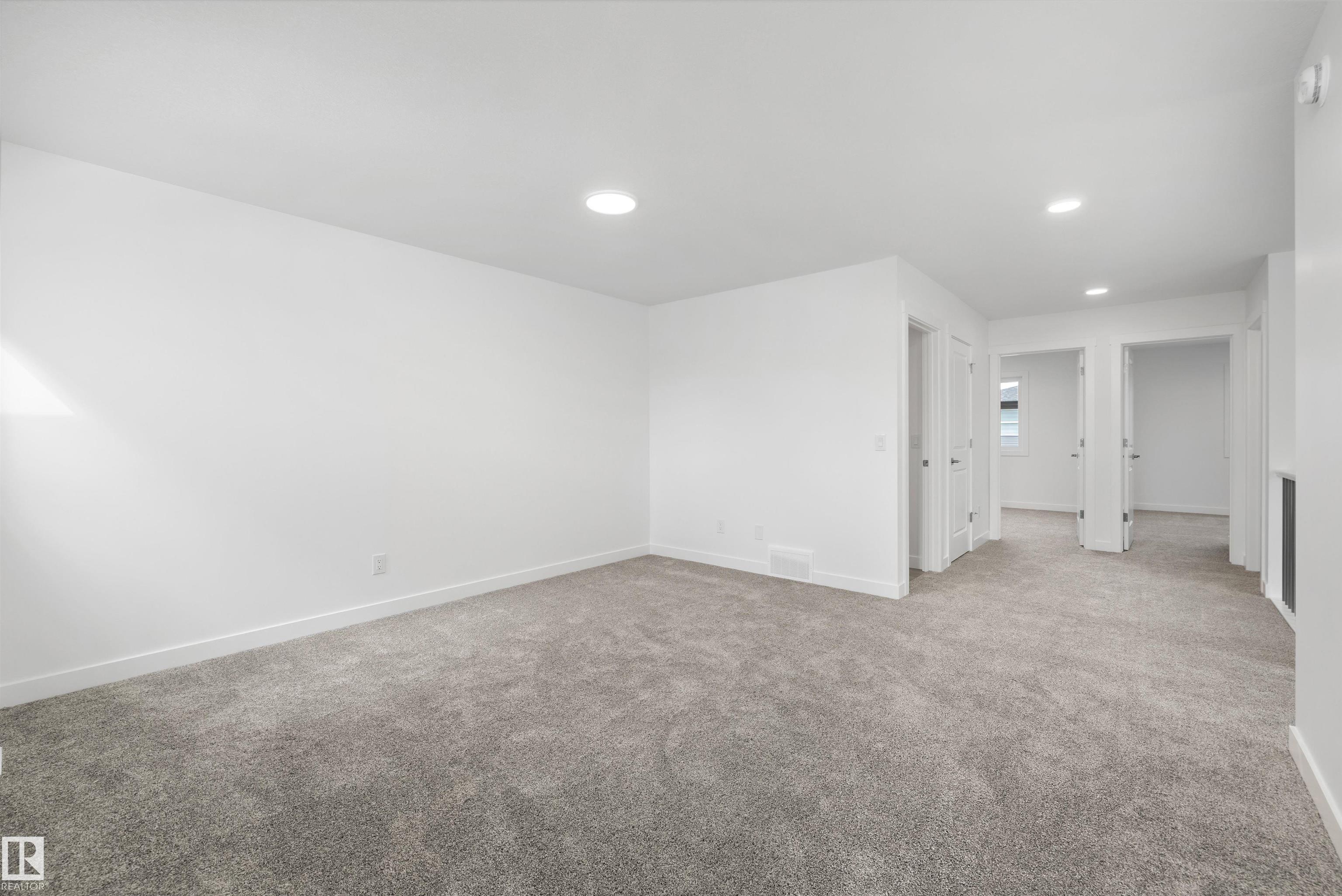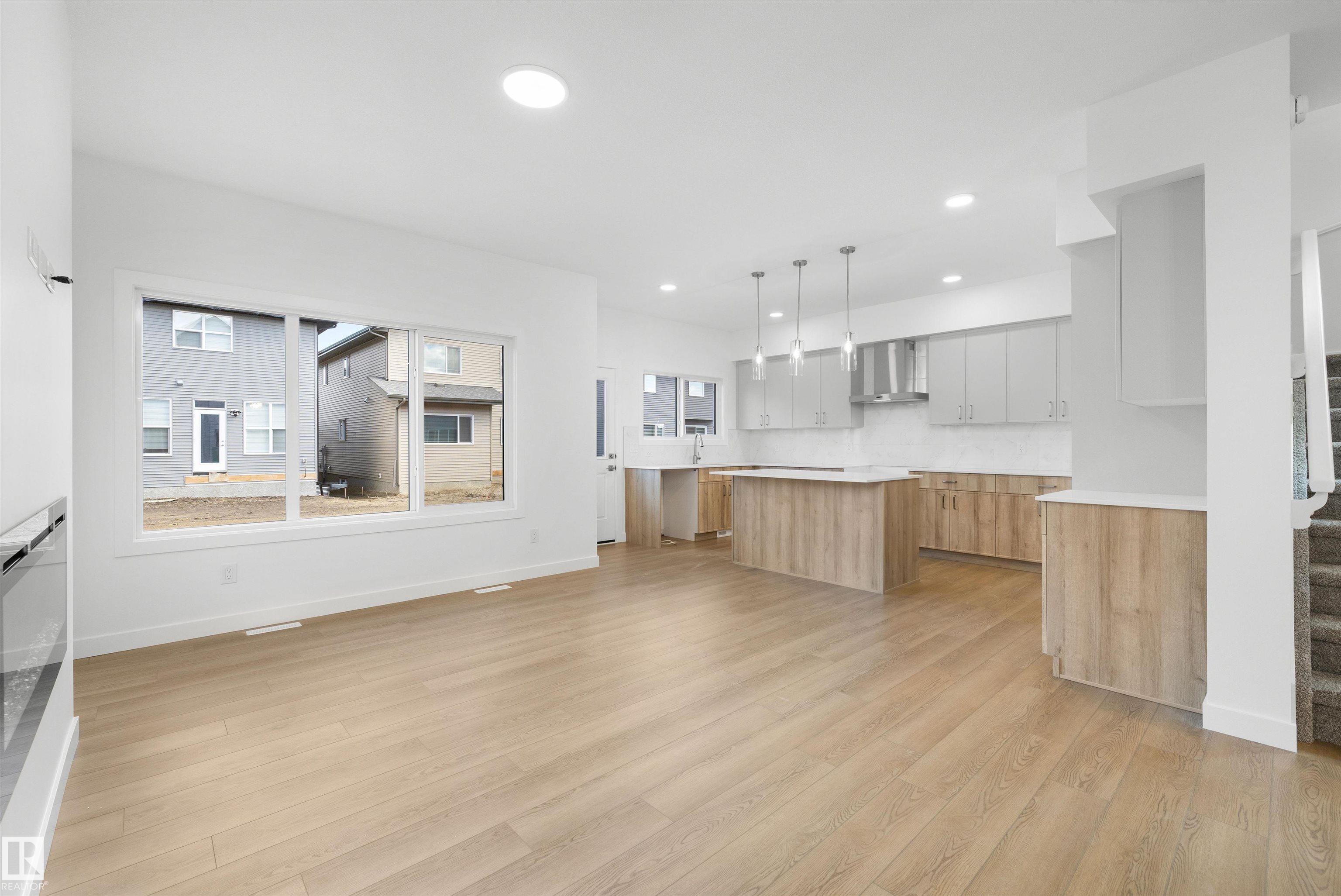 Built by Sterling Homes, this front-attached home offers bright, flexible living on a desirable corner lot. Triple pane windows and 9’ ceilings create an airy main floor that includes a convenient full bath and bedroom—ideal for guests or extended family. The kitchen features quartz counters, a large island, upgraded cabinetry, a chimney hood fan, a built-in microwave, a full-height backsplash, and a pantry. The great room’s electric fireplace and large windows make the space feel warm and inviting, while a patio door leads to the backyard. Upstairs, the primary suite includes a spacious walk-in closet and a 5-piece ensuite with double sinks, a glass-door shower, and a soaker tub. A central bonus room, full bath, laundry room, and two additional bedrooms complete the layout. With luxury vinyl plank flooring, upgraded railings, a separate side entrance, a garage with a floor drain, and basement rough-ins, this home blends comfort and practicality in a scenic west-end community.