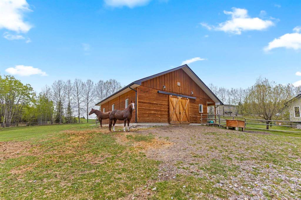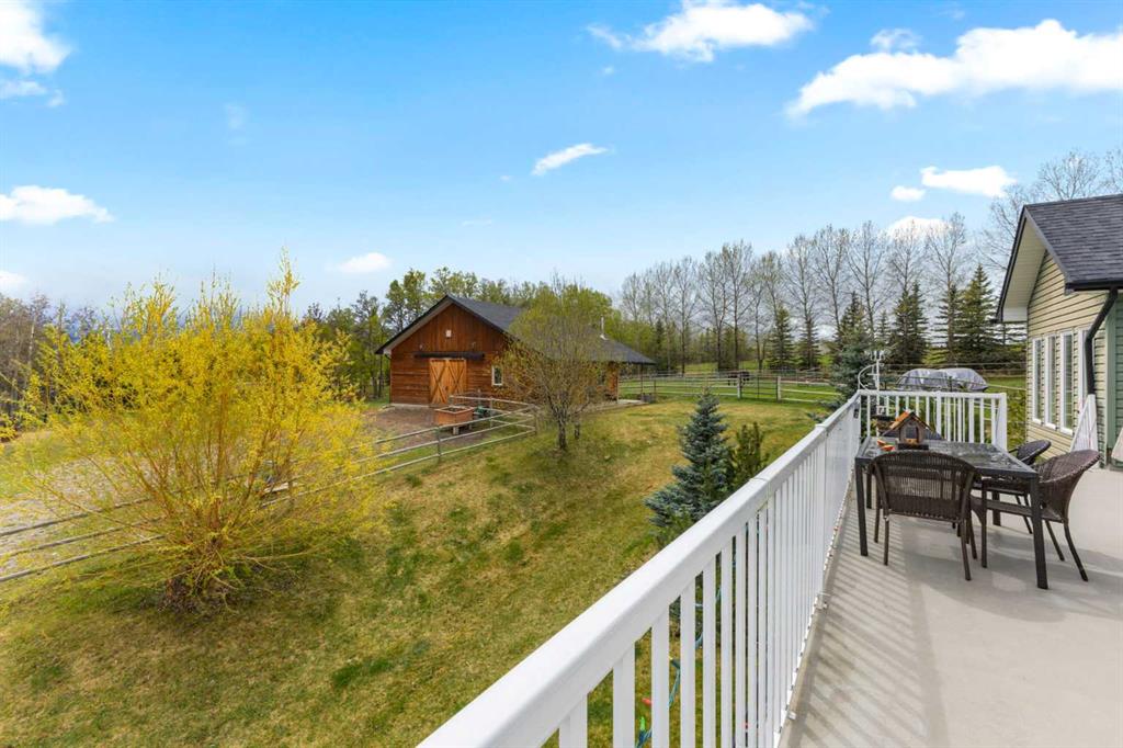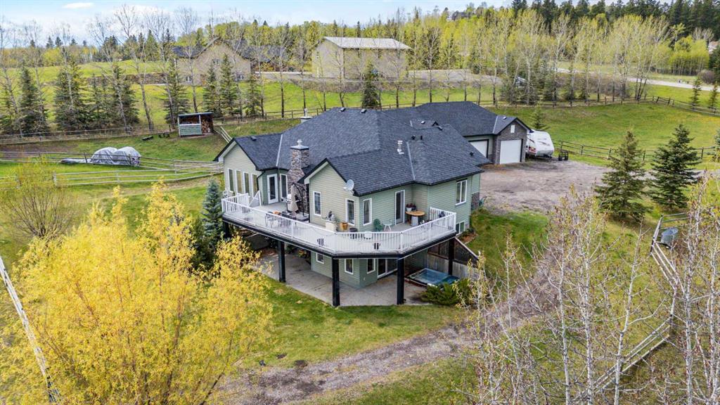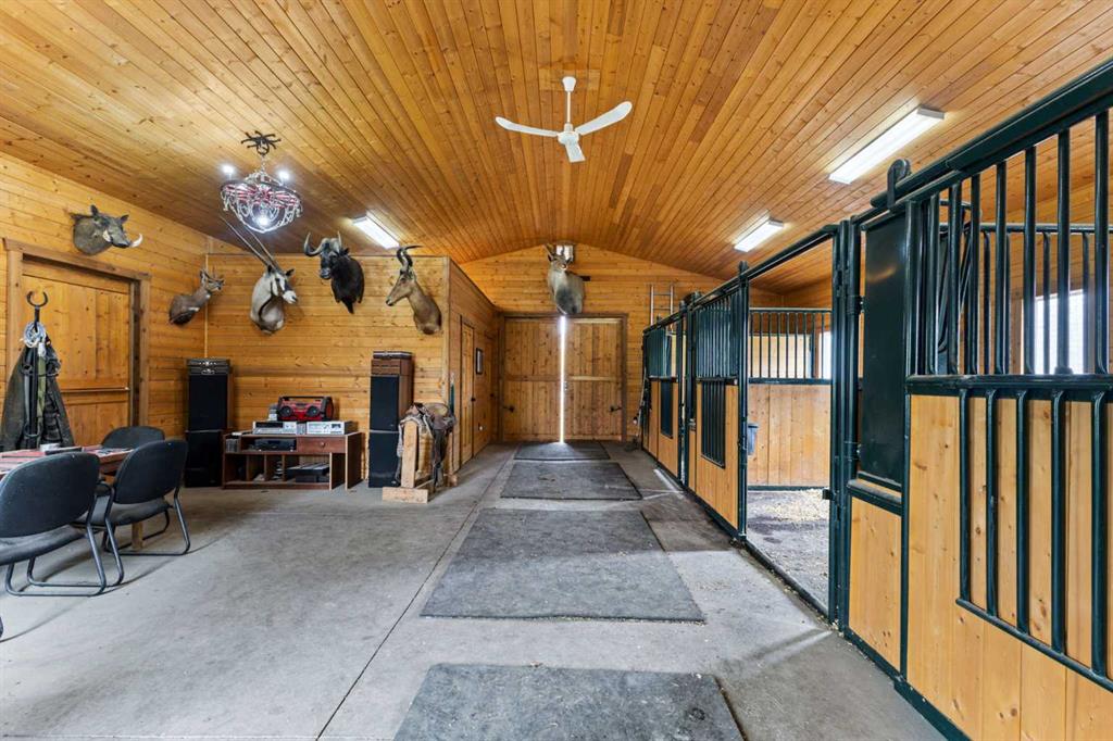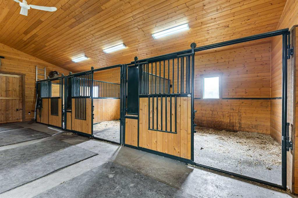 Nestled in the coveted community of Priddis, this beautifully maintained 4-acre property offers the perfect fusion of refined country living and urban convenience. Complete with a fully developed walk-out bungalow, an impressive garage/workshop, and a premium 3-stall barn (easily convertible into a workspace or car showroom), this property is ideal for horse lovers, hobbyists, and professionals alike. The well kept bungalow features over 3,500 sq. ft. of developed living space. Upon entry, you’re welcomed by a private office with French doors and custom built-ins. The open-concept main level is filled with natural light and showcases rich hardwood floors that flow through the expansive living room, dining area, and great kitchen. A cozy gas fireplace anchors the living room, while the kitchen impresses with a central island, granite countertops, stainless steel appliances (including a gas cooktop), ample cabinetry, and a walkthrough pantry that connects to the laundry and mudroom. Step out from the dining area onto the expansive upper deck and take in panoramic views of your pastures and stunning barn—an ideal space for morning coffee or evening relaxation. The main level is complete with a luxurious primary retreat, featuring a gas fireplace, private access to the deck, a spacious walk-in closet, and a spa-inspired 5-piece ensuite with in-floor heating, double vanities, a soaker tub, and a separate glass shower. The fully finished walk-out basement, also with in-floor heating, offers incredible versatility: a large family and rec room with a third gas fireplace, a cozy sitting area, a custom bar with mini-fridge, two additional bedrooms, a full 4-piece bathroom, and an oversized storage room. Car enthusiasts and tradespeople will love the 6-car garage, half of which has been configured into a workshop complete with electric heater, rough-ins for in-floor heating, and extensive cabinetry and shelving. Outside, the equestrian facilities are truly exceptional. You’ll find: Three fenced pastures (one with an automatic waterer); A round pen; Two horse shelters; Designated trailer/parking space, A stunning 1035+ sq. ft. barn, constructed with premium materials (replacement value upwards of $250K). The barn features Hi-Hog stalls, a tack room, feed room, storage space, water hydrant, and a cozy wood-burning stove. Enjoy peaceful mornings and breathtaking sunsets from the private barn deck overlooking the serene landscape. Additional highlights include a seasonal stream with beautiful stonework flowing through the property, complete and perimeter fencing and cross-fencing, Unique Zoning Advantage: This is the only property on the cul-de-sac zoned to allow animal units—setting it apart from all surrounding neighbors. All this, just 20 minutes to South Calgary, 10 minutes to Bragg Creek, and with easy access to Kananaskis Country and the Rocky Mountains. Don’t miss out—your perfect acreage lifestyle awaits!