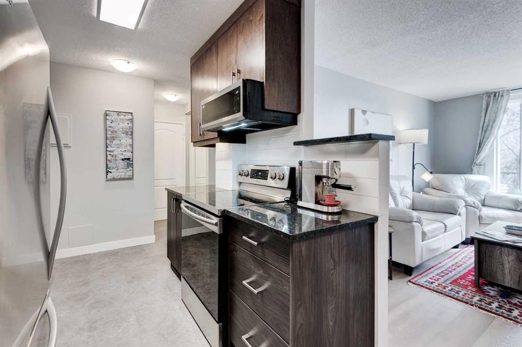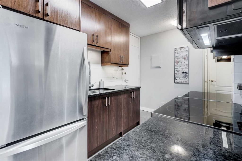 Welcome to this bright SOUTH-FACING condo in the heart of Calgary’s vibrant Beltline. Perfectly located just steps from the shops, restaurants, and cafés of 17th Avenue SW, this home offers the ideal blend of city living and everyday comfort. Inside, you’ll find NEW LUXURY VINYL PLANK FLOORING, NEW STONE PLASTIC COMPOSITE (SPC) FLOORING in the kitchen & QUARTZ COUNTERTOPS THROUGHOUT, giving the space a clean, modern feel. The open living and dining area is perfect for relaxing or entertaining, with UPGRADED LIGHTING and NEWER PAINT that adds a fresh touch throughout the home. The kitchen also features a new microwave and plenty of functional space for cooking and storage. The large bedroom offers a generous closet and overlooks mature trees, creating a surprisingly quiet and peaceful setting right in the city. Step outside onto the long, private south-facing balcony—an ideal spot for morning coffee or unwinding at the end of the day. AAdditional features include a convenient washer/dryer combo located in the IN-SUITE STORAGE room, a NEW BATHTUB with updated bathroom flooring, in-suite fibre optics, and the solid construction of a well-maintained CONCRETE BUILDING. The building has also seen recent upgrades, including vinyl windows replaced approximately two years ago. This unit comes with an assigned STORAGE UNIT & an assigned COVERED PARKING STALL. There is also free street parking on 13th Avenue. The building is professionally managed for peace of mind. Enjoy the convenience of being within walking distance to two LRT stations, grocery stores including Community Natural Foods, and all the energy and amenities that make the Beltline one of Calgary’s most sought-after neighbourhoods. City living, quiet comfort, and an unbeatable location—this condo is ready to welcome you home!