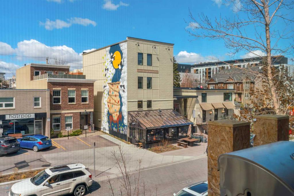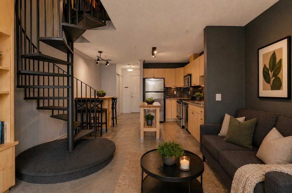 2 PARKING STALLS ....Perched on the top level in the heart of vibrant Marda Loop, this distinctive loft-style condo offers an elevated blend of urban energy and modern design. Just steps from boutique shopping, cafés, transit, and a lively mix of restaurants and pubs, the location is ideal for those who appreciate walkability and a quick, seamless commute to downtown. Inside, the space is defined by its airy, open-concept layout and industrial-inspired character. Soaring vaulted ceilings and expansive windows enhance the sense of volume, while polished concrete floors with in-floor heating add both comfort and contemporary edge. Thoughtfully integrated built-ins and a striking spiral staircase contribute to the home’s unique architectural appeal. The kitchen is both functional and stylish, featuring stainless steel appliances, sleek European-style cabinetry, warm maple accents, and a rich, dark subway tile backsplash. A movable butcher block island offers flexibility for prep and entertaining, while the adjacent dining area is cleverly designed with a built-in table—perfect for maximizing space without sacrificing style. The living area is bright and inviting, anchored by a custom entertainment unit and access to a private balcony—an ideal spot to unwind or enjoy a morning coffee. Upstairs, the lofted primary retreat provides a cozy yet open feel, complete with a built-in desk for work or study. A well-appointed 4-piece ensuite and a separate laundry room that doubles as a walk-in closet add to the home’s thoughtful functionality. Adding to the appeal, this unit includes two parking stalls—one underground and one surface—along with an assigned storage locker, offering exceptional convenience and rare value for inner-city living. Stylish, refined, and full of personality, this one-of-a-kind residence offers an exceptional opportunity to experience modern loft living in one of Calgary’s most sought-after neighbourhoods.