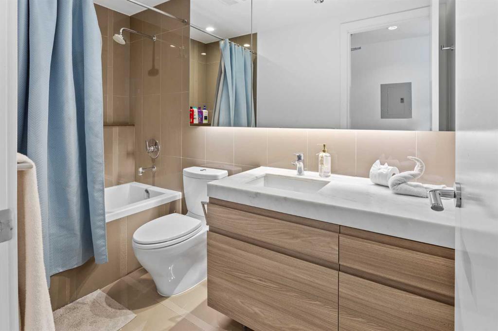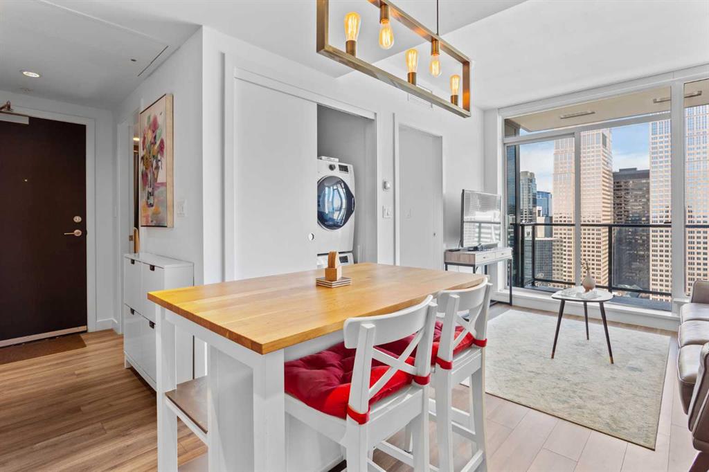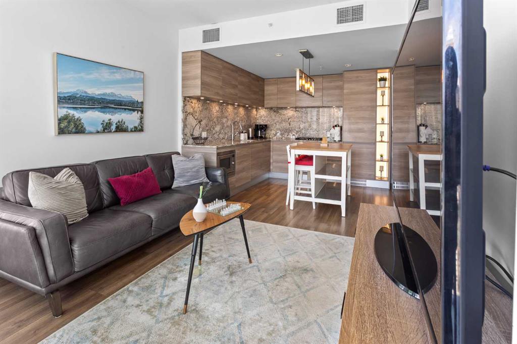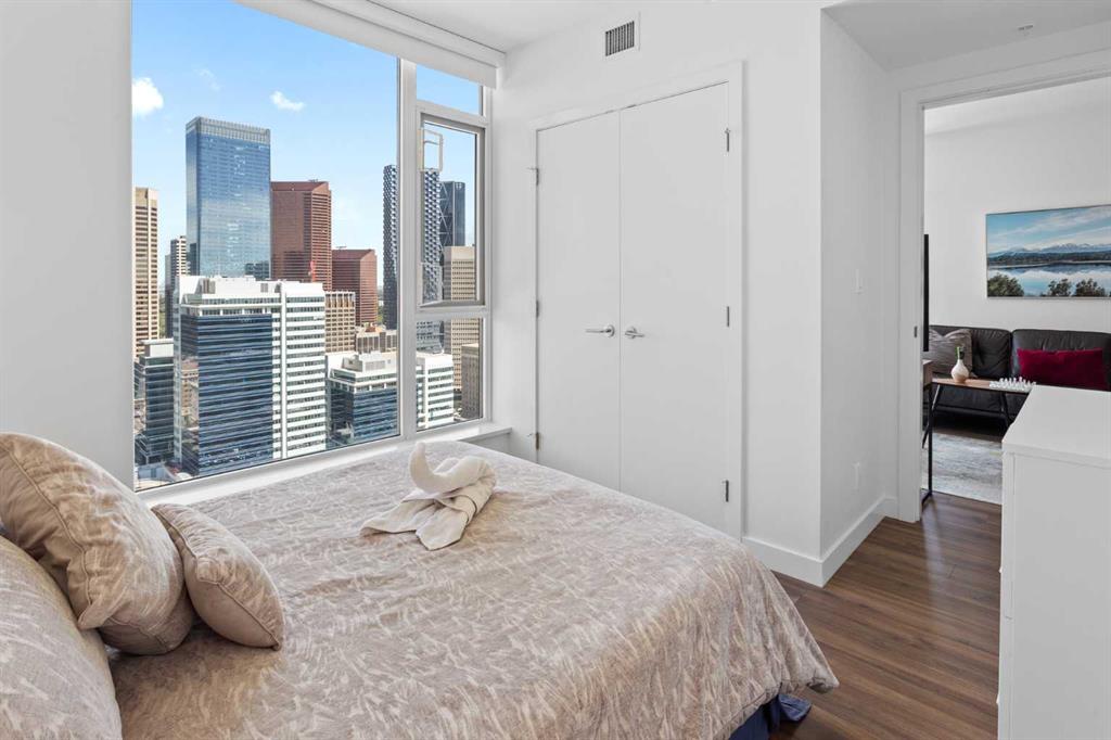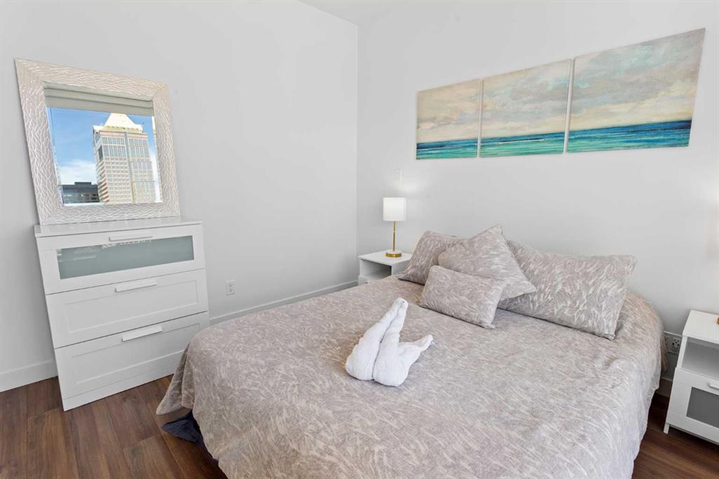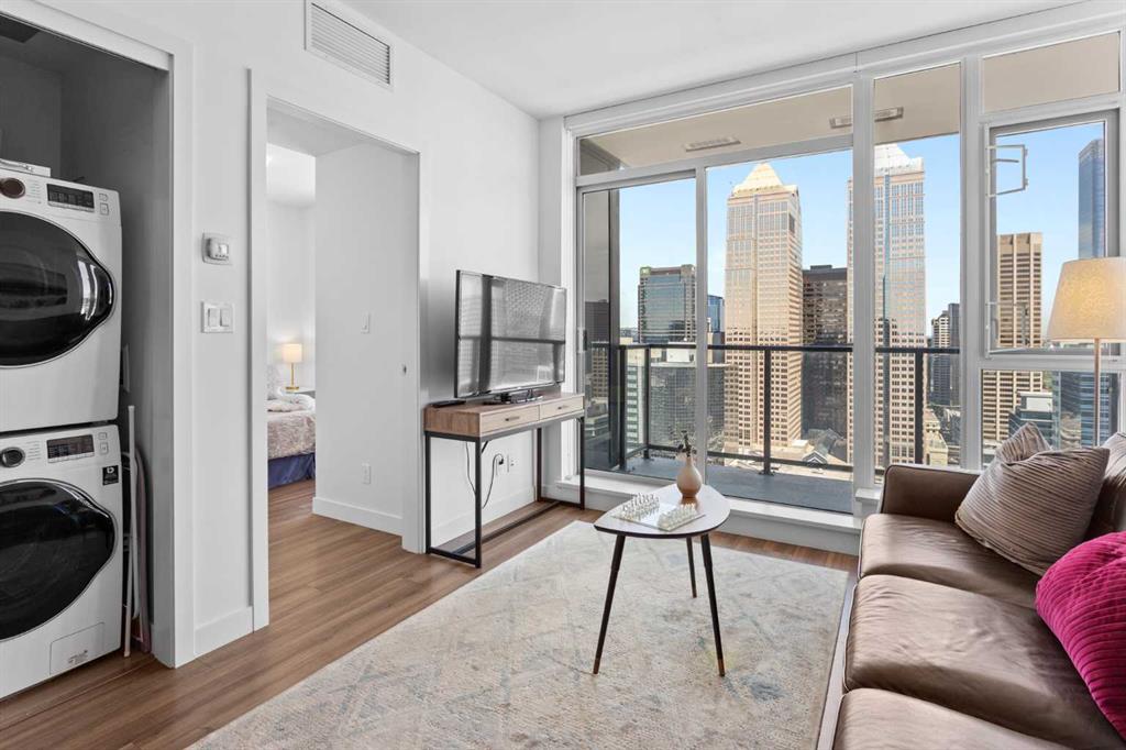 Experience elevated downtown living at Park Point – one of Calgary’s most prestigious high-rise residences, ideally located in the heart of the Beltline. This immaculate, like-new one-bedroom condo offers stunning, unobstructed views of Central Memorial Park and the vibrant cityscape beyond. Flooded with natural light and designed with warm, modern tones, the home exudes a welcoming and stylish ambiance you'll love coming home to. Enjoy year-round comfort with central air conditioning and floor-to-ceiling windows, complemented by resilient laminate flooring throughout. The sleek, open-concept kitchen is both functional and elegant, featuring built-in stainless steel appliances, granite countertops, and a full-height matching backsplash – perfect for both everyday living and entertaining. Retreat to the spacious bedroom where you can wake up to beautiful skyline views, and unwind in the luxurious bathroom complete with a deep soaker tub, oversized vanity, and contemporary fixtures. Perched on the 31st floor with desirable north exposure and soaring 8-foot ceilings, this unit offers breathtaking panoramic views and a peaceful escape above the city buzz. Park Point’s premium amenities include concierge service, fitness centre, sauna, and beautifully landscaped outdoor spaces, elevating your urban lifestyle. Whether you're a first-time buyer, investor, or a professional seeking the convenience of walking to work, this is a rare opportunity to own in one of downtown Calgary’s most sought-after developments. Don't miss out – book your private showing today!