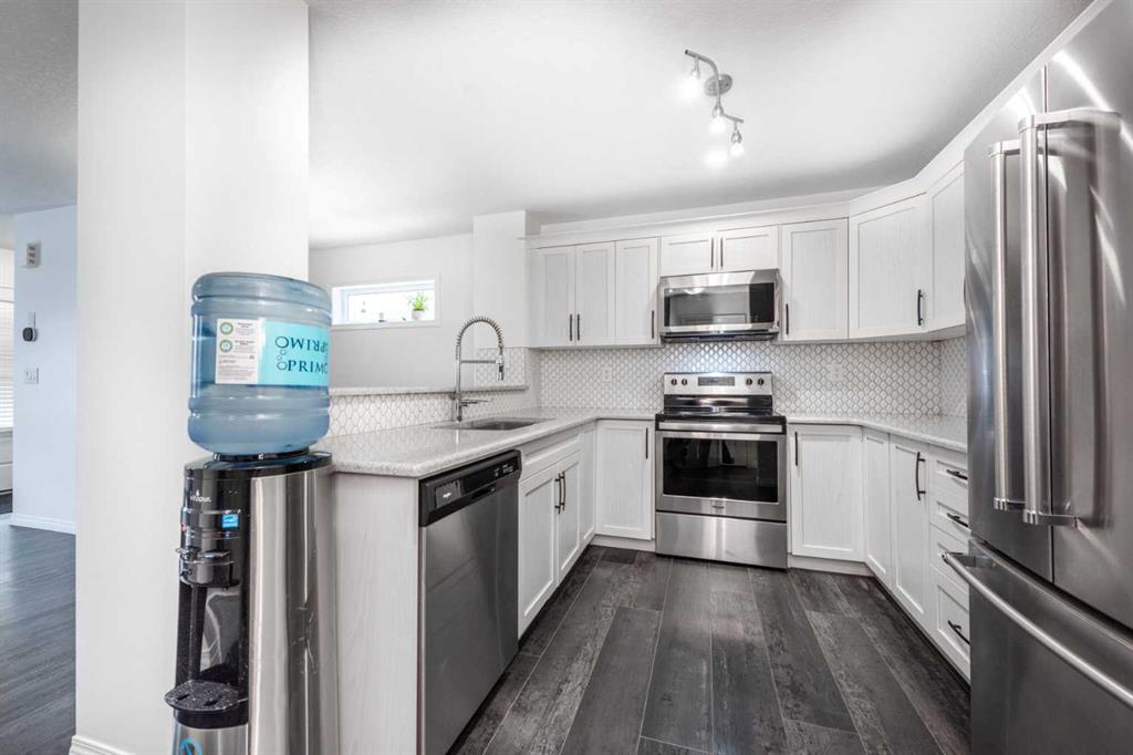 Step into modern living with this beautifully designed NO CONDO FEE end-unit townhome, offering exceptional style, function, and value. With 3 bedrooms, 2.5 bathrooms, and over 1,408 sq. ft. of thoughtfully finished living space, this home stands out with its impressive curb appeal and premium interior upgrades. A bright, open-concept main floor welcomes you with a seamless flow between the kitchen, dining, and living areas—perfect for everyday living and effortless entertaining. The upgraded kitchen features: Full-height raised cabinets Stainless steel appliances Quartz countertops Large pantry closet Expansive counter space and storage The main level is finished with luxury vinyl plank flooring, additional pot lights, and a convenient 2-piece bathroom, plus direct access to the double attached garage. Upstairs offers a thoughtfully separated layout for privacy and comfort. The spacious primary bedroom includes a walk-in closet and a beautifully upgraded 3-piece ensuite with a large tiled walk-in shower. A central bonus room creates separation from the additional two bedrooms—ideal for families, guests, or a home office. A full laundry room and another 4-piece bathroom complete the upper level. Perfectly situated close to everything you need, this home offers unbeatable accessibility to: Somerset LRT Station Major commercial districts including IKEA, the Tsuut’ina Costco, Southcentre amenities South Health Campus Hospital Easy access to major roadways for quick commuting This exceptional property combines style, convenience, and tremendous long-term value—all without condo fees. Your perfect home awaits. Book your private showing today!