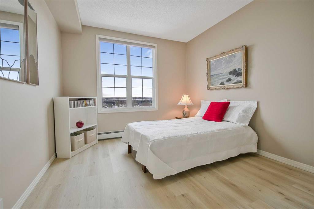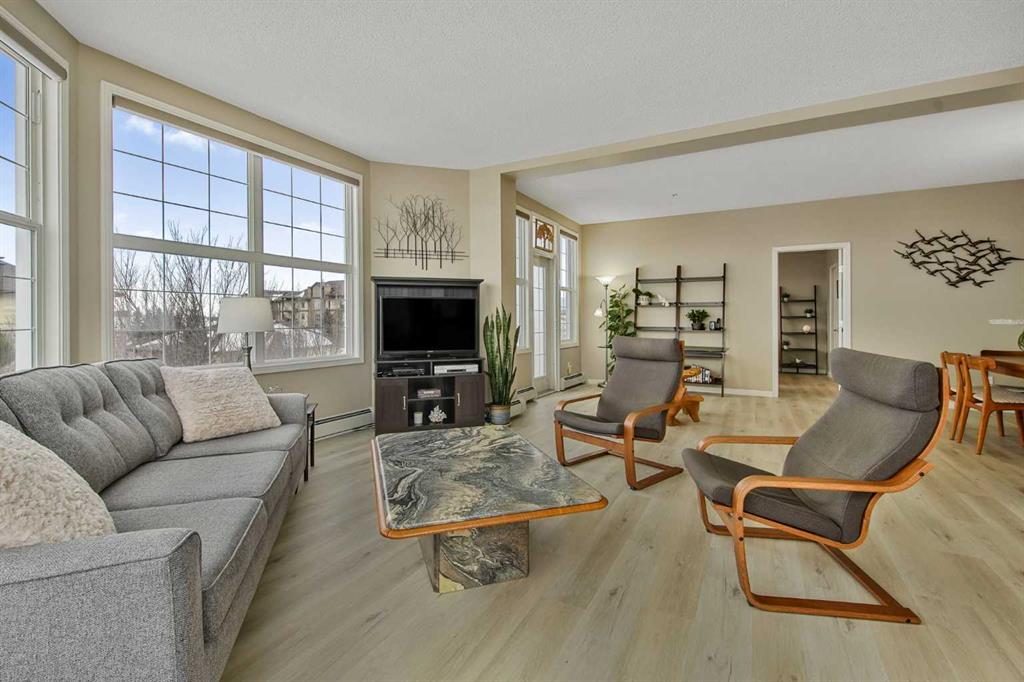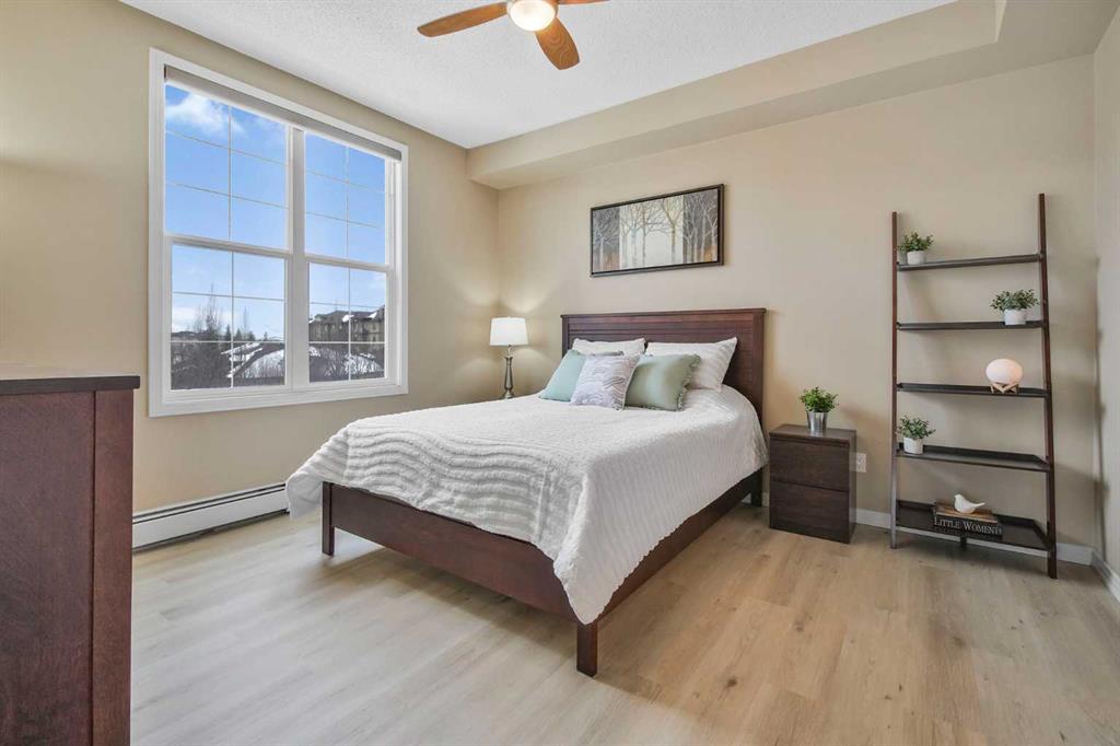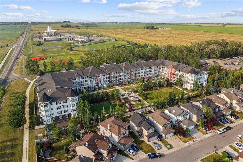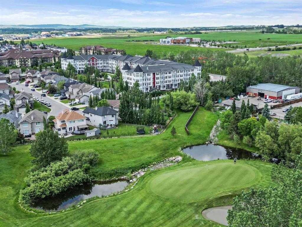 VIEWS, VIEWS & MORE VIEWS! The wow factor this home presents the moment you walk through the door is undeniable. Expansive windows draw your eye immediately to sweeping town and valley views stretching toward the mountains while filling the home with natural light, creating a space that feels both elevated and incredibly inviting. Offering OVER 1,200 sq ft, this beautifully maintained 2 bedroom, 2 bathroom residence combines spacious design with LOCK & LEAVE CONVENIENCE. Thoughtfully updated with luxury vinyl plank flooring, granite countertops and backsplash, PREMIUM REMOTE HUNTER DOUGLAS BLINDS worth over $12,000, and a new oversized Samsung refrigerator. The open layout supports both comfortable everyday living and effortless entertaining. The generous living and dining area feels more like a bungalow than a typical condominium. The living space extends effortlessly onto the private balcony, enhanced by a custom retractable sliding screen doors allowing seamless indoor outdoor living. The kitchen sits at the heart of the home with ample cabinetry, functional workspace and a seamless connection to the main living area, allowing you to remain part of the conversation while preparing meals or hosting guests. The primary suite is a true retreat with walk in closet and private ensuite, while the second bedroom offers flexibility for guests, a home office or hobby space. Located in the highly sought after Penncross complex in Crystal Green, residents enjoy a quiet, exceptionally well managed building distinguished by its unique architectural design, with charming rooflines, varied elevations and a courtyard centered layout creating visual character and a true sense of community. Amenities include themed common areas on each floor, a well equipped fitness room, beautifully maintained courtyard with outdoor BBQ area, TWO TITLED HEATED UNDERGROUND PARKING STALLS, assigned storage and elevator access. Just steps from Crystal Ridge Golf Course and with YEAR-ROUND LAKE PRIVILEGES at Crystal Shores Lake including swimming, skating and recreation, this location offers an exceptional lifestyle balance of recreation, tranquility and convenience. Whether downsizing, relocating or simply seeking a brighter place to call home, this standout property represents one of the most desirable condo opportunities currently available in Okotoks. AND YES… THE VIEWS REALLY ARE THAT GOOD.