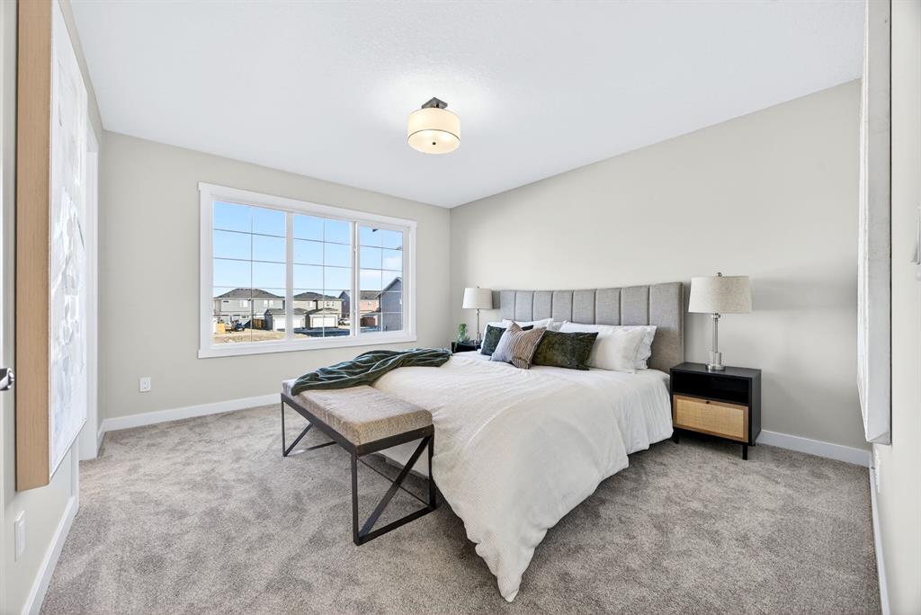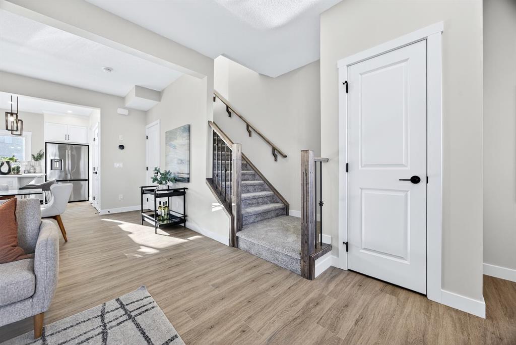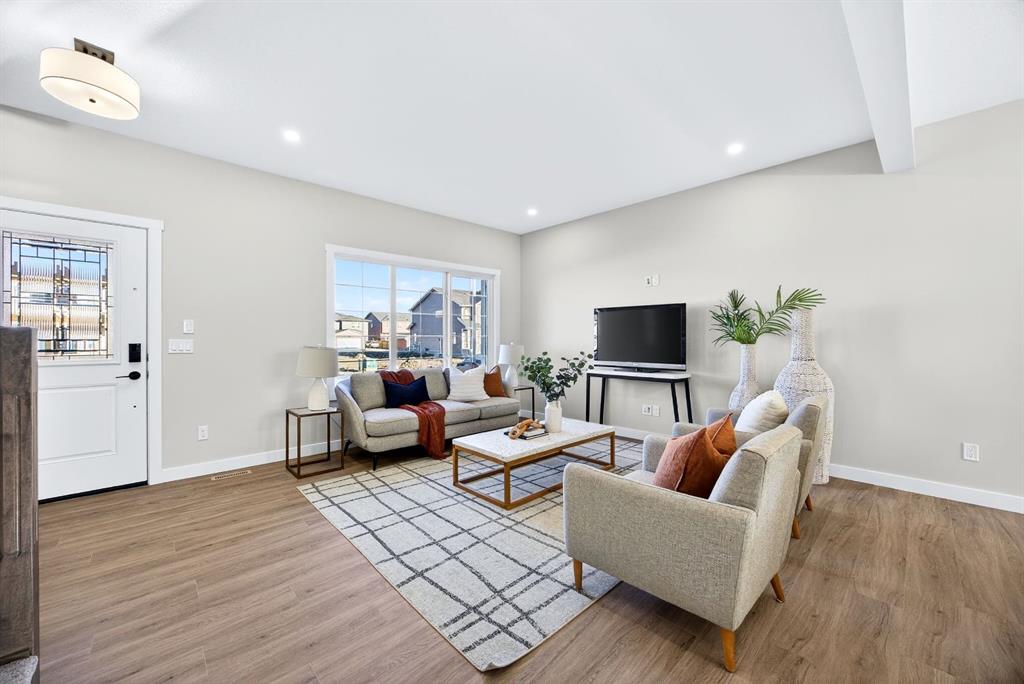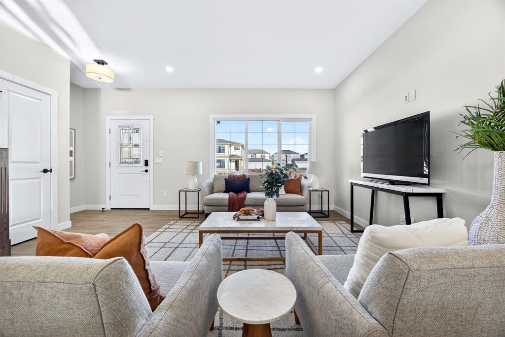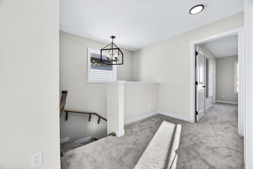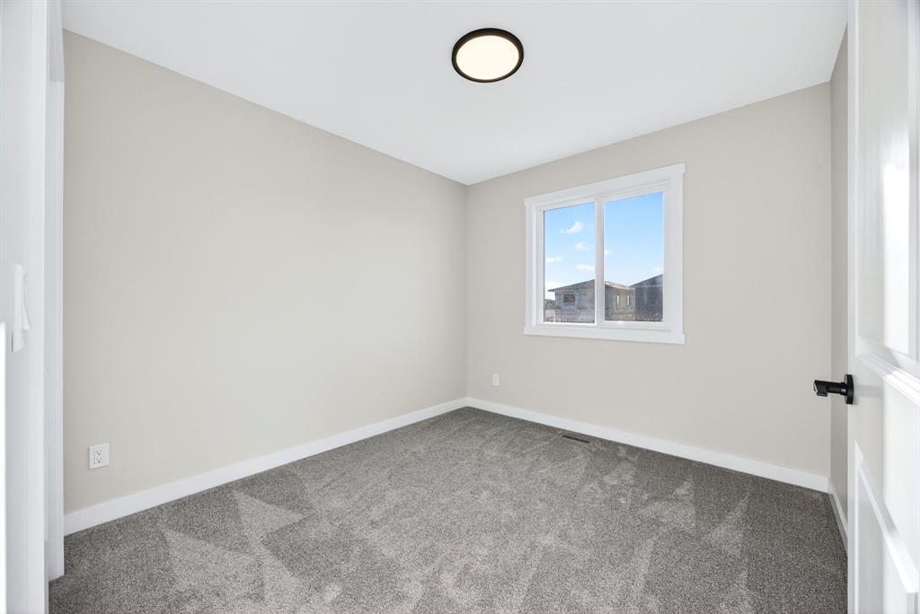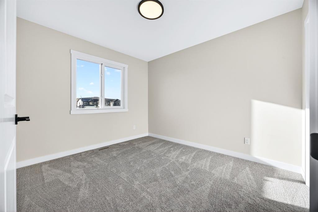 Welcome to this stunning, brand-new Genesis Builders duplex. The "Oscar" offers modern design, functional living, and exceptional future potential with basement suite rough-ins "legal suite subject to approval and permitting by the city/municipality", all complemented by a warm, inviting colour palette that creates a welcoming atmosphere throughout the home. Featuring 3 bedrooms and 2.5 bathrooms, this home is thoughtfully crafted and offers over 1400 sq ft. The main floor showcases a bright, sun-filled floorplan with 9' ceilings and a seamless open-concept layout, connecting the spacious living room, central dining area, and stylish kitchen. The kitchen is beautifully appointed with quartz countertops, two-toned cabinetry, a large central island, and a sleek stainless steel appliance package, complete with a gas line to the range. A convenient powder room completes the main level. Upstairs, the primary suite is a private retreat featuring a generous walk-in closet and a spa-inspired ensuite with his-and-hers sinks and an oversized shower. Two additional well-sized bedrooms, a full bathroom, and convenient upper-floor laundry complete the second level. The unfinished basement offers incredible flexibility with 9' ceilings, a separate SIDE ENTRANCE, and BASEMENT SUITE ROUGH INs, making it ideal for additional living space or future income potential. Outside, the backyard is a blank canvas, ready for your personal touch and offering the opportunity to build your dream garage. Located in the vibrant and family-friendly community of Fireside, this home offers the perfect balance of small-town charm and modern convenience. Fireside is known for its extensive pathway system, parks, playgrounds, and green spaces, ideal for walking, biking, and outdoor enjoyment. Residents love the easy access to schools, shops, restaurants, and everyday amenities, all just minutes away. With quick access to Highway 22 and Highway 1, commuting to Calgary or heading west to the mountains is effortless. *Taxes have not been assessed. Photos are representative of the same model. This property's colour palette is included in the pictures. RMS has been applied to the builder's construction drawings.