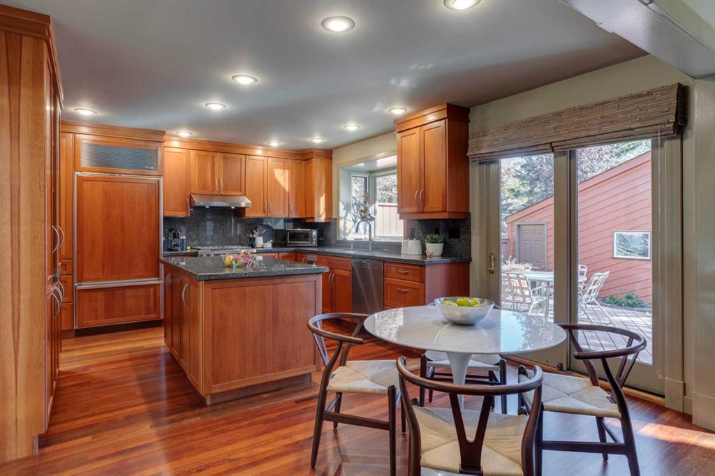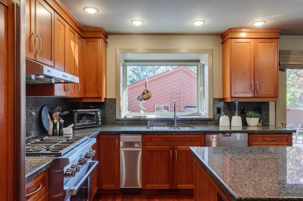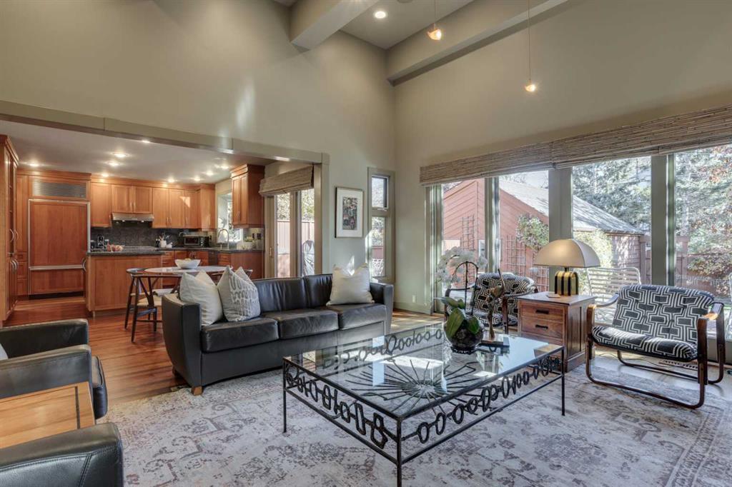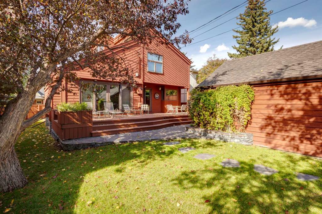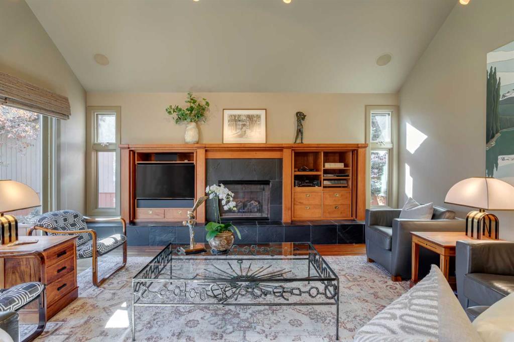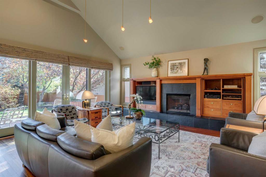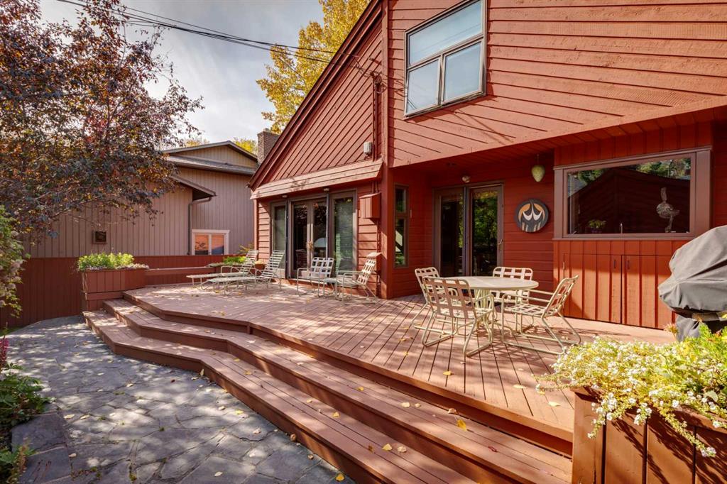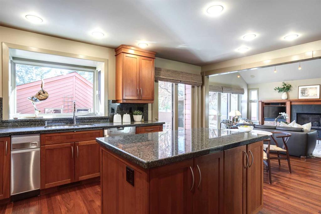This modern-architectural family home offers an unbeatable location in the heart of West Elbow Park on a quiet street. The community centre is at the end of the block with tennis, basketball, skating, playfield and an off-leash area. Just over a block to Elbow Park School with other top schools close by. Also a quick walk to The Glencoe Club and the river pathway system for walking and biking. Large 50’ x 125’ (6243 sq ft) lot. Architect Robert Miller designed this significant home which incorporates site-specific design to capture maximum natural light and provide exciting spatial volumes. Very much a “Dwell Magazine” vibe. Over 3600 square feet total development with 4 bedrooms and 3.5 baths. Expansive main floor plan with living room and dining room at the front to host family and friends while enjoying the wood-burning fireplace, wet-bar and dramatically vaulted ceilings. Open plan across the rear overlooking the yard. Newer high-end kitchen with great workspace, storage and top appliances (Subzero, Wolf and Miele) adjacent to a casual dining space. Large family room with vaulted ceilings, gas fireplace and built ins. Real site-finished hardwood floors run throughout. A mudroom, laundry room and 2-piece powder room complete the main level. The bright upper floor holds 3 bedrooms including a large primary suite with closet wall and renovated 3-piece ensuite with shower. 2 additional bedrooms with vaulted ceilings and a renovated house bath with soaking tub. Superior lower level…a result of the newer vintage of the home. Great windows and nice ceiling height throughout the recreation room with fireplace, large 4th bedroom, renovated bath and extensive storage. Access out from the kitchen and family room to a full width deck and fenced yard with large grassed playspace. Oversized double garage off the paved alley. A rare opportunity!