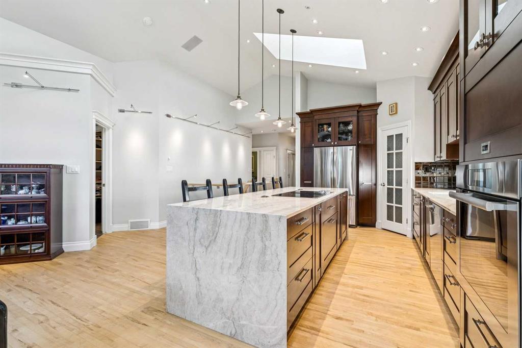 UNPARALLELED LUXURY BUNGALOW IN DISCOVERY RIDGE BACKING ONTO GREENSPACE WITH DESIGNER FINISHES & SMART HOME LIVING! This stunning 1400+ sqft bungalow with an additional 1300+ sqft of fully finished basement space offers an open-concept layout enhanced by soaring vaulted ceilings, skylights, and maple flooring throughout. The chef-inspired kitchen is a true showpiece, featuring cherry cabinetry, built-ins, instant hot water, and a waterfall marble island with cooktop and eat-up seating. Entertain in the elegant formal dining room or relax in the inviting living room with a cozy fireplace. The primary retreat boasts a luxurious 5PC ensuite and walk-in closet, while a second bedroom, 3PC bath, and convenient main floor laundry complete the level. The fully finished basement features cork flooring, a dry bar with wine fridge, spacious rec room and second living area with fireplace, plus 2 additional bedrooms and a 4PC bath. Enjoy the professionally landscaped yard backing onto greenspace with a massive deck, all tucked away on a quiet cul-de-sac surrounded by nature. Located in the highly sought-after Discovery Ridge, a prestigious west Calgary community known for its direct access to Griffith Woods Park, scenic forested pathways, Elbow River valley, and an unmatched nature-filled lifestyle just minutes from the city.
