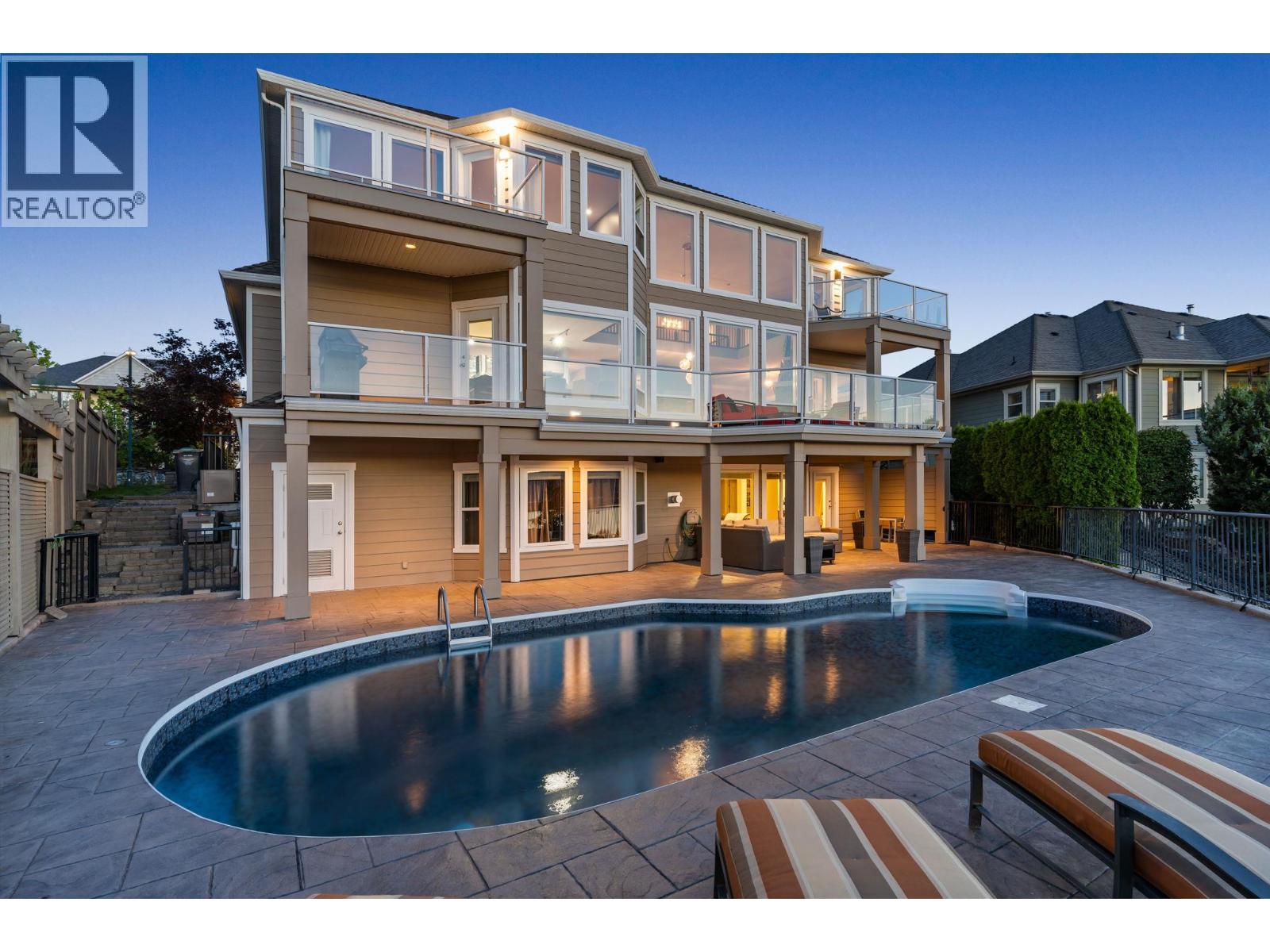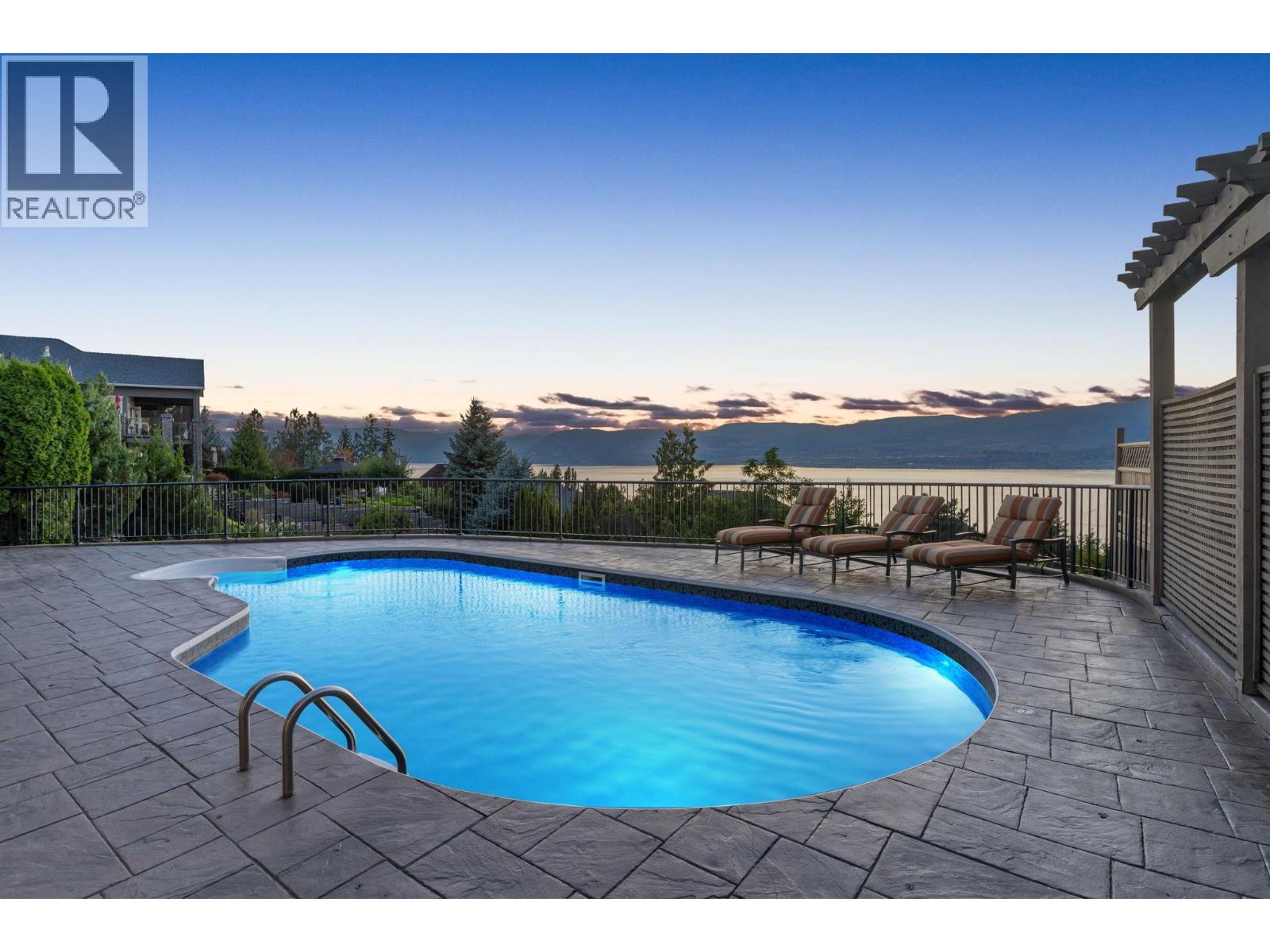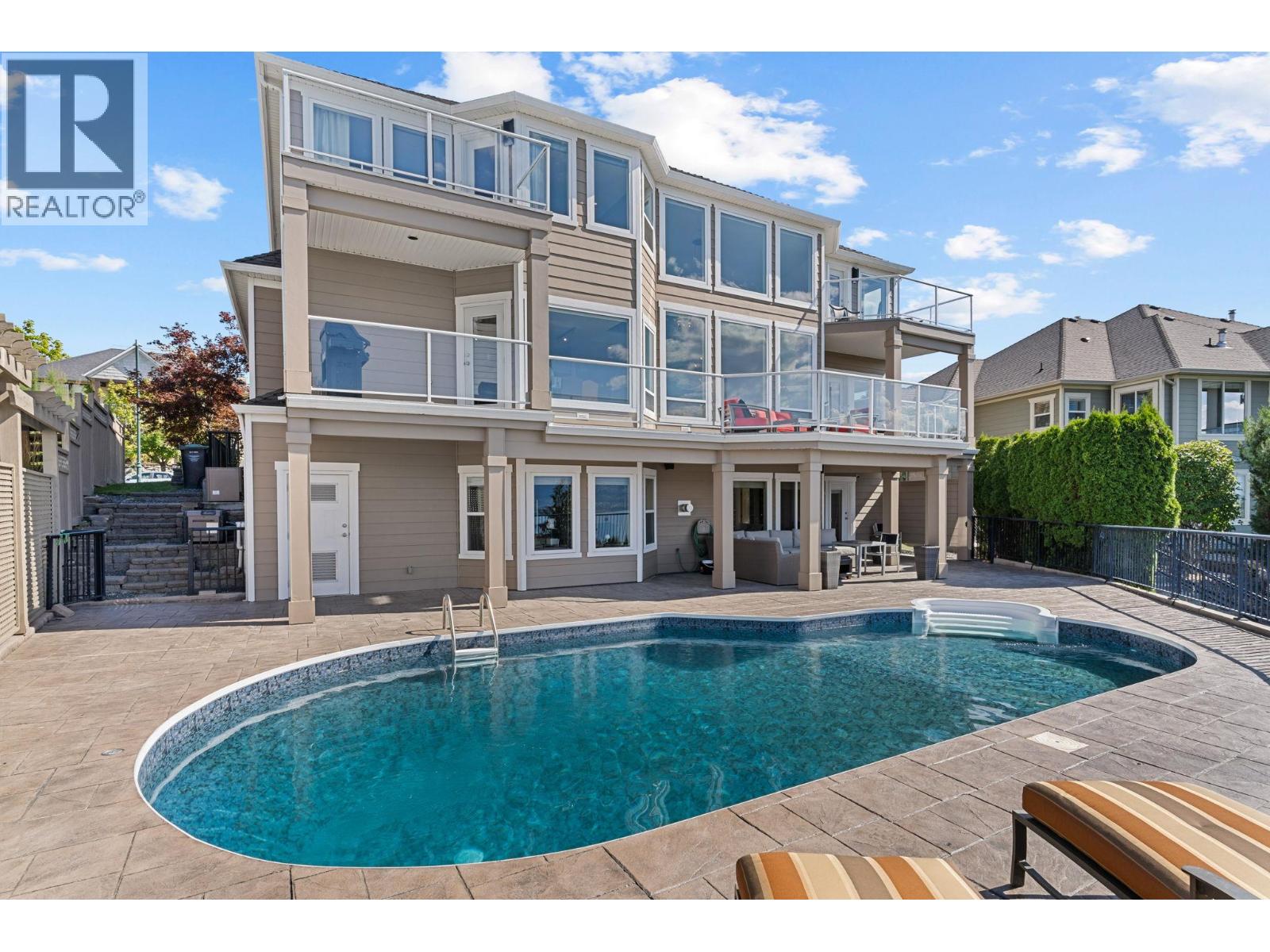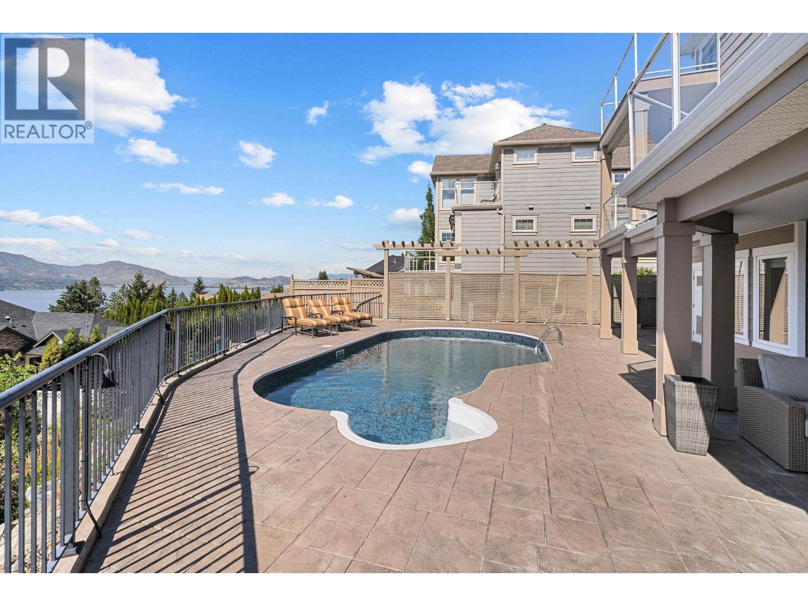 Welcome to this stunning, freshly painted, 5 bed, 4.5 bath home located on the ""Ledge"", distinguished homes on Quilchena Drive facing the Lake. Located in the heart of Kettle Valley. No hills, no worries, luxury, light, and lifestyle come together. Designed to impress, this residence features expansive open-concept living with panoramic lake views from every floor. Massive 20 foot ceilings flood the home with natural light, framing the Okanagan at its finest. There are three full bedrooms upstairs highlighted by a 625 square foot master suite. The chef-style kitchen flows seamlessly into the main living and dining areas perfect for entertaining or quiet evenings at home. Step outside to your private backyard oasis complete with a beautiful pool, sun-soaked patio, and views that truly make this the best lot on the street. The walk-out basement offers flexible space, including a dedicated gym room, media area, and guest suite potential. Every detail in this home is thoughtfully designed for upscale family living. All this on a flat street just steps from Kettle Valley Park, and 5 minute walking distance to grocery stores, schools, and amenities. Homes with this combination of design, location, and view rarely come to market.