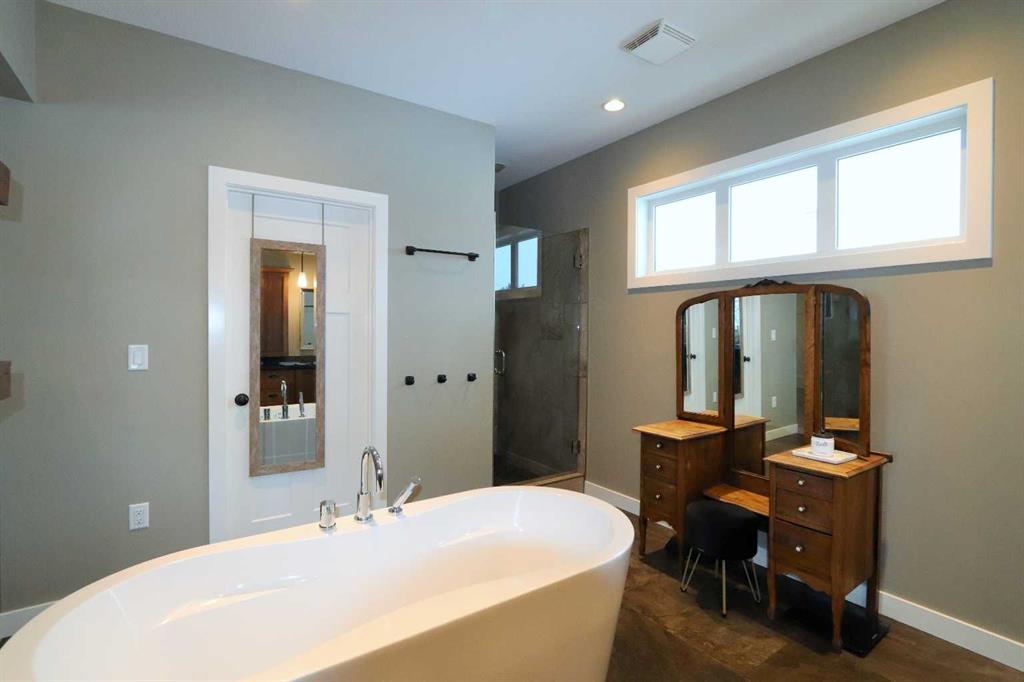 Discover this impressive modified bi-level situated in a highly desirable Riverside location. Designed with comfort and functionality in mind, the open-concept main living area features 9-ft ceilings throughout and a raised ceiling in the living room, adding to the sense of space and showcasing the striking floor-to-ceiling stone fireplace. The kitchen offers an ideal layout for everyday living and entertaining, complete with a large island, quality granite countertops, pantry and stainless steel appliances. The main floor includes two well-appointed bedrooms and a full bathroom, while the stunning primary suite is set just a few steps up for added privacy. This retreat features barn-style tracked doors, a spacious walk-in shower, large vanity, walk-in closet, and a beautiful freestanding tub positioned as the focal point of the spacious ensuite. The fully finished basement with in-floor heat expands the living space with a bright family/rec room, thanks to generous windows that fill the area with natural light. In-floor heat adds welcome comfort and efficiency. A fourth bedroom and an additional full bathroom complete the lower level. Enjoy the back yard with maintenance-free vinyl fencing, a large play area for kids, and relax or entertain on lower deck or covered deck off the dining area. The 24×26 heated attached garage has an epoxy floor coating, other recent upgrades include new shingles and siding in 2023. There's an additional electrical and gas services should you wish to build a second garage. This property combines thoughtful design, modern comfort, and an unbeatable location—truly a place to call home.