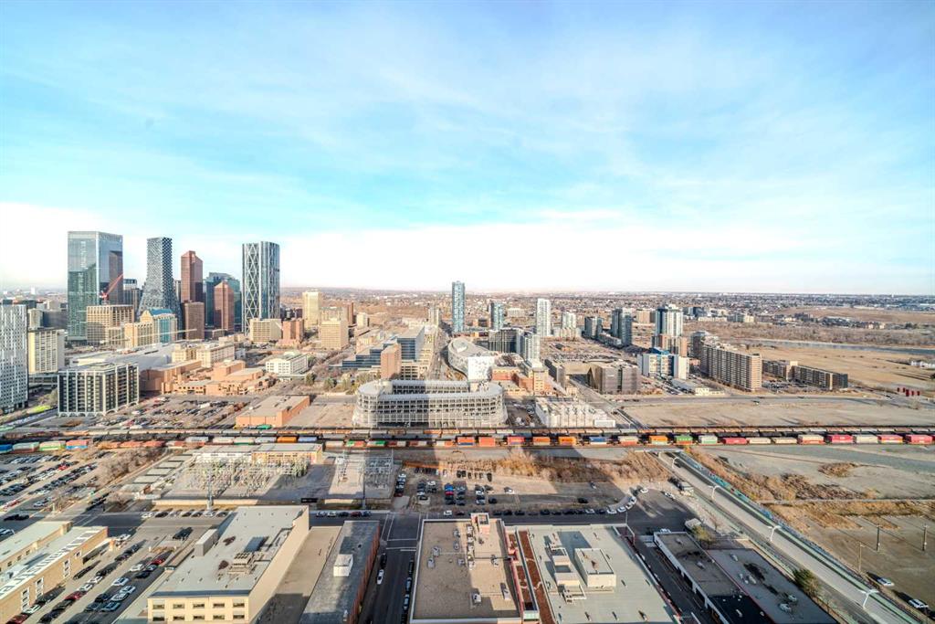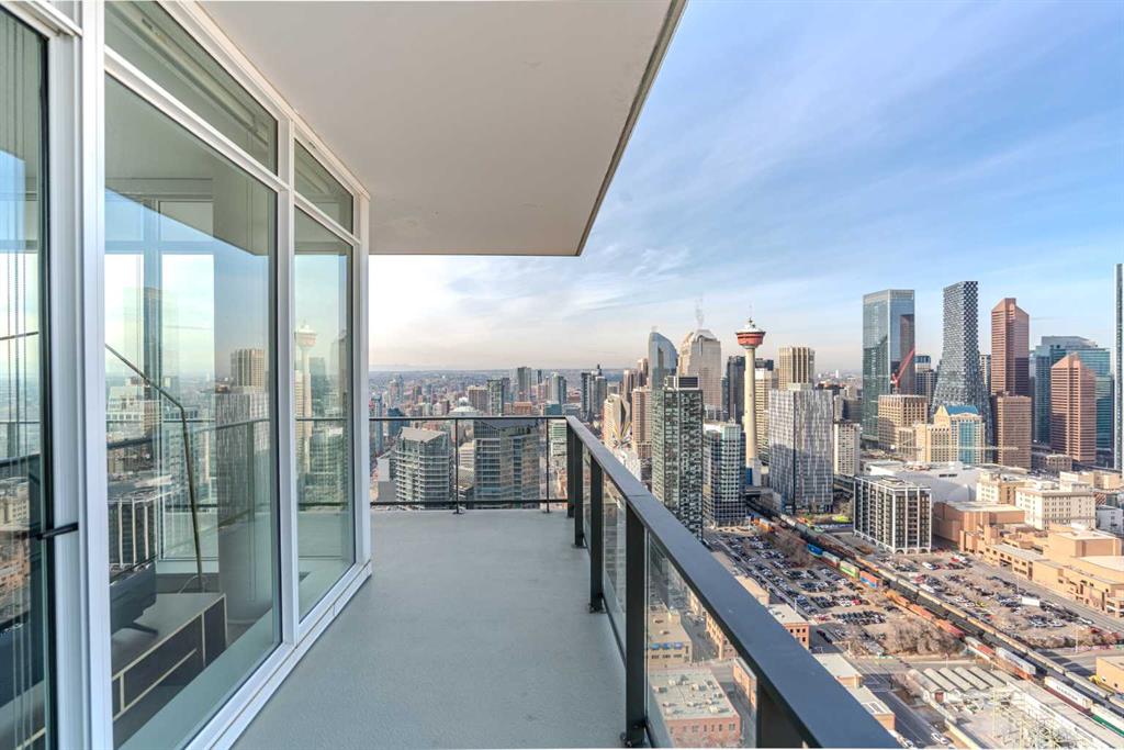 Welcome to The Guardian, Calgary’s prestigious and tallest residential tower. This remarkable, triple-mint condition 40th-floor residence offers an exclusive opportunity to experience luxury living high above the city. Featuring 1,739sq.ft., 2 bedrooms + den, 2.5 bathrooms, and soaring 9’6” ceilings, this sub-penthouse home showcases exceptional quality and design. Enjoy unobstructed, panoramic views of both the downtown skyline and the majestic Rocky Mountains through floor-to-ceiling windows that flood the home with natural light. The north-west exposure is completely un-obstructed corner to corner, ensuring privacy and an incredible backdrop to every room. A expansive wraparound balcony comes complete with natural gas connection. The sleek, modern kitchen is equipped with Miele appliances and premium Armony Cucine cabinetry from Italy, complete with a sophisticated silent-close system found throughout the kitchen and both ensuites. The versatile den offers the perfect space for a home office or additional living area. Each ensuite is beautifully appointed with travertine tile, a rain shower, hand-shower bar, and a soaker tub for ultimate relaxation. The Guardian’s premium amenities elevate your lifestyle: a state-of-the-art fitness centre and workshop on the 6th floor, plus an expansive social lounge on the 7th floor that opens to a large outdoor terrace. Additional titled underground parking stalls are also available for purchase. Convenience is unmatched with ZCREW Café on the main level and the nearby community space featuring sport courts, an off-leash dog park, and EV charging stations. You’re just steps from dining, entertainment, bike paths, the Stampede grounds, and the upcoming new event centre—placing you at the centre of it all. Be sure to explore the virtual tour to fully appreciate the craftsmanship and breathtaking views. Book your private showing today and experience the luxury and elegance of this remarkable unit.