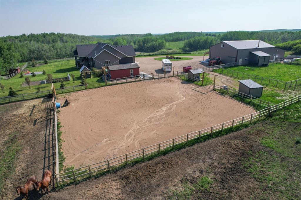 WELCOME TO ALBERTA! On offer is an immaculate acreage nestled in the hills of beautiful No. 6 Stettler County for those who want to spend their days in the epitome of western luxury. At over 4100 square feet of living space between the main level and walkout basement, no expense was spared in its premium finishes and masterful design. The grand entry makes a statement showcasing outstanding works of art, welcoming you through into the open concept kitchen and living area. Be awestruck by the gorgeous custom cabinetry, quartz counter tops, gas fireplace and covered balconies: one for visiting, the other just off the kitchen for barbecuing. Ultra high end stainless appliances including a gas cooktop, built-in oven and convection microwave, dishwasher and refrigerator and even a wine fridge tucked under the end of the sit-up island. A micro office hidden off to the side is very practical and very cool, the walk-in pantry at the other end checks off all the boxes to make this a dream kitchen. Vistas to the North, West & East incorporate the beautiful natural surroundings into your day. The Master is the gem we'd expect in a home of this calibre, dual vanity ensuite with walk in shower and walk-in closet. Spacious second bedroom on the main floor conveniently next door to the main floor bathroom. If the kitchen is the heart of the home, this basement is the pulse with a central family room ideal for entertaining with the pool table, wet bar and adorned with more brilliant artwork! Out on the patio for a quick dip in the hot tub and then back inside to the suite on the north end, or the pair of bedrooms on the south to tuck in for the night, even though we can't technically call the one bedroom a bedroom because the windows are solid. Massive three car garage set up to keep the vehicles clean and pristine and the SideXSide or ATV's in their own space, complete with its own washroom bringing the house total to 5. Out to the shop and you'll find everything needed for a hotblooded North American! 40X60', in-floor heat, totally finished and looking like a showroom for the tools. The office, a touch of class, with a bonus rec. room upstairs for a multitude of uses. A wood burning stove in the centre of it to keep things cozy or act as a backup heat source. A 20' lean-too built off the end for covered storage and a 10X20' overhang added on the front for a western flare while keeping the rain and mud away from the front door with the help of a new concrete skirting at the shop. Excellently set up for horses complete with outdoor riding arena, built in-shelter in the NW corner of the shop, covered hay storage and many paddocks + sheds & water bowls! The whole property is cross fenced, and the north field produces good hay. Even the greenhouse looks like it belongs in a magazine! The regional water line services the house and a good well takes care of the yard & stock. Lastly, multiple spots to have a bonfire and howl at the moon in the rolling hills of this 9.88 acre Masterpiece!