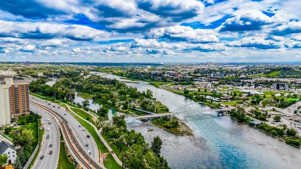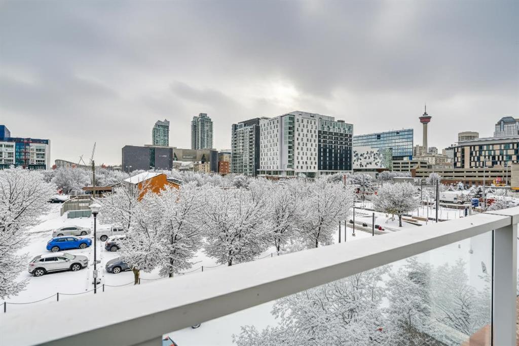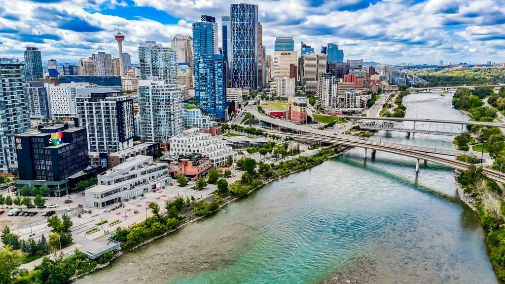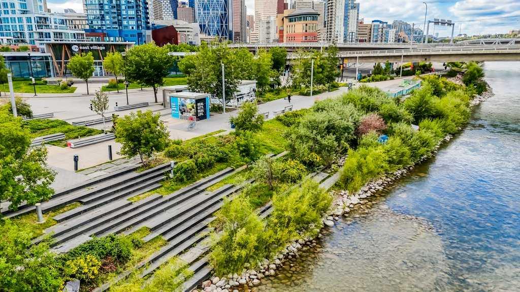 Welcome to Evolution in Calgary’s Vibrant East Village – where contemporary design meets urban convenience. This stunning two-bedroom, two-bathroom residence offers 872 square feet of thoughtfully designed living space in one of the city’s most dynamic and fast-growing communities. From the moment you step inside, you’re greeted by a bright, open-concept floor plan that blends the living room, dining area, and kitchen into one seamless, light-filled space. A wall of floor-to-ceiling windows floods the interior with natural light, creating a warm and inviting atmosphere while showcasing the city’s energy and charm. The chef-inspired kitchen is both stylish and functional, featuring sleek, modern cabinetry, elegant quartz countertops with matching backsplash, a convenient breakfast bar, and premium stainless steel appliances—including a gas range for the home cook who values performance. Under-cabinet lighting enhances the workspace and adds a sophisticated touch. The primary bedroom is generously sized to comfortably accommodate a king bed, and features his-and-hers closets that provide excellent storage. The spa-like five-piece ensuite is a true retreat, complete with double vanities, deep soaking tub, separate glass-enclosed shower, and heated tile floors for year-round comfort. The second bedroom has river views—perfect for guests, a home office, or both—is located on the opposite side of the unit for optimal privacy, with its own beautifully appointed full bathroom nearby. Both bathrooms feature high-quality finishes and a modern aesthetic consistent with the rest of the home. Step outside to the oversized covered balcony—complete with power and a gas line for your BBQ—perfect for outdoor cooking and relaxing year-round. Additional highlights include full-size in-suite laundry, a titled underground parking stall, and a separate secure storage locker for seasonal or bulky items. Residents enjoy impressive building amenities including 24-hour concierge, a state-of-the-art fitness centre with gym, steam room, and sauna, expansive private landscaped gardens, a stylish social lounge, visitor parking, and secure bike storage. All of this is set in the heart of the East Village, one of Calgary’s most exciting and walkable neighborhoods. You’ll be just steps away from the Bow River pathways, local cafés, eclectic dining, entertainment venues, and cultural attractions. With easy access to transit and major routes, the entire city is within reach. This home offers the perfect blend of luxury, location, and lifestyle—ideal for those seeking a modern downtown living experience without compromise. Book your private showing today and come on Buy!