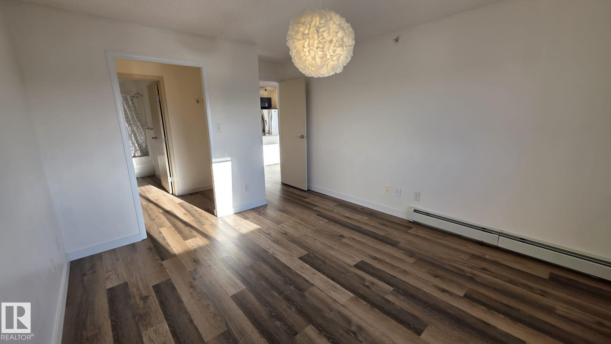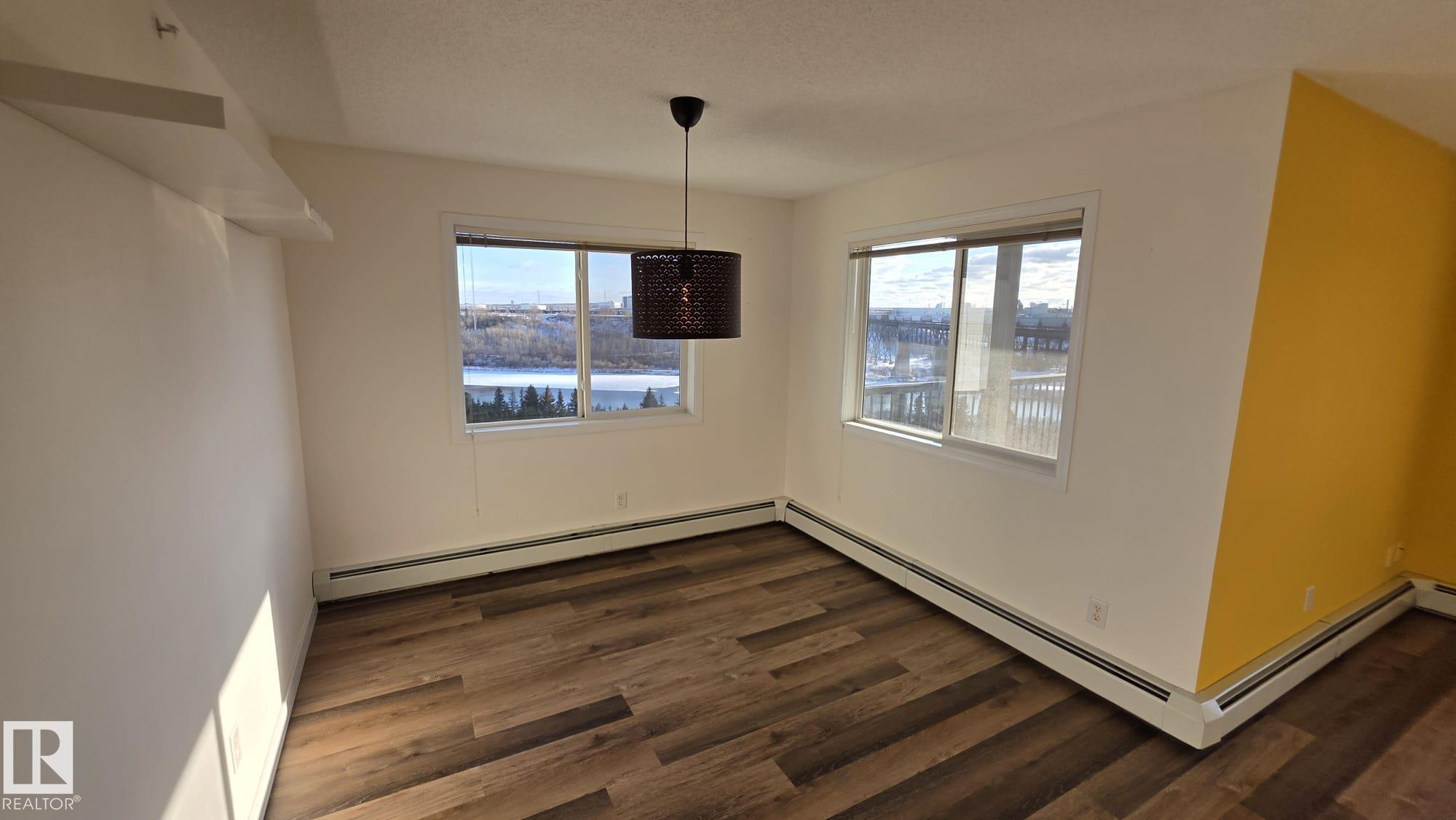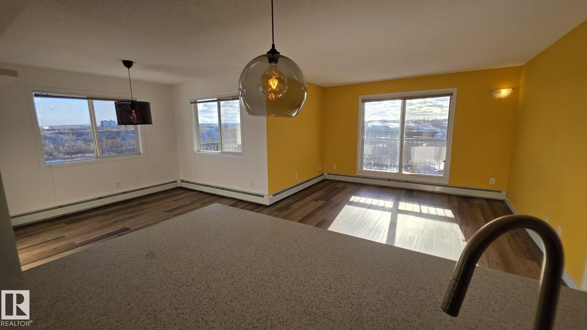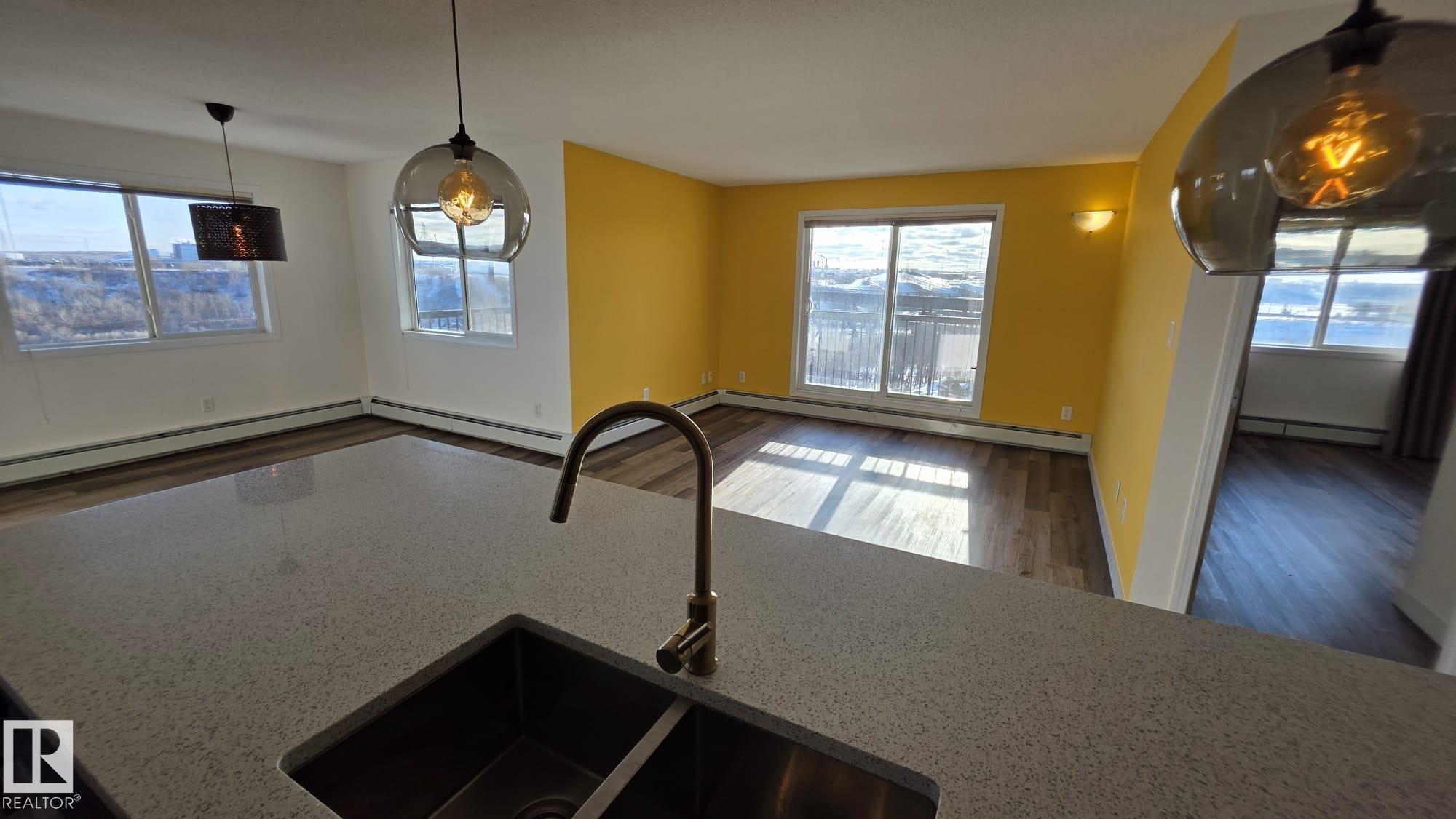 Welcome to Avenue at Hermitage, where lifestyle & location come together! This TOP FLOOR CORNER UNIT in a pet-friendly building is perfect for first-time buyers or investors. Breathtaking panoramic views of the river valley, green space & walking trails from your wraparound balcony. Bright open-concept layout featuring new flooring, 2 spacious bedrooms, 2 full updated baths, and double tandem parking. The renovated kitchen offers a large quartz waterfall island & breakfast bar, stainless steel appliances, and refinished cabinets, flowing seamlessly into the dining area & sun-filled living room. The primary suite includes a w/through closet & private ensuite. Enjoy the convenience of in-suite laundry & storage. Nestled in a quiet corner of the city, steps from Hermitage & Rundle Park, golf, skiing & quick access to Yellowhead and Anthony Henday. A well-managed building with condo fees that include heat & water. Simply move in and enjoy!!