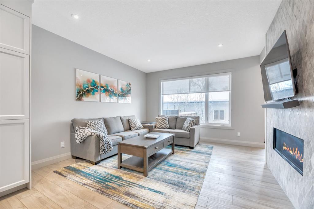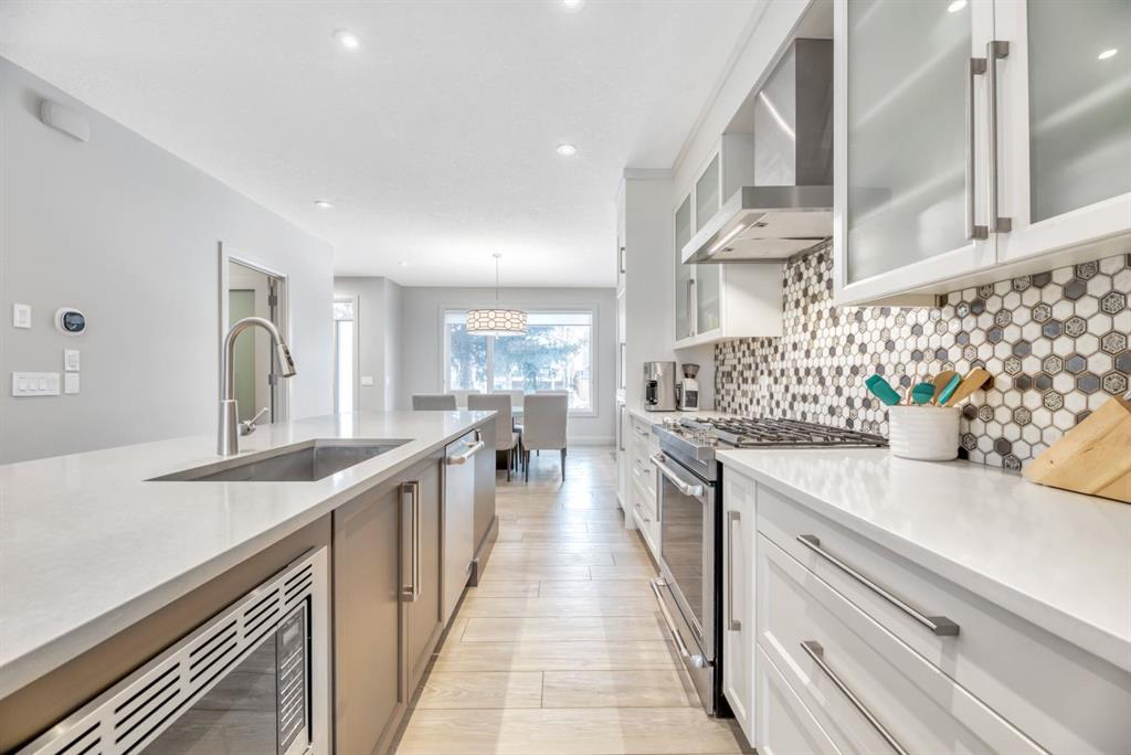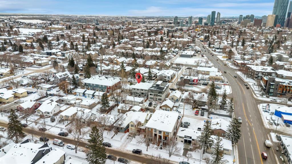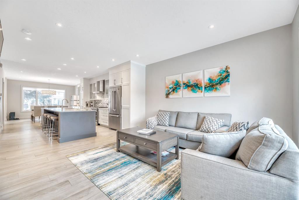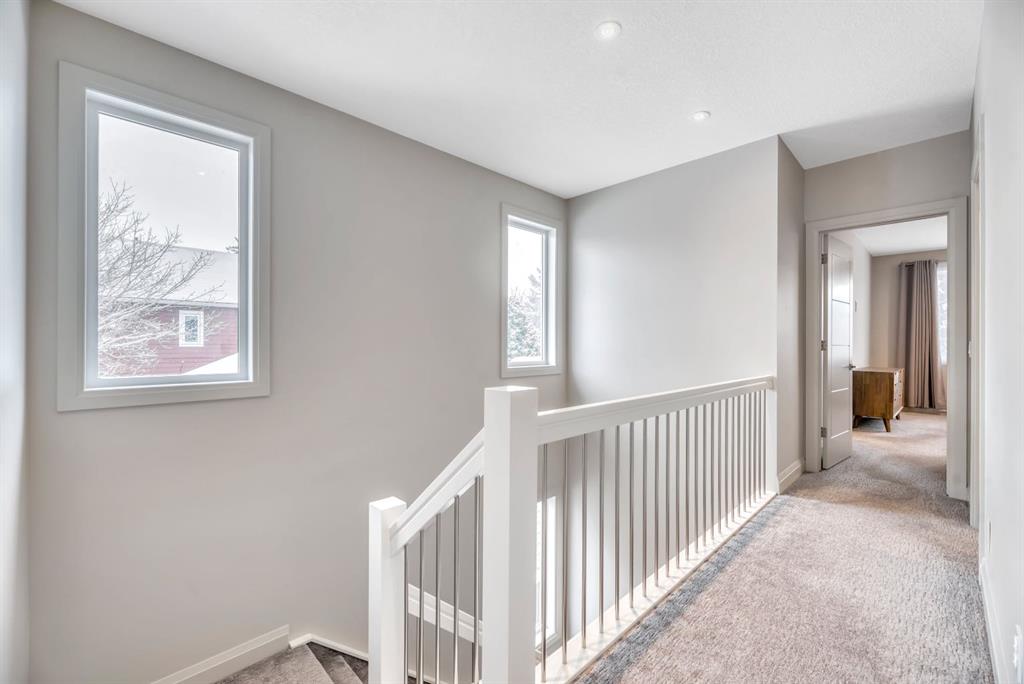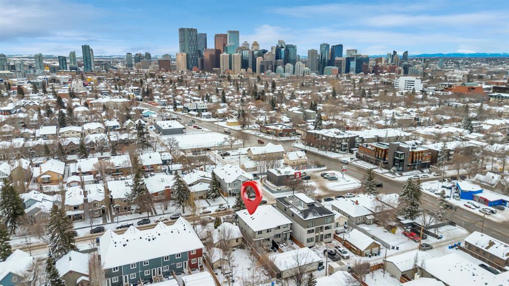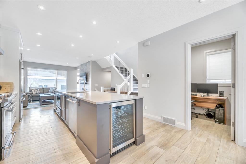 This exceptional inner-city infill stands apart for its quality, craftsmanship, and thoughtful design. Located in the sought-after community of Renfrew, this stunning two-storey home offers unbeatable access to schools, recreation facilities, scenic pathways, public transit, and is just minutes from downtown, WALKABLE even! Every detail has been carefully curated, from the designer lighting and custom tile work to a tailored built in with mirror, a timeless neutral palette, and a main floor office. Oversized windows and 9’ ceilings on all three levels flood the home with natural light, enhancing the open, modern layout that balances style with everyday functionality. The chef-inspired kitchen is a true showpiece, featuring a premium Jenn-Air stainless steel appliance package, custom cabinetry, built-in wine cooler, and an impressive 13-foot quartz island with seating for four—perfect for entertaining. The space flows seamlessly into the dining area and inviting living room, anchored by a striking tiled gas fireplace for chilly winter nights. Central air also included for the future warm days of Calgary! Upstairs, the primary retreat is nothing short of spectacular, showcasing a spa-like ensuite designed for relaxation with a soaker tub, dual sinks and walk in shower, a walk-in closet, and Two additional great sized bedrooms, a spacious 4 pc bathroom, and convenient upper-level laundry complete this level. The fully developed basement offers an ideal home theatre space with a refreshment station—perfect for movie nights or entertaining guests. Outside, enjoy a low-maintenance, landscaped and fenced backyard with a private ground-level patio, green space, and a double detached garage already wired for EV charger. Quick possession is available if you want to spend the holidays here! A refined inner-city lifestyle awaits in this meticulously crafted Renfrew home.