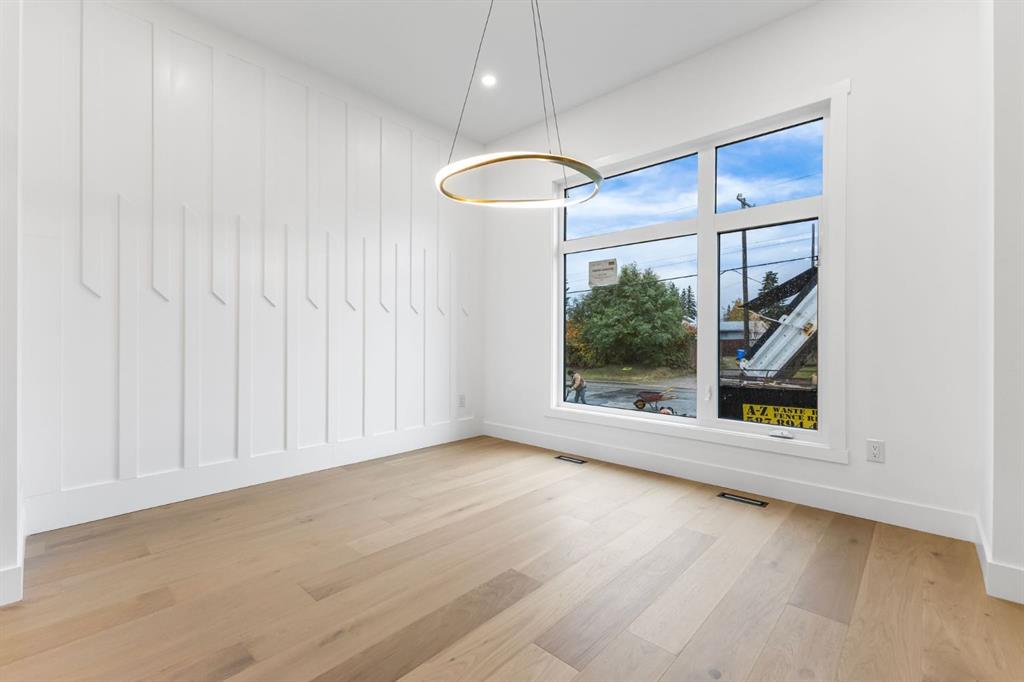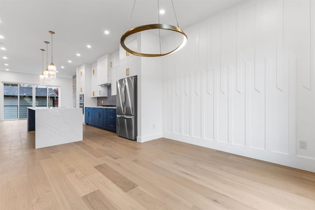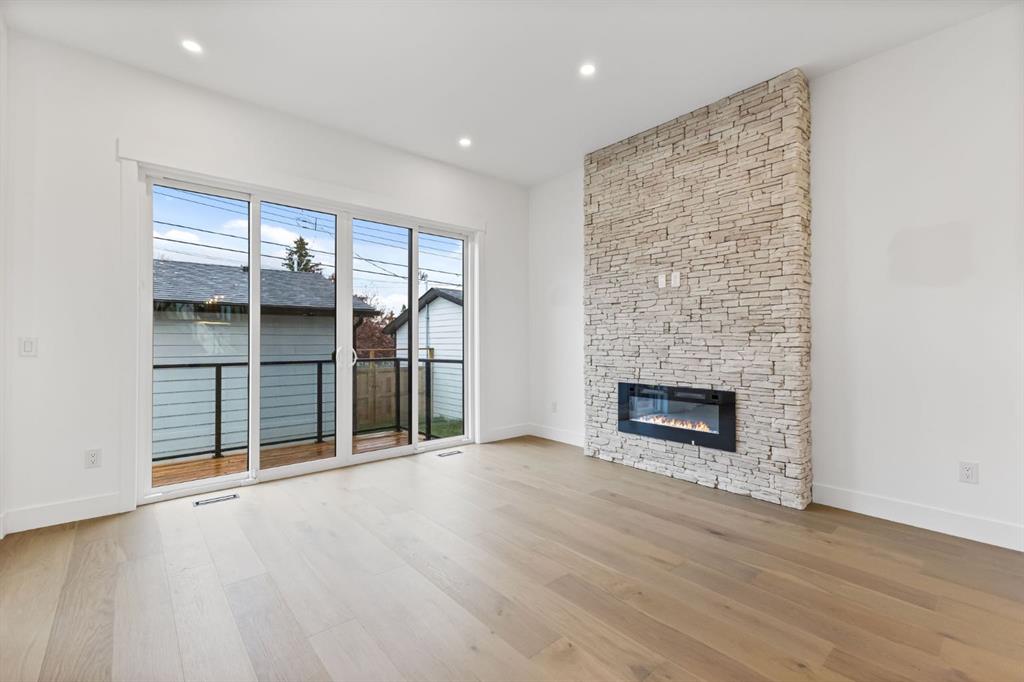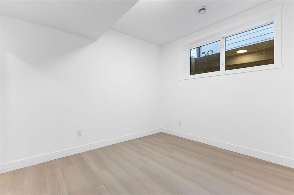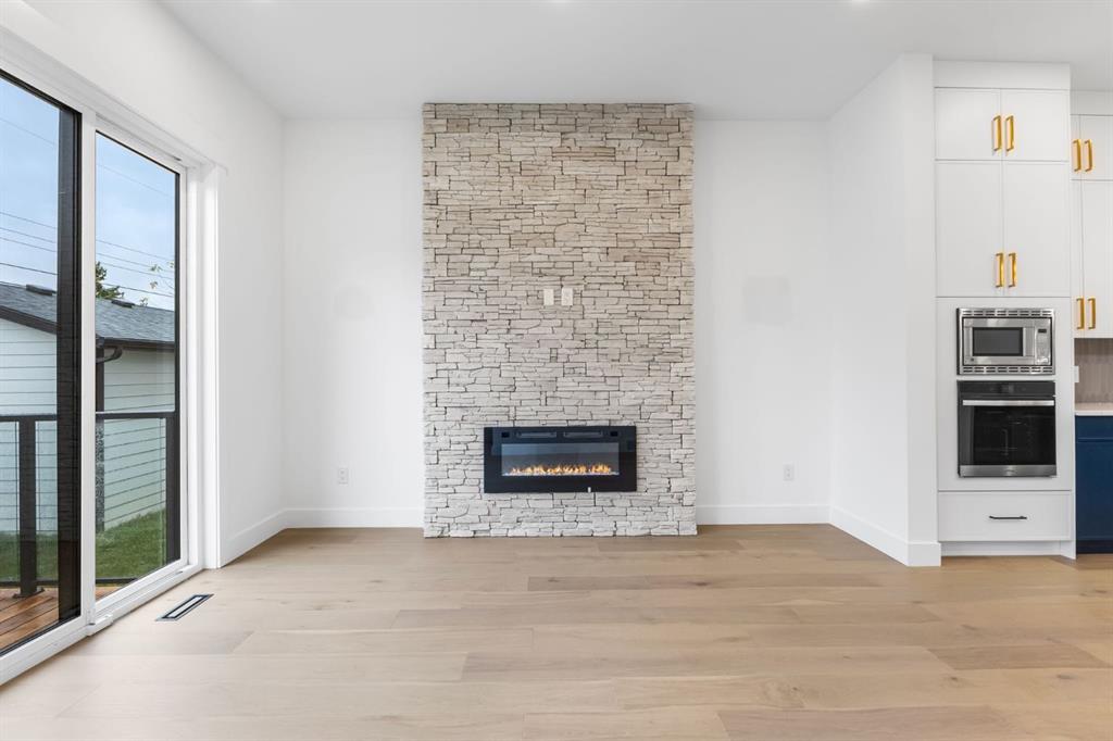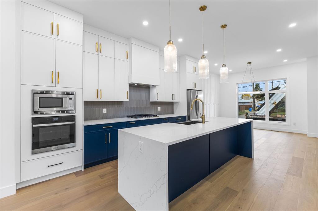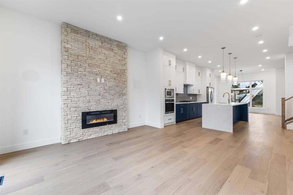 Welcome to this brand-new, 3 bedroom residence perfectly situated in the mature community of Rosscarrock. Designed for modern living and crafted with exceptional attention to detail, this contemporary two-storey home offers over 1900 sq ft of beautifully developed space, plus a legal self-contained one-bedroom basement suite—ideal for guests, or as a potential mortgage helper. The main level showcases an open-concept design enhanced by wide-plank hardwood floors, high ceilings, and expansive windows that flood the space with natural light. The inviting living room features a striking floor to ceiling fireplace and built-in shelving, creating a warm focal point for gatherings. The adjacent dining area easily accommodates family meals or formal entertaining. At the heart of the home, the chef-inspired kitchen impresses with full-height cabinetry, quartz countertops, an oversized island with breakfast bar and excellent appliance package. Thoughtful details such as recessed lighting, designer chandelier, a functional mudroom with custom built-ins and 2 piece powder room elevate the space. Upstairs, the vaulted-ceiling primary suite is a private retreat, complete with a spacious walk-in closet fitted with custom organizers and a luxurious 5-piece ensuite featuring double sinks, a quartz-topped vanity, freestanding soaking tub, and separate glass shower. Two additional bedrooms, a 4-piece bath, and a convenient laundry room with sink complete this level. The fully developed lower level has been designed as a private, self-contained legal one-bedroom suite, complete with its own kitchen, living area, full bathroom, and laundry facilities. Large windows, recessed lighting, and quality finishes ensure the suite feels bright and inviting—ideal for extended family, guests, or rental use. Outside, enjoy a private, landscaped yard with a rear deck, fencing, and a double detached garage. The home’s exterior blends timeless brick and composite siding with modern lines and a welcoming south-facing front exposure. Situated on a quiet street within walking distance to parks, playgrounds & schools and close to Shaganappi Point Golf Course, shopping, scenic Edworthy Park and public transit, this property offers the perfect balance of style, flexibility, and convenience. Newly built in 2025, this outstanding Rosscarrock residence delivers premium craftsmanship, functional design, and exceptional versatility—ideal for today’s discerning buyer seeking luxury living with the added benefit of a legal self-contained suite.