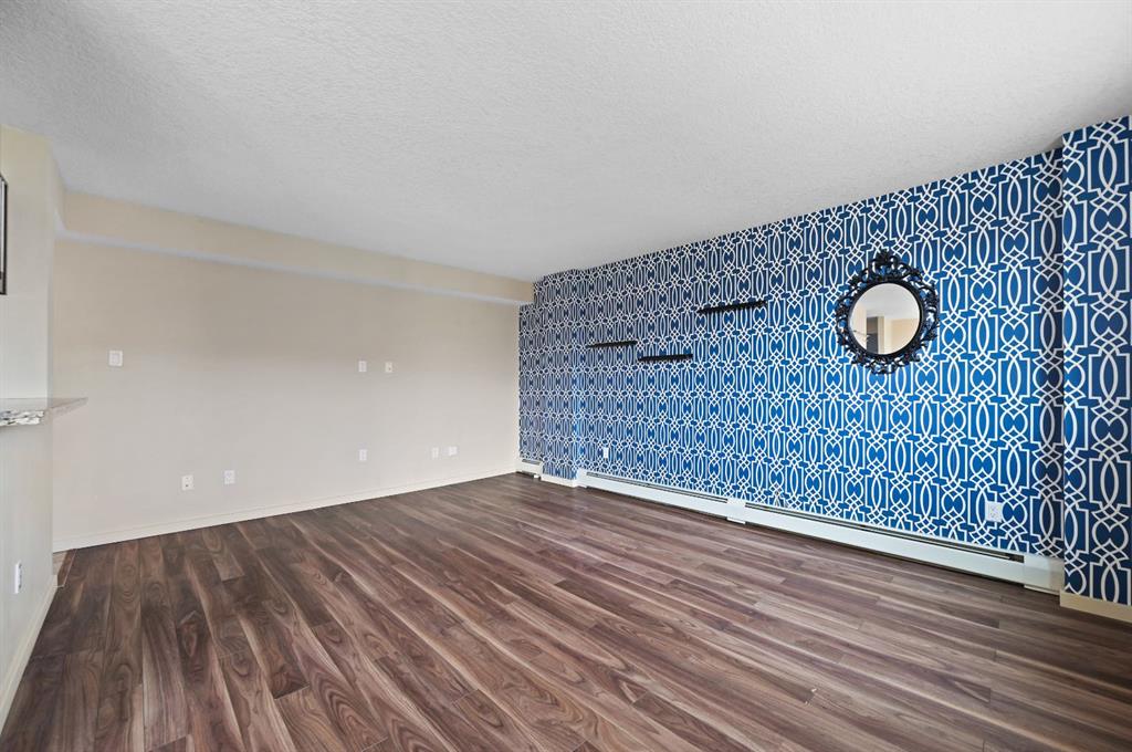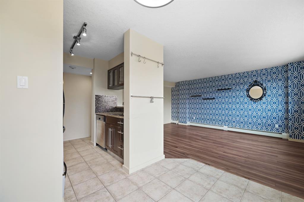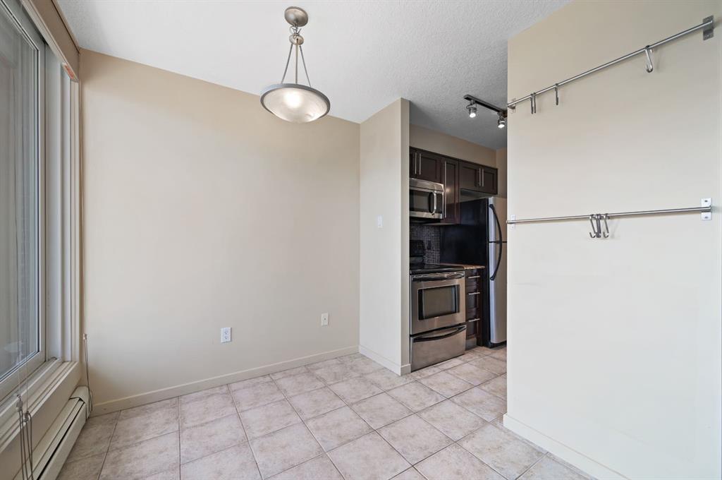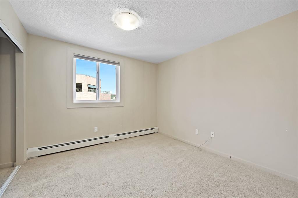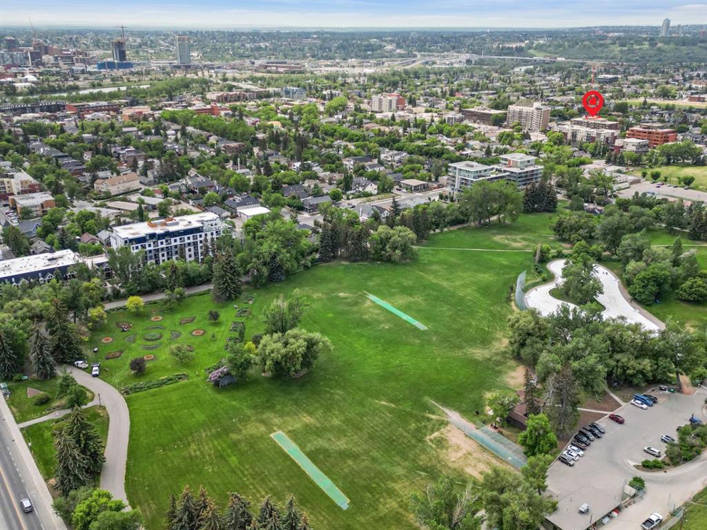 This corner END unit showcases fantastic CITY SKYLINE VIEWS and must be seen. Very close to the downtown core in the heart of Hillhurst, and walking distance to the pubs, restaurants, and shops of Kensington. Stroll to the walking paths along the Bow River, beautiful Riley Park, and the Sunnyside LRT station and even up the hill to SAIT! In a concrete building, this 1-bedroom condo features a kitchen perfect for entertaining with eating bar, stainless steel appliances, granite countertops, mosaic tile backsplash, and darker stained cabinetry, a 5-piece bath with jetted tub and granite counters, cozy living room, IN-SUITE laundry, parking stall (#31) and separate private storage area (#31). The bedroom is separated from the living room and eating area for privacy and quiet. The Vue building offers a fully equipped exercise room with newer equipment and bike storage! The very low condo fee ($440/month) includes heat and water and sewer. Experience the great location, style and convenience of this condo and the Kensington area. Priced to sell.