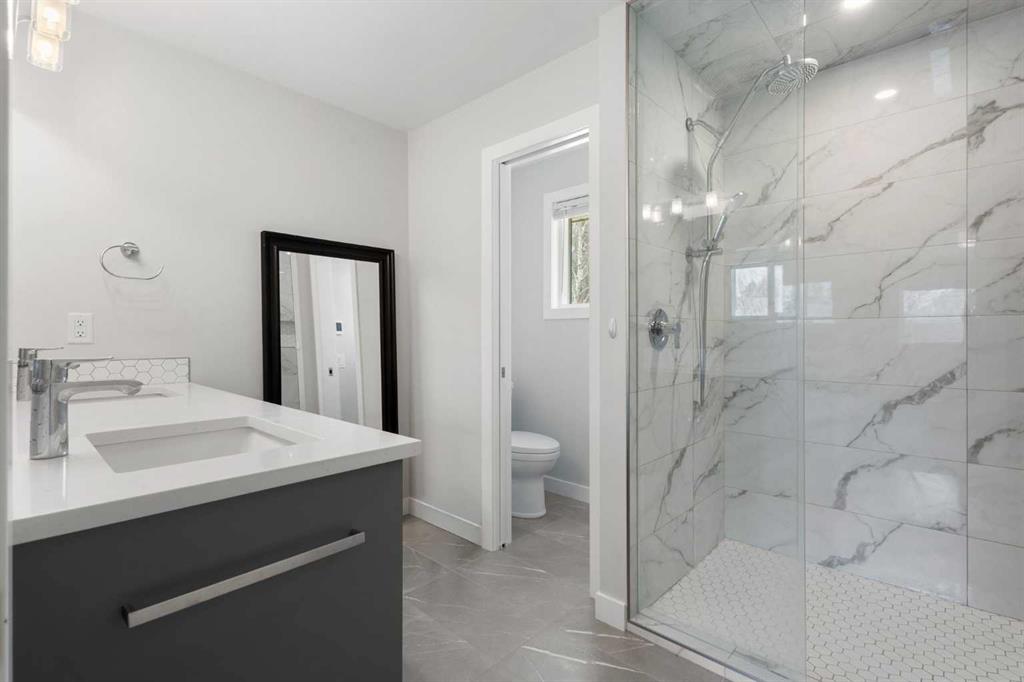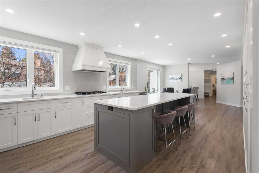 Welcome to this fully renovated estate home in Varsity Estates, ideally situated on a quiet cul-de-sac just steps from ravine pathways, expansive green space. Set on a rare oversized 9,300+ sq ft, renovated down to the studs (electrical, plumbing, HVAC, insulation, and triple pane windows) this home reflects a commitment to quality craftsmanship, thoughtful design, and timeless finishes throughout. Equipped with solar panels, the home also offers improved energy efficiency and long-term cost savings. Offering over 2,600 sq ft above grade and more than 3,700 sq ft of total developed living space, this impressive home features a triple garage, 5 bedrooms, and 3.5 bathrooms, delivering the scale, functionality, and refinement expected in Varsity Estates. The main floor is anchored by a stunning designer kitchen, thoughtfully crafted for both everyday living and entertaining. Featuring a large central island, quartz countertops, custom cabinetry, and premium stainless steel appliances, this space is elevated by a gas cooktop, custom canopy hood fan, built-in wall oven and microwave, dual sinks, and extensive storage throughout—a rare combination of style and functionality. The open-concept layout flows seamlessly into spacious living and dining areas filled with natural light, while a dedicated main floor office/den offers flexibility for working from home. Upstairs, you’ll find four generously sized bedrooms, including a well-appointed primary retreat with ensuite bathroom featuring tiled shower with glass enclosure! Both upper bathrooms offer dual vanities, quartz countertops, and private water closet areas, creating a refined, spa-inspired experience. The fully developed basement expands your living space with a large recreation room, an additional bedroom, full bathroom, and oversized storage room. Located just minutes from Market Mall, the University of Calgary, Foothills & Children’s Hospitals, some Calgary’s top-ranked schools and major transit routes, this home offers the perfect balance of convenience and an established, nature-rich setting.