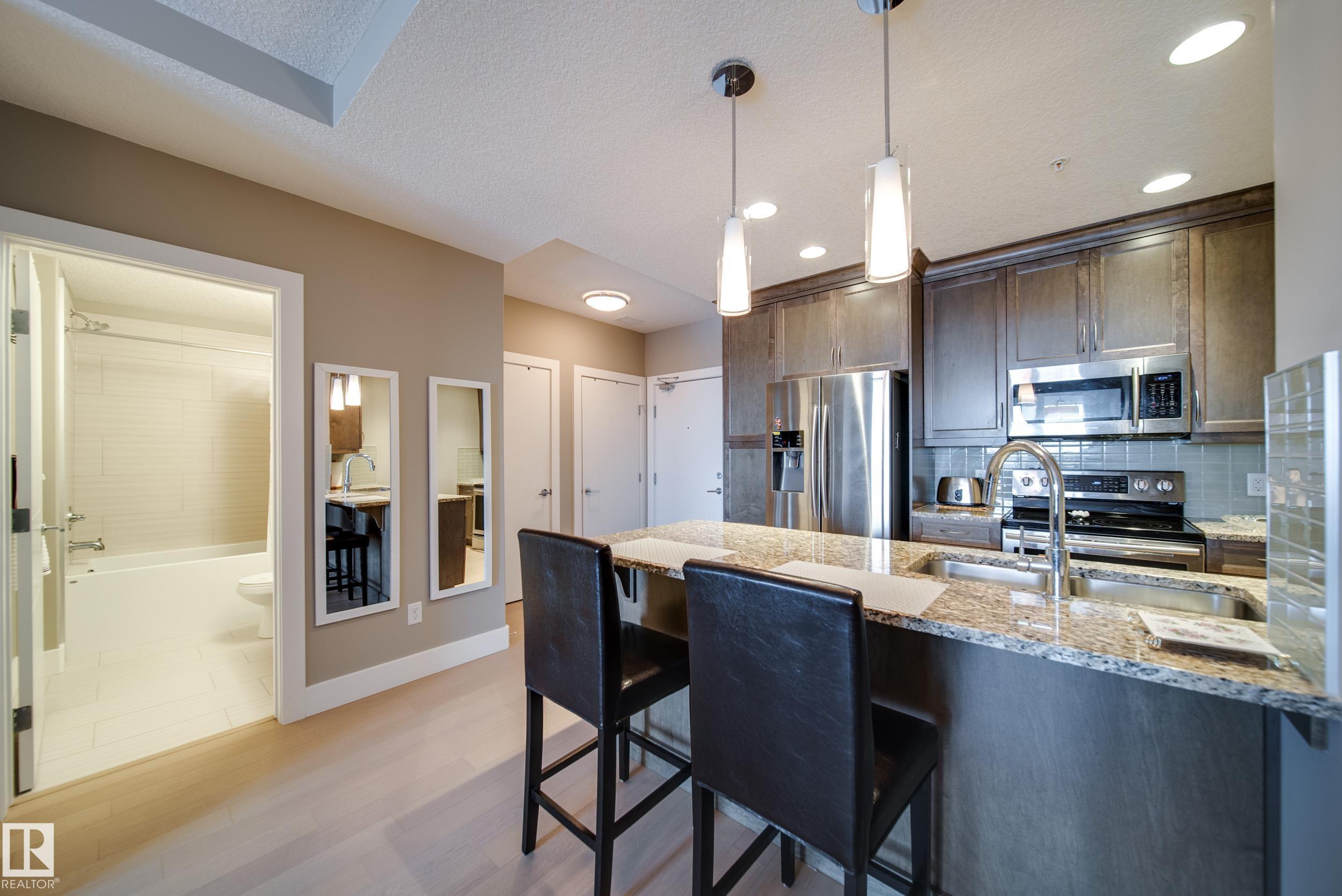 1 BED, 1 BATH, 1 UNDERGROUND PARKING STALL, 5TH FLOOR LOCATION IN THIS POPULAR AND STYLISH BUILDING - E'SCAPES! This unit has barely been lived in and can be purchased with all the furniture included. What's the best part of this condo you ask, how about the concrete and steel construction!? You will love the well laid out space this one bed condo offers. The kitchen is contemporary and features s.s. appliances, granite counters and has a breakfast bar for quick meals. This open concept living space also has a dining nook, tech desk, in suite laundry with storage and a living room with views looking NorthEast. The bedroom has the perfect amount of space and a walk in closet. The building offers so much including: gym, social room, conference room and two roof top patios. Pets allowed with board approval. This is a better option then renting and is move in ready!