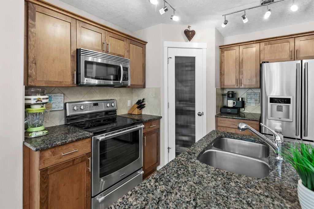 Cranston Gem with NO CONDO FEES - This Beautifully maintained semi detached home that exudes pride of ownership is located in an unbeatable location. This bright open concept home boasts an excellent layout from the front foyer through the kitchen and dinning room and also to the living room that has sliding door to your sunny south facing back garden. There is direct access from the foyer to the garage which also has a man door through to the back yard. The kitchen has a very functional layout and showcased by granite counters and caramel coloured maple cabinets. The kitchen is finished with Stainless steel appliances, tiled back. splash and a corner pantry for those storage needs. The living room has a cozy gas fireplace, hard wood floors and a sliding door to a large composite board deck, mechanical retractable awning and metal spindle railings. You can enjoy the privacy form this fully fenced and sun filled, south facing yard. The side of the house has poured concrete walk ways to ease those winter chores. On the Second level of this house there are two spacious bedrooms, the first has twin closets and over looks the rear yard. The second bedroom has a large walk in closet and faces north. Between the two bedrooms is large spa like bathroom with a jetted tub and a stand alone tiled shower. The windows are adorned with Hunter Douglas blinds through out and for convenience there is a central vac system with attachments. On those hot summer days you will be able to sleep comfortable with the central air conditioning. The basement does have roughed in plumbing and is awaiting your design ideas to customize this home further for your needs. This home is conveniently situated in walking distance to Sobeys, restaurants and shops. Close by you have the Seton shopping centre and 130th avenue shopping complex, South Health Campus, Hospitals, transportation and 5 Schools in the area.