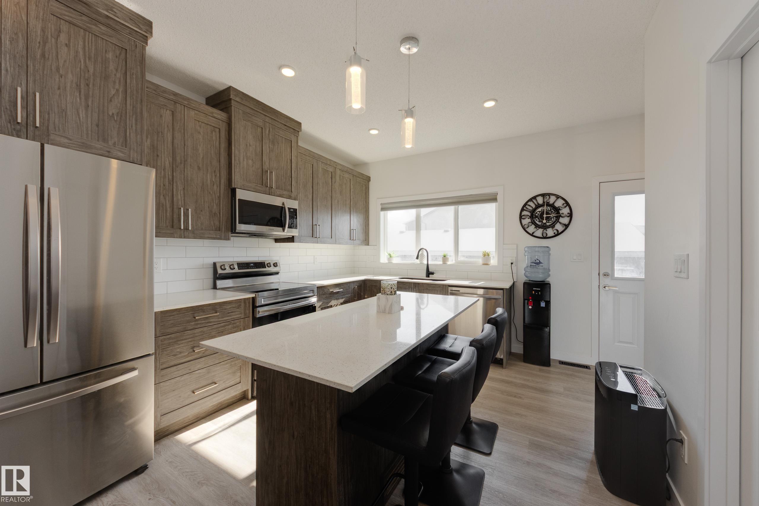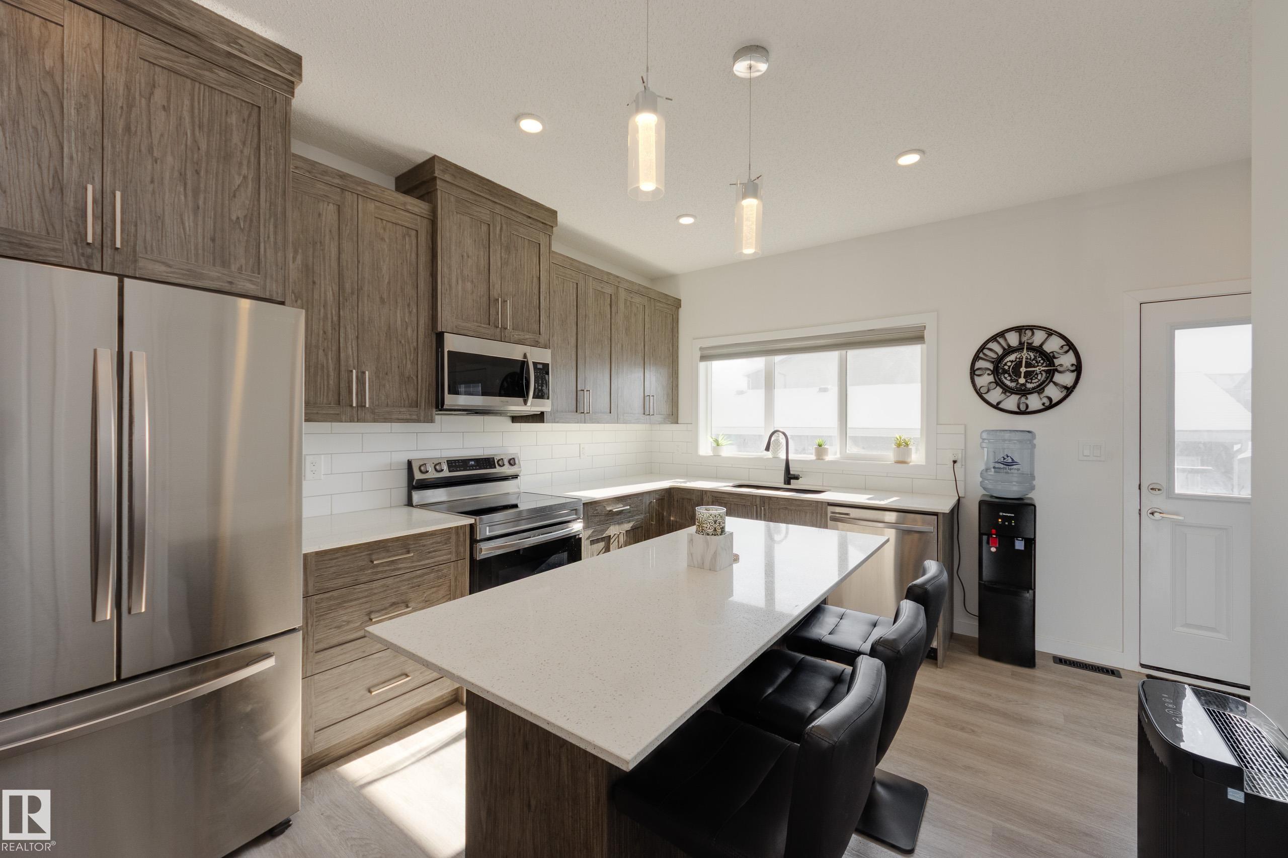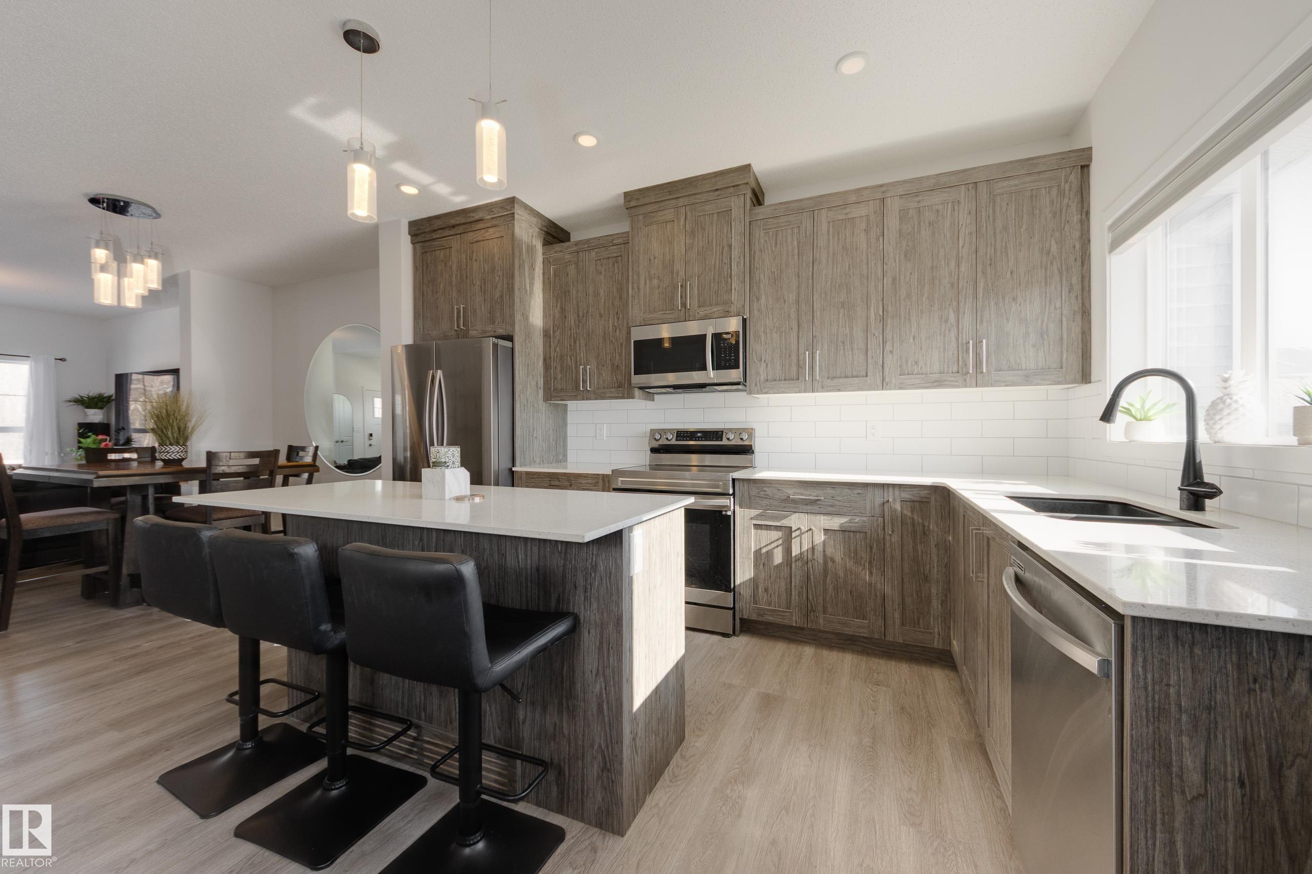 Located in Edgemont, this well-designed attached home sits on a large, fully fenced corner lot facing a treed reserve and includes an insulated double detached garage. The main floor offers a bright, open layout with a spacious living area that flows into the kitchen, where quartz countertops, stainless steel appliances, ample cabinetry, and a large island with flush eating bar create a functional and stylish space. A convenient two-piece bath is located at the rear entry. Upstairs, three generously sized bedrooms include a primary suite with a walk-in closet and full ensuite, along with a second full bathroom and a laundry closet for added convenience. The full basement remains unspoiled, offering excellent potential for future development. Close to parks, shopping, and everyday amenities, this home combines comfort, space, and a desirable location.