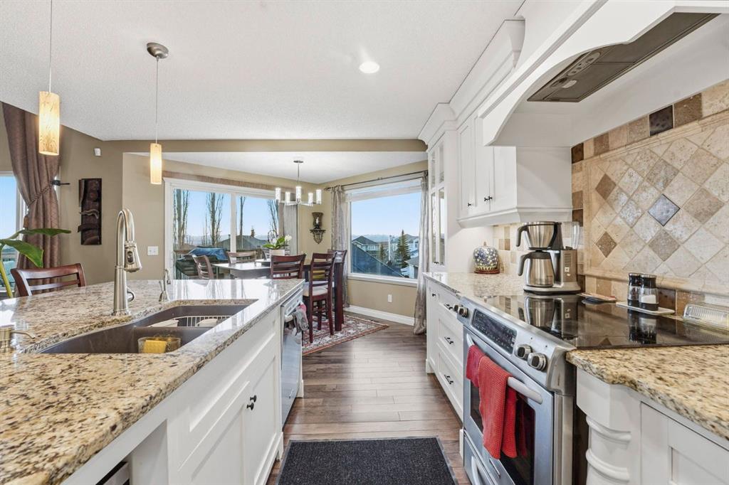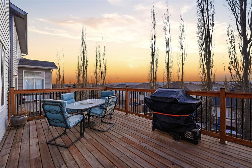 Discover this beautifully maintained 2-storey walk-out home in the NW community of Rocky Ridge, offering breathtaking mountain views and a thoughtfully designed layout ideal for modern living. The open concept main level features high ceilings in the living room, expansive windows, and seamless flow throughout the space. The updated kitchen is a true highlight, perfectly positioned to take in the stunning views and offering ample cabinetry, generous counter space, a corner pantry and direct access to the outdoor deck. Ideal for entertaining or simply enjoying the scenery. Upstairs, you’ll find three spacious bedrooms, including a private primary retreat where you can unwind while enjoying mountain views from the ensuite bathroom. A designated area upstairs provides the perfect spot for a home office or study nook, along with a full bathroom to comfortably accommodate family or guests. The fully developed walk-out basement adds exceptional versatility, featuring a wet bar, full bathroom, and a flexible den space currently set up as a home gym (previously a bedroom) and Sauna, offering options for recreation, work, or guests. With direct access to the backyard, this level is perfect for entertaining or multi-functional living. Enjoy outdoor living with picturesque views, a well designed deck, and a layout that truly connects indoor and outdoor spaces. Evenings in the hot tub in the backyard, on concrete patio. Recent upgrades include: Roof (replaced 5 years ago), New Furnace (2025), Water Softener (2025), Hot Water Tank (2021). Conveniently situated close to schools, parks, shopping, the YMCA, and major roadways. The upcoming Rocky Ridge Athletic Park, anticipated for completion in 2026, will further enhance the area with new recreational amenities and long term community appeal. Schedule your private showing today and experience everything this home has to offer.