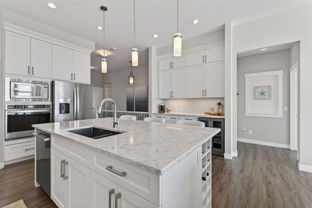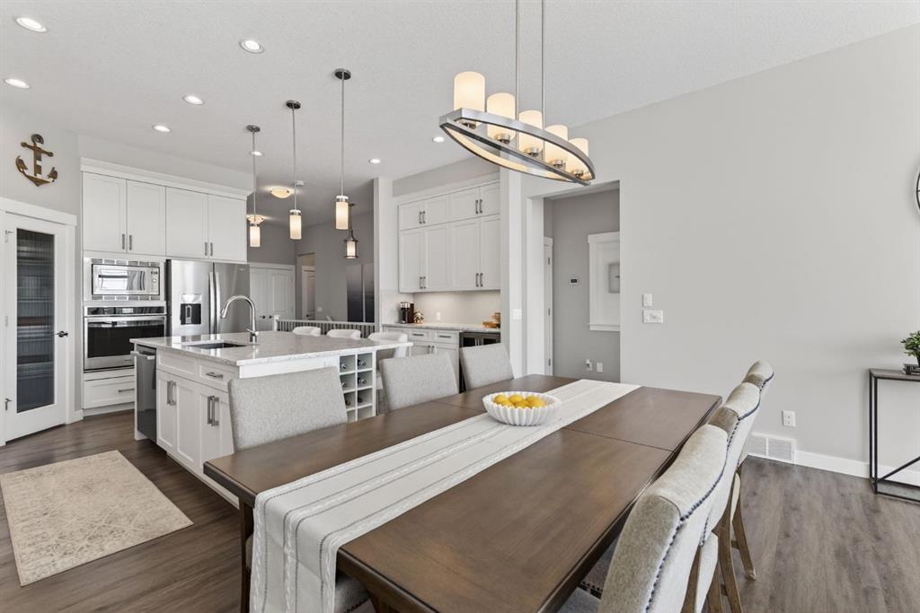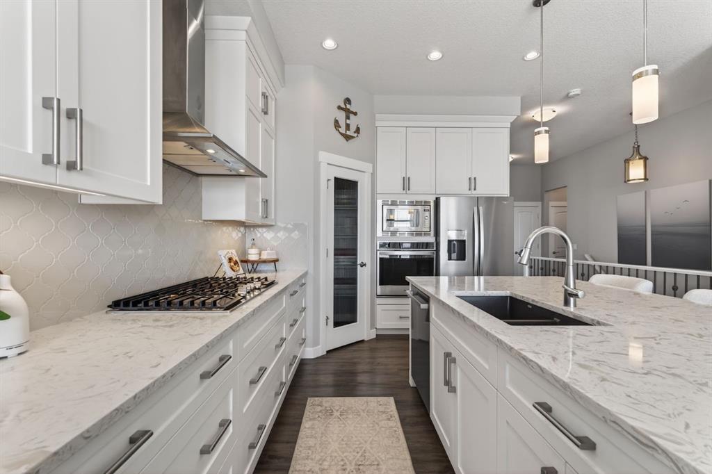 OPEN HOUSE SATURDAY MARCH 21ST 1PM-3PM AND SUNDAY MARCH 22ND 2PM-4PM. Welcome to this beautifully maintained bungalow located in the desirable community of Mountainview in Okotoks, perfectly positioned on a quiet street and backing onto scenic green space. Offering a rare combination of style, functionality, and breathtaking views, this home is ideal for those seeking both comfort and elevated everyday living. From the moment you arrive, you’ll appreciate the exceptional curb appeal, ample parking, and double attached garage. Inside, the bright and open-concept main floor is designed to impress, featuring large windows that flood the space with natural light and showcase the stunning ridge views behind the home. The heart of the home is the thoughtfully designed kitchen, complete with a large central island, quartz countertops, stainless steel appliances, and a convenient corner pantry. The seamless flow into the separate dining area and spacious living room makes this layout perfect for both entertaining and everyday living. The cozy gas fireplace anchors the living room, creating a warm and inviting atmosphere year-round. The main level also offers the convenience of laundry and a dedicated office—perfect for working from home or creating a quiet, flexible space to suit your needs. The primary bedroom is a true retreat, featuring a generous walk-in closet and a luxurious 5-piece ensuite with dual vanities, a soaking tub, and a separate stand-up shower. Downstairs, the fully developed basement expands your living space with two large recreation areas, ideal for a media room, games area, or home gym. Two additional bedrooms—one with a walk-in closet—and a full 4-piece bathroom provide plenty of room for family or guests. Step outside to the beautifully designed outdoor living space, perfectly positioned to take in the incredible views. Whether you’re hosting summer gatherings or enjoying quiet evenings, this backyard offers the perfect blend of privacy and connection to nature. Located in the sought-after Mountainview community, this home offers easy access to walking paths, parks, schools, and all the amenities Okotoks has to offer—while still providing a peaceful, scenic setting. This is a rare opportunity to own a move-in ready bungalow with a fully developed basement, stunning views, and exceptional indoor-outdoor living.