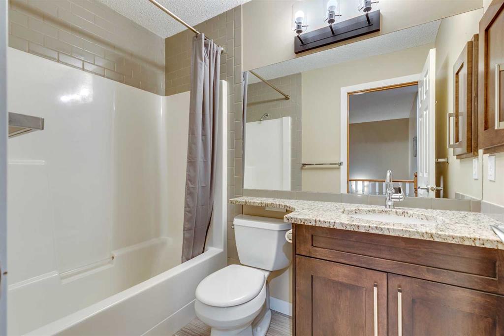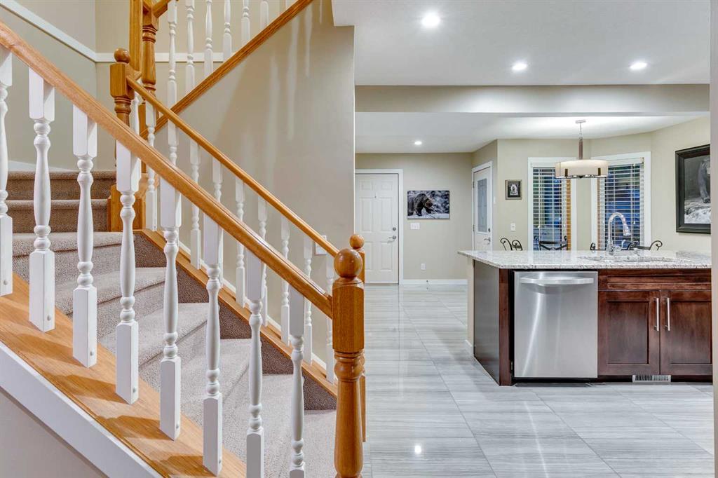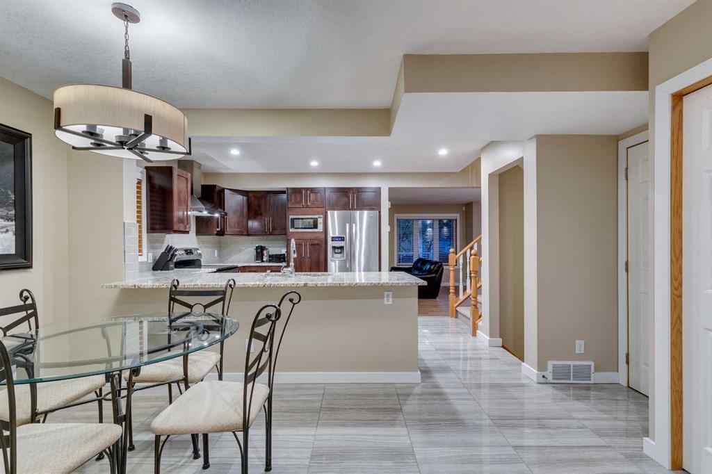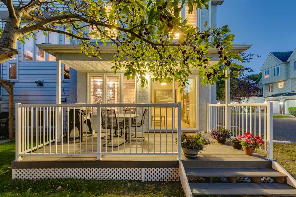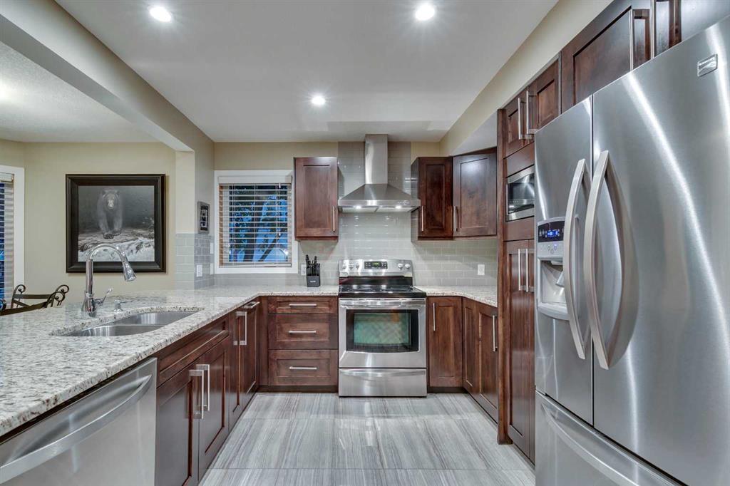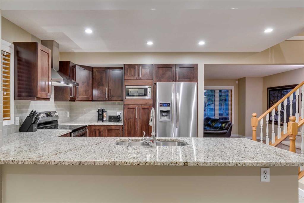 Absolutely spectacular! One of the best locations in Inglewood adjacent to the bike path and Bow River. Massive, custom renovation top to bottom! Corner end unit with a double attached garage will fit a full sized vehicle plus a shorter vehicle. South and west facing means tons of sunlight! 3 bedroom, 2.5 baths, over 2000 square feet of total developed living space. High end TRIPLE pane windows that fully open at a 90 degree angle from Centra (Supreme Windows). The patio door and basement windows are also triple pane. High gloss 12"x24" tile flooring in the entrance, main bath, kitchen, dining room, and upstairs bathrooms. Gorgeous kitchen with thick granite countertops with rounded corners, large eating ledge, undermount sink with soap dispenser, custom pull out drawer system, stainless steel dropped hoodfan with tile backsplash to the ceiling, built in wall microwave, stainless steel appliances including an ultra quiet dishwasher, flat top stove, french door fridge with pull out bottom freezer with ice/water dispenser, stained maple cabinets with soft close doors and 9" chrome handles. Pot lights in kitchen, entrance and upstairs hallway. Knockdown ceilings on entire main floor except the half bath which is a flat drywall ceiling. Massive sized living room has hardwood inspired tile flooring, ceiling fan with remote, and custom floor to ceiling stonework around the gas fireplace with internal blower fan. Feature accent lighting installed on the stonework. Large windows in the living room with a sliding door, leading to a large 8'x16'2" west facing deck with a natural gas line. Upstairs has 3 bedrooms including a large master, ceiling fan with remote, and a huge walk in closet measuring 8'x6'6". Both the ensuite and the second bathroom have the same granite, cabinets, undermount sinks, and tile flooring as found in the kitchen. All bathrooms have high quality Kohler toilets with soft close lids. Bedrooms 2 and 3 have a custom double door closet. Bedroom 2 has ceiling fan with remote. Fully finished basement with huge rec room and family room has plush carpet with thick underlay. Large storage room with front loading red LG washer and dryer with pedestals. 3.5" tall baseboard casings throughout the house. Custom "Bungalow Beige" paint color throughout the house. 60 gallon hot water tank installed in 2022. 2.5" white faux wood blinds throughout the house. Driveway will hold a vehicle angle parked. Amazing views to the west of the massive trees. Outside stucco painted / refreshed in 2023. Front porch and rear deck is composite board material with white metal railings. The Inglewood Village On The Bow complex is very well run with a $3.1 million dollar reserve fund and wasn't affected by the 2013 flood.