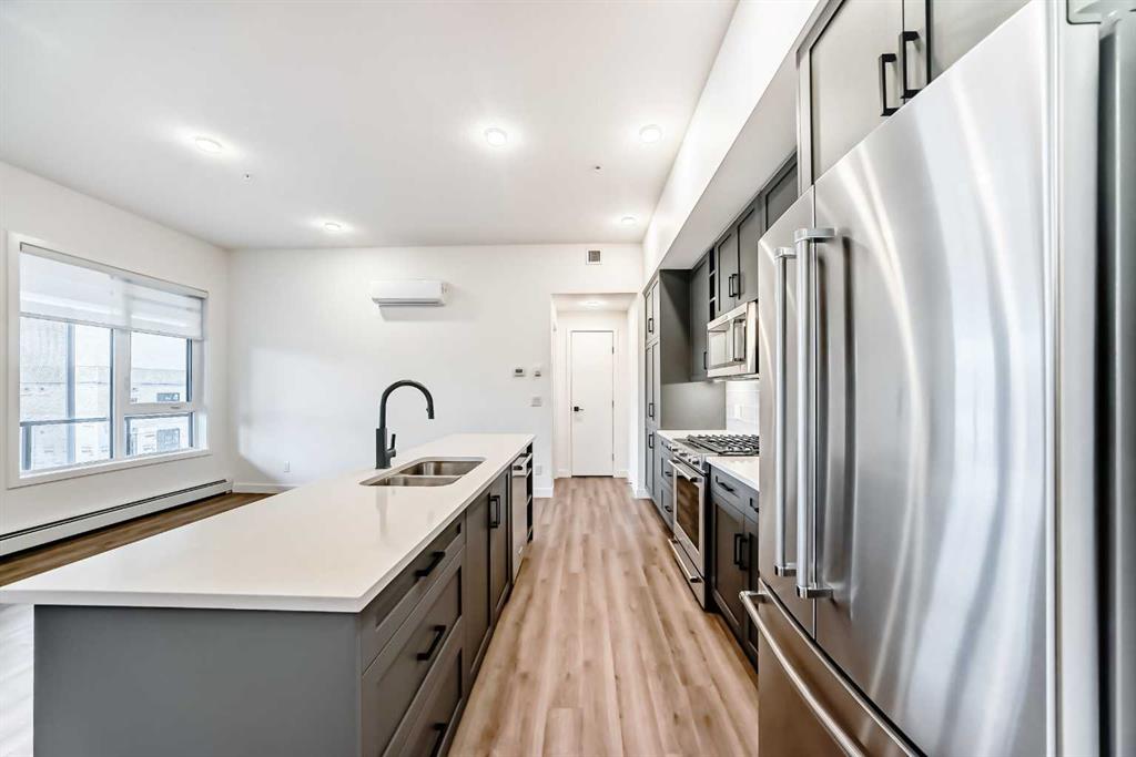 Welcome to a TOP floor condo unit in the August building in the heart of University District. This unit is walking distance to all the great restaurants, coffee shops and the Save on Foods grocery store. (who needs a car!). Unit was marketed as a 3 bedroom plan by the builder (Avi Urban) but currently is a 1 bedroom + den (walk in closet) + 2nd living room (which can be converted back to a bedroom). The balcony is approx 263 sq feet (36 ft long x 6.8ft wide), comes w/ storage units on both ends, & has protective bird screens (upgrade). The balcony is huge and allows for plenty of furniture to be configured on it. Upon entry into the unit, a spacious laundry room with ample storage awaits. The 2nd 4 piece bathroom (tub/shower) w/ quartz countertops and tile flooring. The entire unit except the bathrooms has light brown vinyl plank flooring. The unit feels quite large with 10ft + ceilings & huge floor to ceiling windows which adds a plethora of natural light. The kitchen is large with upgraded SS appliances, quartz counter tops, & grey cabinets (additional added for more storage). The front living room can be converted back to a 2nd bedroom if buyer wishes. The primary bedroom is large with its own access to the patio. The ensuite has dual sinks, quartz counter tops, matching cabinets to the kitchen and a huge walk in shower w/ wand for washing (upgrade). The walk in closet is close to 50 sq ft (7.25 x 7.5) allowing for tons of clothes, shoes, & accessories. The den allows for a twin size bed or murphy bed arrangement and has its own walk in closet. The future buyer has plenty of options to personalize it to their liking. The unit has its own AC unit (upgrade) + upgraded custom finished blinds throughout + Telus fibre optic. The unit comes with 2 titled parking spots (265/266) + separate storage unit (P2). The main floor has a party room that can be booked for gatherings or used as a quit study area. The 2nd floor has an outdoor patio for residents. Don't miss this awesome opportunity enter condo ownership as a 1st time buyer or downsize from a neighboring NW community and enjoy the numerous amenities that residence have come to enjoy!