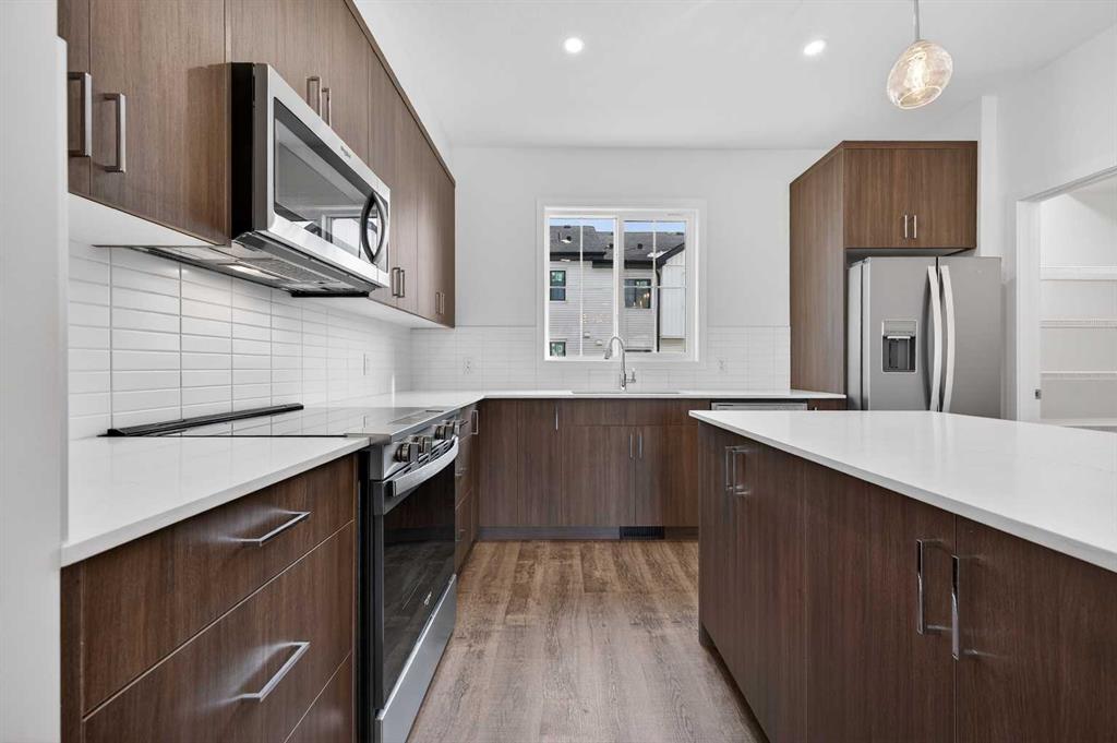 OPEN HOUSE on Saturday, February 7th and Sunday, February 8th from 12pm-5pm. Please go to the show home located at 96 Creekside Drive SW for access. StreetSide proudly presents this exceptionally popular interior-unit townhome, where expansive living areas meet modern comforts and sophisticated finishes. The thoughtfully designed floorplan features three spacious upper-level bedrooms and two and a half well-appointed bathrooms, complemented by a versatile lower-level den perfect for a home office or quiet retreat. The heart of the home is an inviting open-concept main floor, anchored by a large gourmet kitchen featuring a functional breakfast bar for casual dining. This bright living space transitions seamlessly to a private balcony, offering a perfect setting for outdoor relaxation. The interior showcases high end craftsmanship, including modern dark slab-style cabinetry with a full bank of drawers for maximum storage. The kitchen is further elevated by polished white quartz countertops and a full suite of premium stainless steel appliances. Durable luxury vinyl flooring runs throughout the primary living areas, while the stairs and upper level are finished with plush carpet over an 8lb underlay for superior comfort. This residence is a water meter unit, allowing for precise and efficient utility management. Additional conveniences include an attached double car garage, professionally maintained landscaping, and a lifestyle defined by maintenance free living. Life at Sirocco Gate East in Southwest Calgary is about more than just living—it’s about thriving. Imagine having a picturesque central green space at your doorstep, offering opportunities for both tranquil reflection and vibrant community events. Residents enjoy the luxury of sophisticated townhome living with the Rocky Mountains as a backdrop and easy access to both Stoney Trail and Macleod Trail. With daily essentials located in nearby shopping centers, this home offers the perfect blend of scenic serenity and urban convenience.