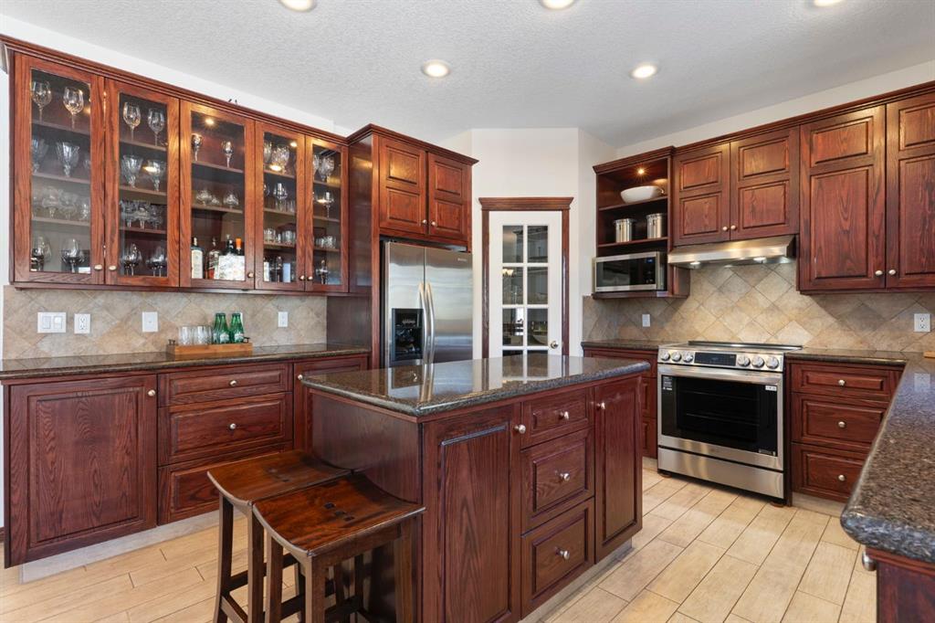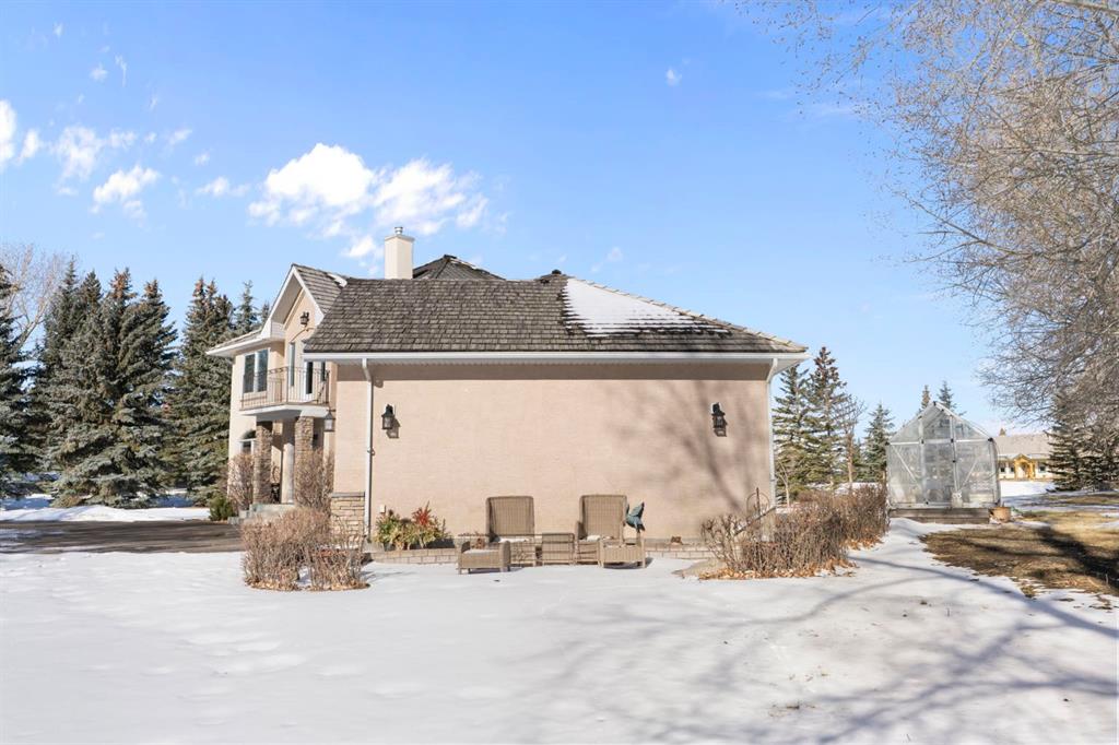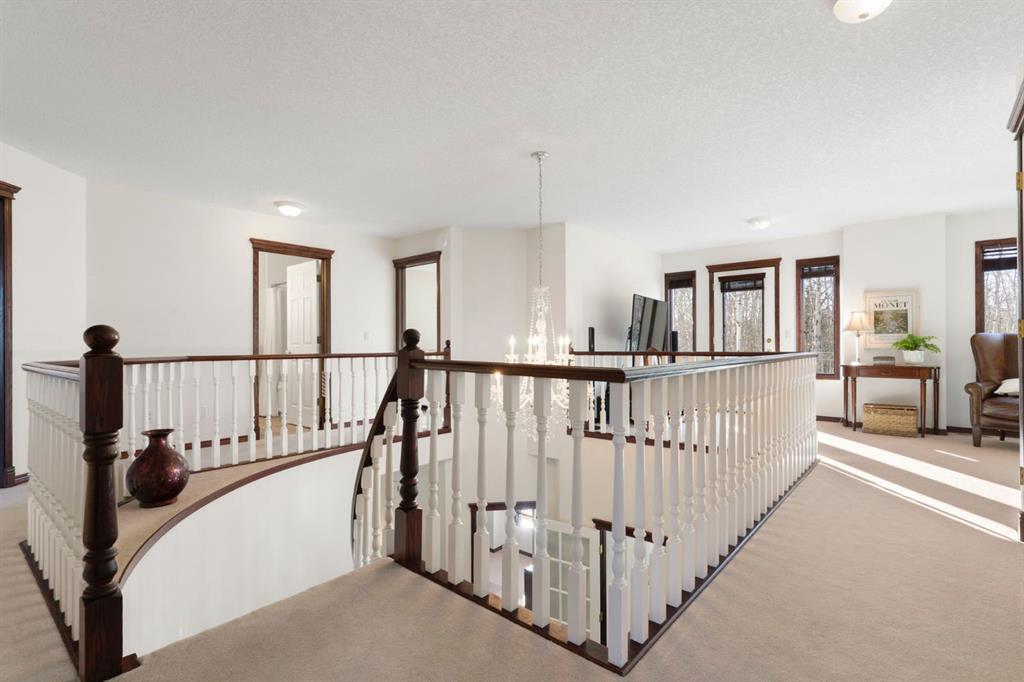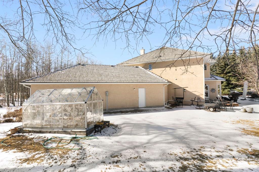 ** Watch the full CINEMATIC property tour** Welcome to this custom two-storey 4213 sqft home by Maillot Homes, perfectly positioned on a private, treed 2-acre parcel in the HEART OF BEARSPAW. Offered by the original owners, this elegant country home blends timeless design with thoughtful updates. It is METICULOUSLY maintained and a truly peaceful setting just 5 minutes from the city limits and amenities. Step through the enclosed entry into a dramatic vaulted foyer where a graceful curved staircase and sparkling chandelier create a memorable first impression. Large picture windows fill the home with natural light, highlighting the spacious principal rooms designed for both everyday living and entertaining. The kitchen features refinished oak cabinetry, GRANITE COUNTERTOPS, stainless steel appliances, a corner pantry, island, and tiled backsplash. The sunny-bayed breakfast nook opens to a large exposed aggregate patio overlooking the beautifully landscaped yard, while the adjoining family room offers a cozy FIREPLACE with custom built-ins and stone surround. A main floor office with south-facing windows, convenient laundry with garage access, and elegant living and dining rooms complete the main level. Upstairs, the home offers three generous bedrooms plus a bright bonus room with deck access to a Juliet balcony. The primary retreat includes a large walk-in closet and a luxurious 5-piece ensuite with jetted tub and double vanity. The fully developed basement provides a spacious recreation area with endless potential, a fourth bedroom, and abundant storage. RECENT UPDATES: Include: $40K in groundworks, NEW hot water tanks, sump pumps, septic tank pump and plumbing, Moen Flo device on main water line, NEW dishwasher, Induction range, and upright freezer. Additional HIGHLIGHTS include central air conditioning, newer furnace, triple attached oversized insulated garage, dry riverbed landscaping, greenhouse, and a private yard surrounded by mature trees. A rare opportunity to enjoy the tranquility, space, and lifestyle that make Bearspaw one of the region’s most sought-after acreage communities.