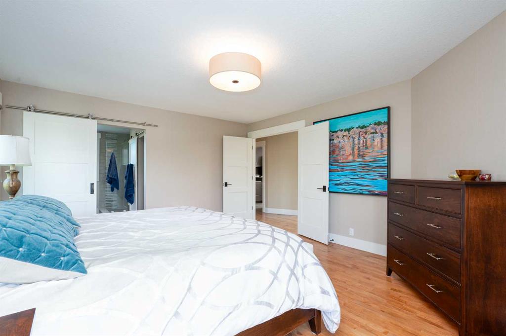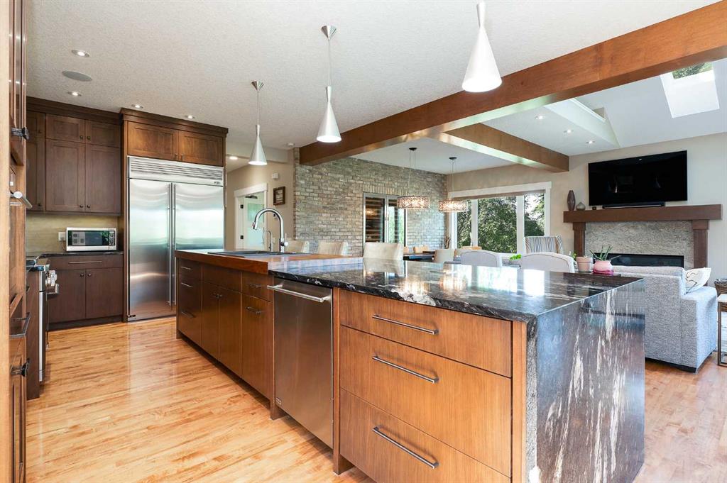 Unprecedented location siding & backing onto picturesque Confederation Park! This gracious 3+1 bedroom home with FULLY DEVELOPED WALK-OUT BASEMENT & over 3800 sq ft of developed living space, underwent a “to the studs” renovation in 2015 & exudes elegance. The open & airy main level is adorned with hardwood floors, showcasing a living room with beamed vaulted ceiling with skylights & feature fireplace. The spacious dining area with brick feature wall & built-in Sub-Zero wine fridge has ample space to host friends & family. The kitchen is discerningly finished with granite counter tops, island/eating bar, plenty of storage space & top of the line stainless steel appliances. A bright private office with built-ins is tucked away just off the foyer & a 2 piece powder room & convenient mudroom complete the main level. The second level with hardwood floors hosts 3 generously sized bedrooms, a 4 piece bath & laundry room equipped with sink & storage. The primary retreat boasts a walk-in closet with in-floor heat & private 4 piece ensuite also with heated floors, dual sinks & oversized shower. The walk-out basement with in-floor heat has access to the patio & is the perfect space for game or movie night, featuring a huge family room with home theatre system plus a games/recreation area complete with bar area including a Kegerator & wine fridge. A fourth bedroom & 4 piece bath with relaxing steam shower are the finishing touches to the basement. Other notable features include dual central air conditioning units, dual high efficiency furnaces (2022), 2 hot water heaters, wired for sound/video, Hunter Douglas blinds throughout & 2 open to below features from second to main level. Outside, enjoy the tranquil Duradeck covered main floor deck with beautiful views of the park & lower patio with paving stones surrounded by Kayu Batu fencing. Parking is a breeze with a double attached garage with heated floor. The premier location can’t be beat, steps from the park with access to walking/biking paths, a ball diamond, tennis courts, golf course & also close to schools, shopping & public transit.