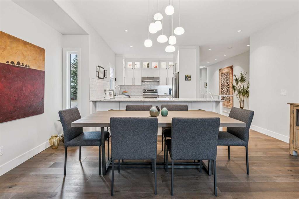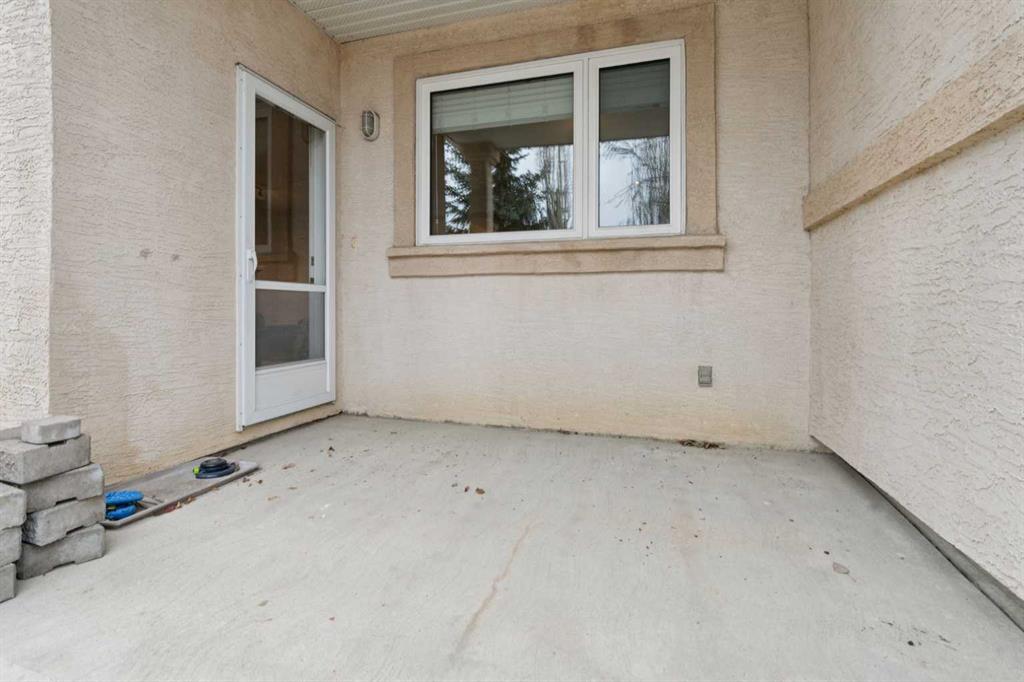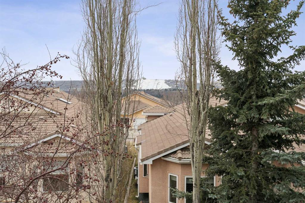 This walkout bungalow sits on a large corner lot in Westchester Pointe Gardens, with views of Canada Olympic Park and mature trees surrounding the property for privacy and shade through the summer. The main floor has 9 foot ceilings with Divine Flooring white oak hardwood running across the level and down the stairs. A newer skylight brightens the foyer, and just off it is an office or den with French doors. The kitchen was fully gutted in 2016 with quartz countertops, full-length upper cabinetry, tile backsplash, an island open to the dining area, and new appliances. The dining area flows into the living room, both sitting under a cathedral ceiling anchored by a large arched window, with a new gas fireplace, south-facing exposure, and a walkout to a deck with an awning and a door with embedded blinds. The primary bedroom has a walk-in closet with pocket door and built-in organizers, and the ensuite has been updated with granite counters, a newer vanity, Moen fixtures, and newer flooring. A powder room with a custom cabinet and decorator sink and a laundry room sit off the garage entry. A glass panel stair railing with painted oak leads down to the walkout lower level. The large rec room has a gas fireplace with updated hearth and tile, built-in bookshelves, and opens to a covered patio. Two good-sized bedrooms sit off the hall along with a four-piece bathroom. Both bedroom windows were structurally enlarged for significantly more natural light. The hall and rec room have vinyl plank flooring and the bedrooms have newer carpet. The big-ticket items have all been handled. PolyB plumbing replaced with PEX on a home run manifold, triple pane windows throughout (2022), high efficiency furnace (2016), newer hot water tank (2024), and an electrically heated double garage with a newer opener. All toilets have been replaced and most light fixtures updated. Additional features include a clay tile roof, upgraded 6 inch gutters, water softener, and central vacuum. Westchester Pointe is a well-managed bare land condo with professional landscaping and snow removal. Walking distance to green space and pathways along the Bow River, five minutes to Canada Olympic Park, and quick access to Crowfoot Crossing, the LRT, Stoney Trail, and Highway 1 to the mountains.