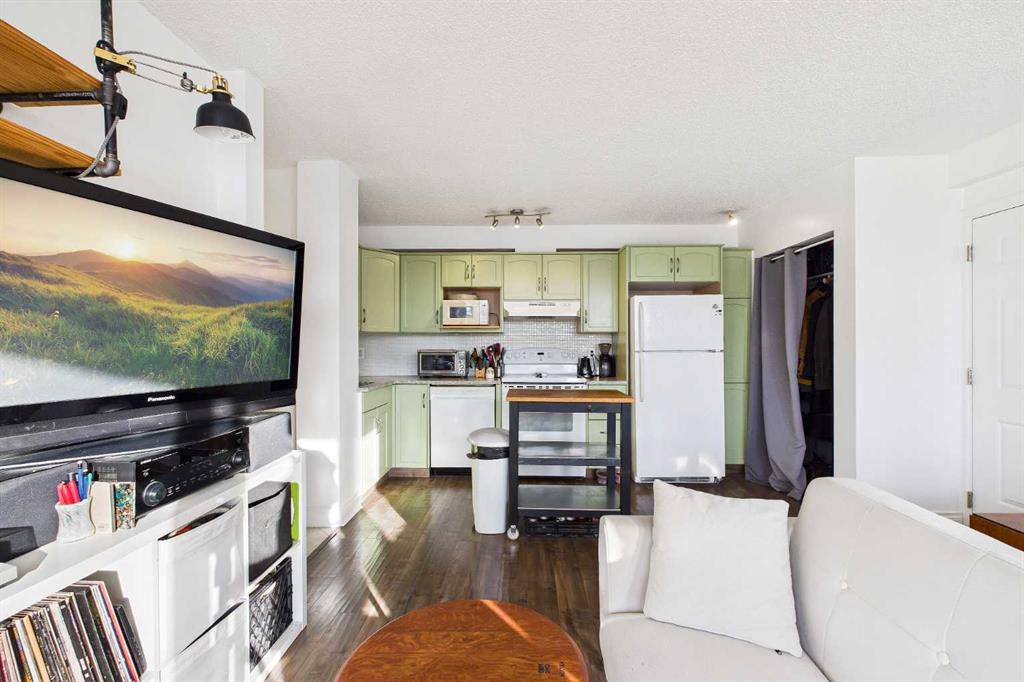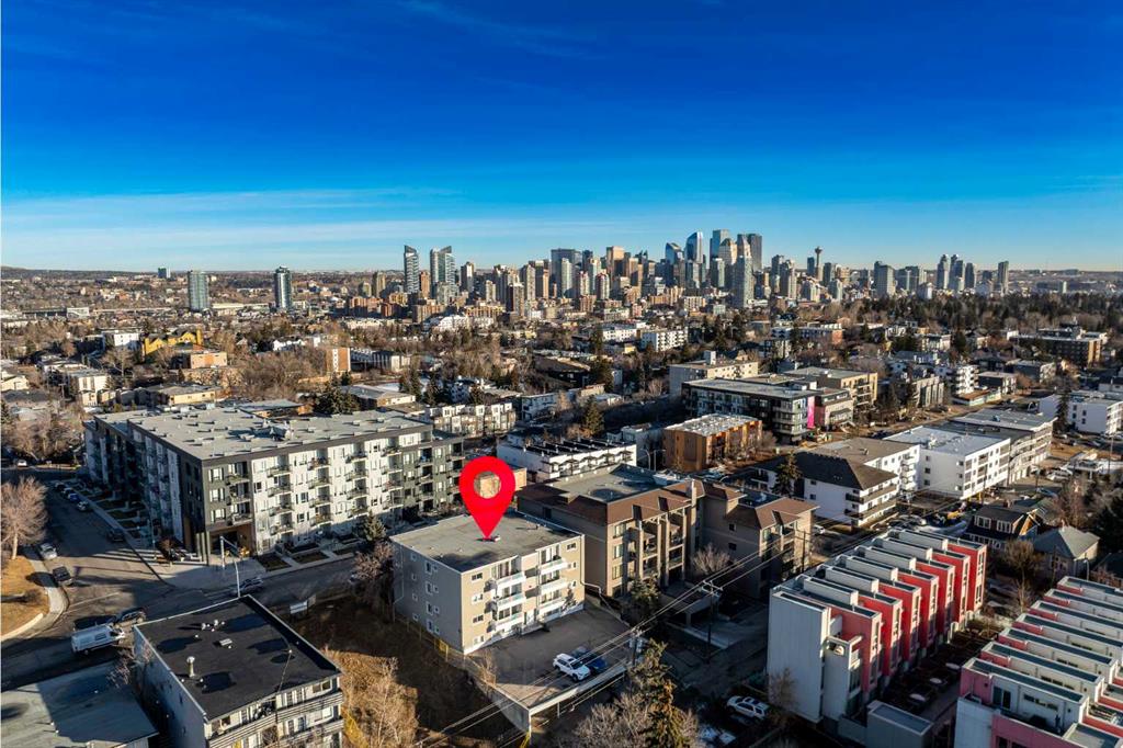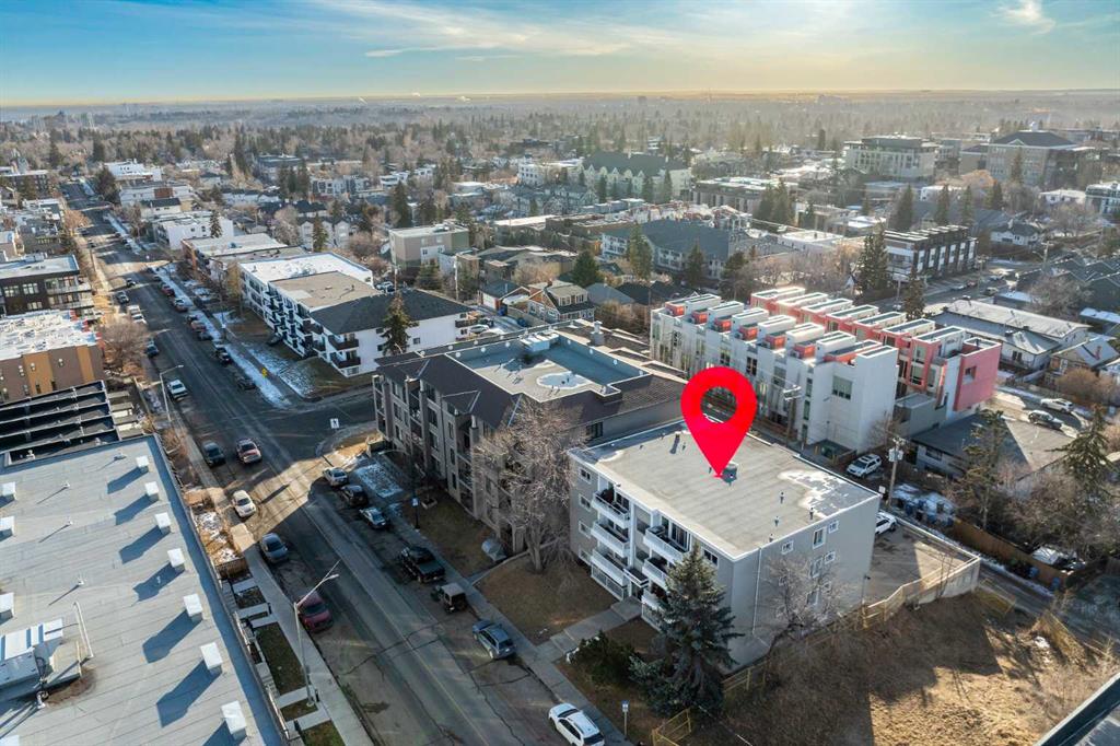 Welcome to the “AURORA PLACE“ this adorable one-bedroom condo perfectly situated just steps from the vibrant shops, cafés, and restaurants of 17th Avenue. This inviting home blends comfort and convenience and affordable condo fees making it ideal for first-time buyers, professionals, or anyone looking to enjoy an urban lifestyle without sacrificing coziness. Inside, the thoughtfully designed layout offers a bright and functional living space featuring hand-scraped laminate floors, a trendy yet spacious kitchen with mint green cabinets, lots of counter space, updated backsplash, a movable island and additional storage across the top of the cabinets if needed. The flexibility of the open concept layout flows seamlessly together offering a cozy living room and still room for a dining table if desired. The whole main living space is accented with a large south-facing balcony, where you can soak up sunshine all day long and perfect for a morning coffee or relaxing evenings. Large windows flood the space with natural light, creating a warm and welcoming atmosphere throughout. Adding to the convenience, this home comes with in-suite laundry for everyday ease, a spacious primary bedroom and 4 piece bathroom. Additional highlights include a separate storage and a dedicated parking stall eliminating the stress of inner-city parking, and a well-maintained building in a highly desirable location. With transit, parks, nightlife, and daily amenities just moments away, this charming condo offers the best of city living in a space that truly feels like home. Most pets are allowed with board approval, however dogs are not allowed.